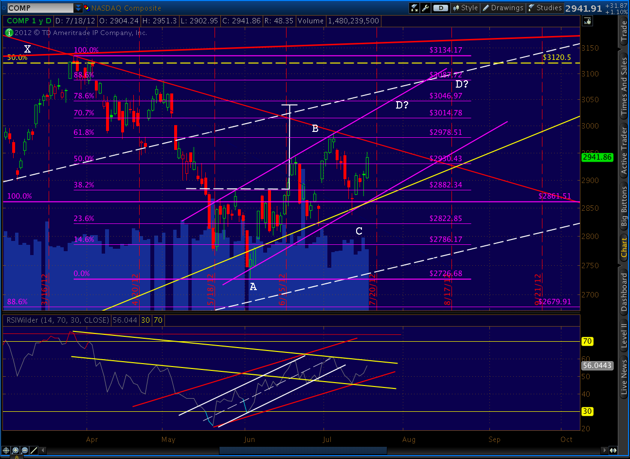 When we last left off on July 2, COMP was pointed toward a forecast of 3044 — the .886 retracement of the most recent decline from 3085 to 2726. Since then, the slightly larger pattern has begun to look more well-formed; that is, the drop from 3134 to 2726. This puts a Point B very close to the .618 on July 5.