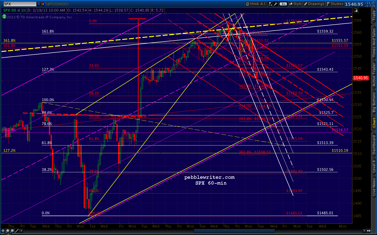 The next most significant support is the nexus of the red 1.618 (1536.73), the red .382 retracement of the 1485 – 1563 rally (1533.59) and the next lower purple channel line — currently about 1535. That makes our next target range 1533-1535; but let’s expand it to 1530-1535 to include the last significant top from Feb 20.