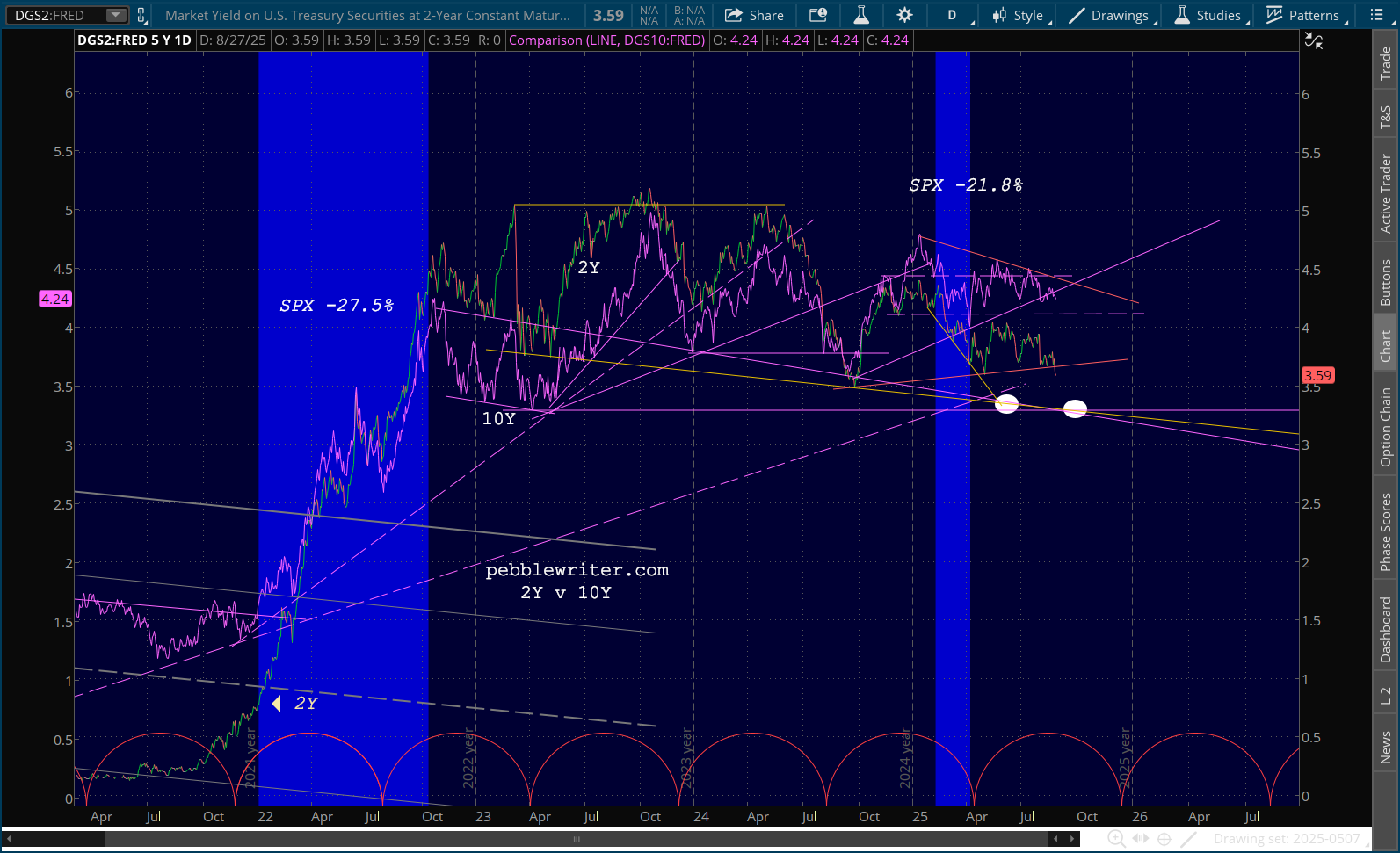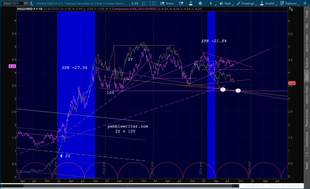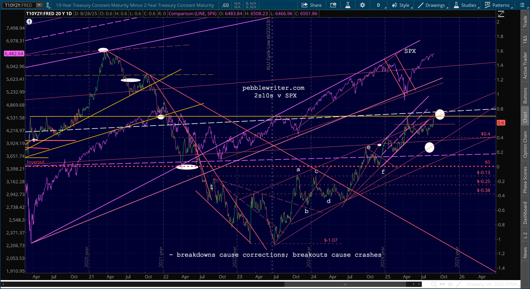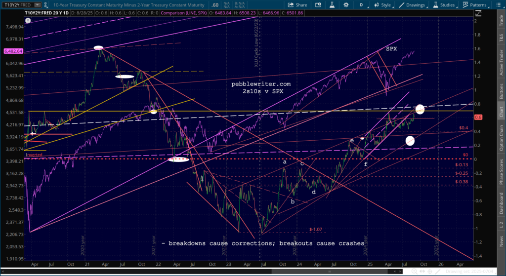 Meanwhile, note that the 2Y is breaking down – unlike the 10Y. If this trend continues, it’ll put upward pressure on the 2s10s at a time when SPX is bumping up against overhead resistance.