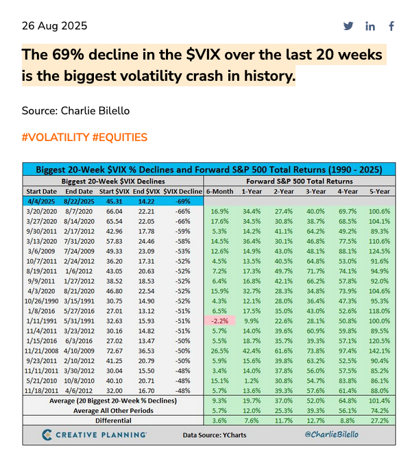 VIX continues its slide. Some reports have it falling by the greatest percentage YTD ever. I’ll check on this.