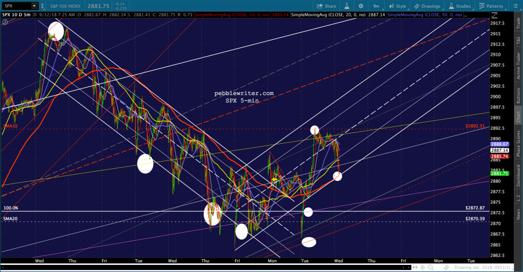 VIX is still bouncing, which is forcing SPX below its SMA5 200. The next support lower is the same as last week: the January highs at 2872.87. Also a repeat of last week: ES will reach its Jan high much sooner than SPX.
