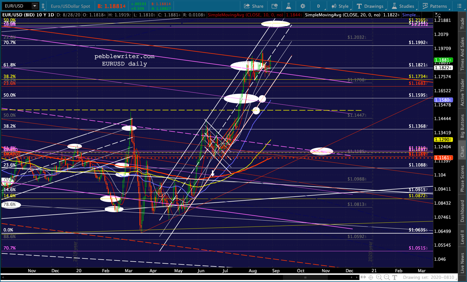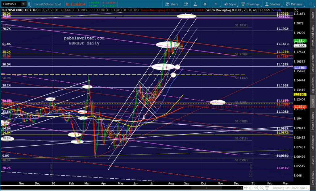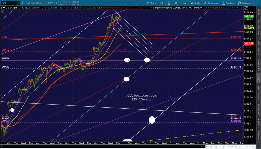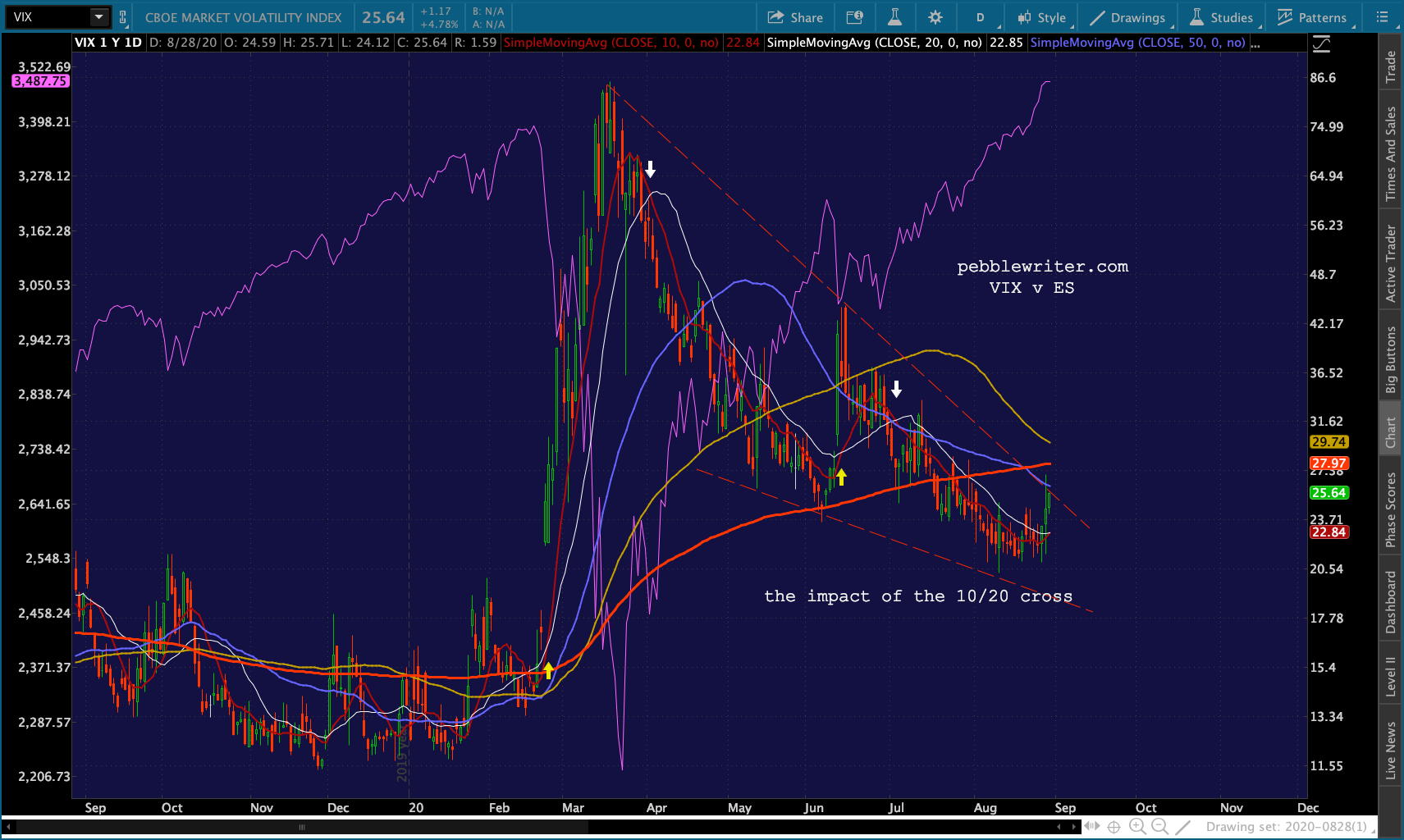 A 16.4% hammering for VIX, an unwinding of its bullish (bearish for stocks) 10/20 cross, and SPX/ES broke out of the little falling channels they were in for a gain on the day. It’s SPX’s 7th straight daily gain, 5th straight weekly gain and 5th straight monthly gain. So far, it’s the best August since 1986 when, as I recall, there was no pandemic to reckon with. But, no bubble here. No siree.