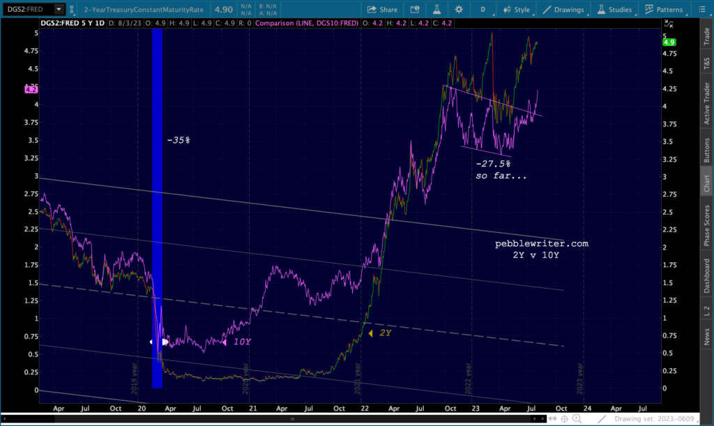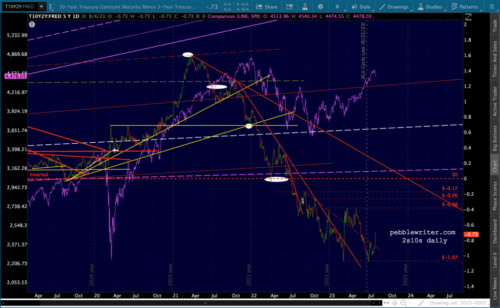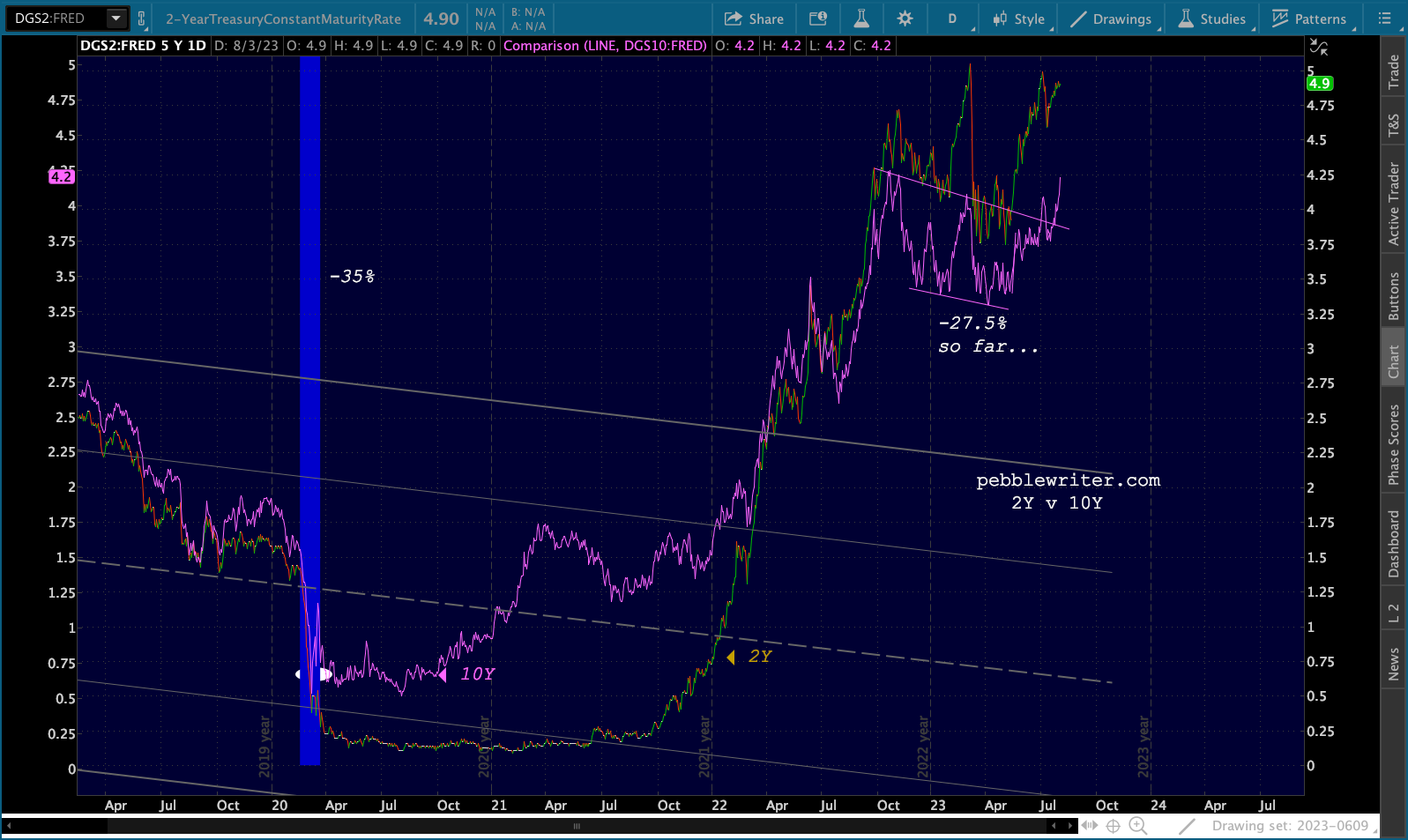 But, because the 2Y is stalling, the 2s10s broke through the TL of resistance and has a shot at making some headway – bearish for stocks.