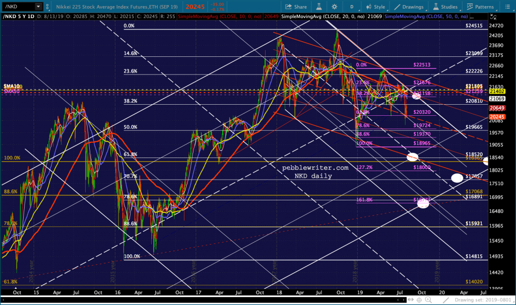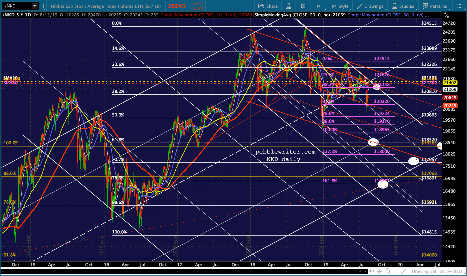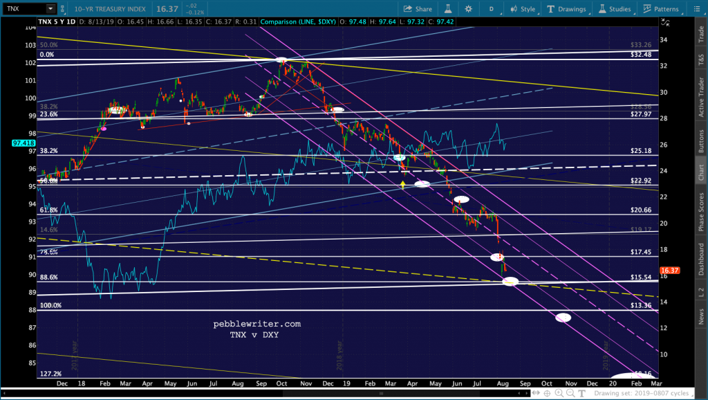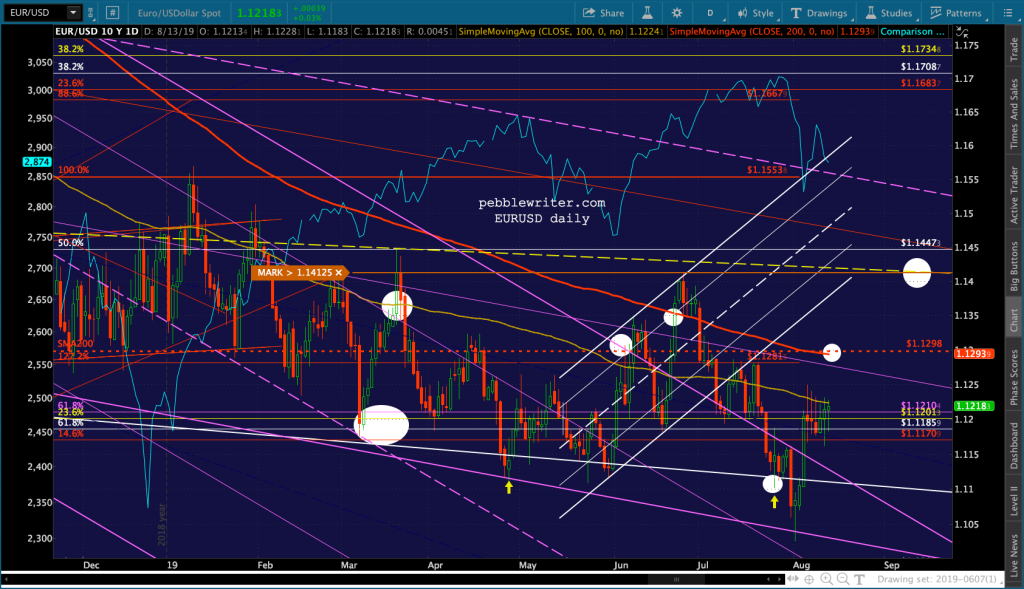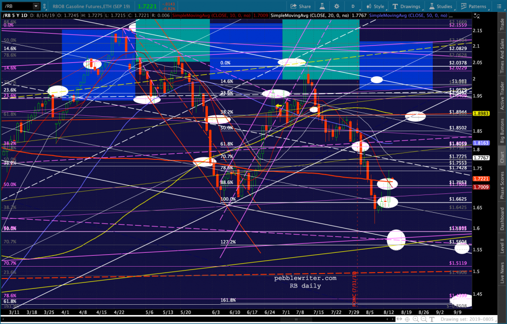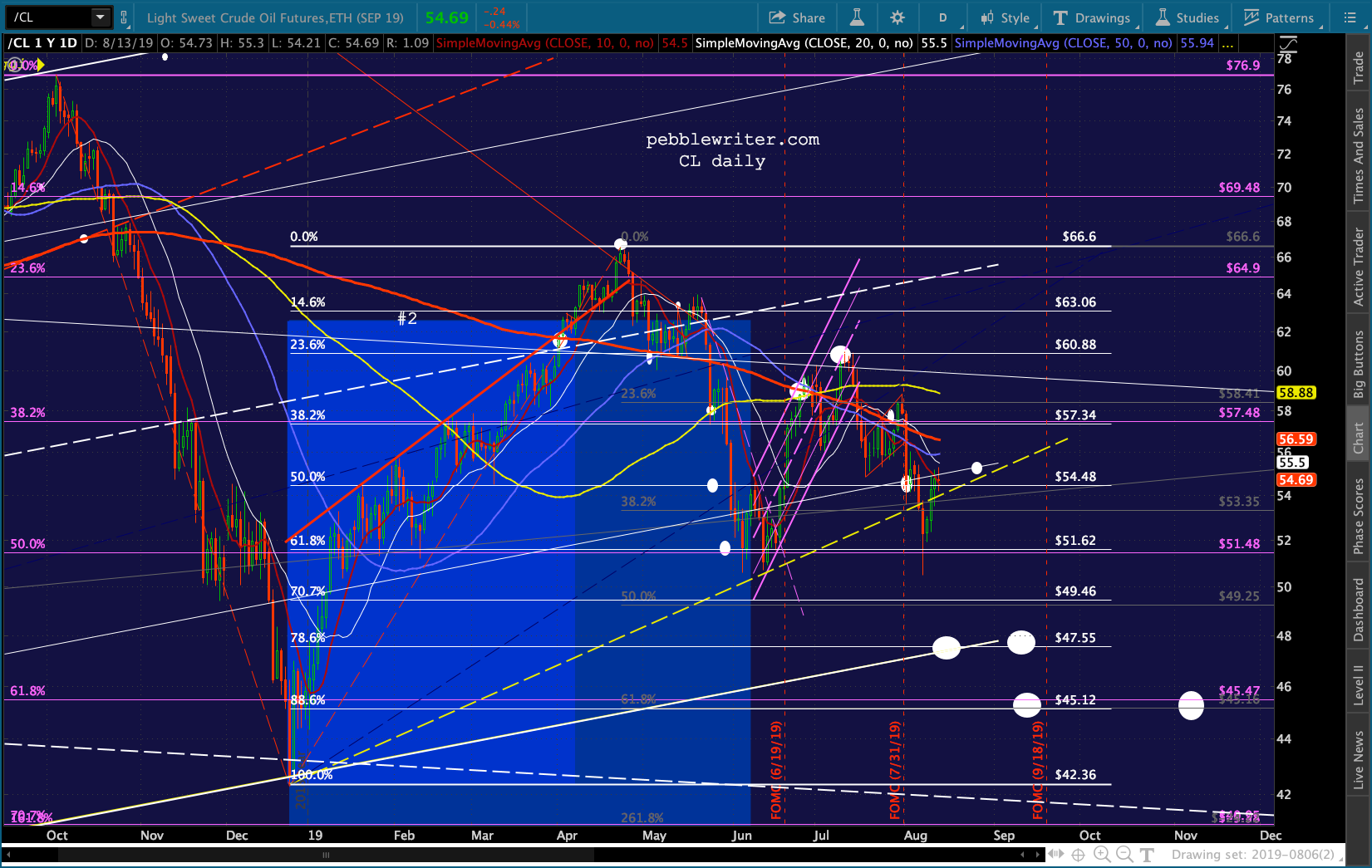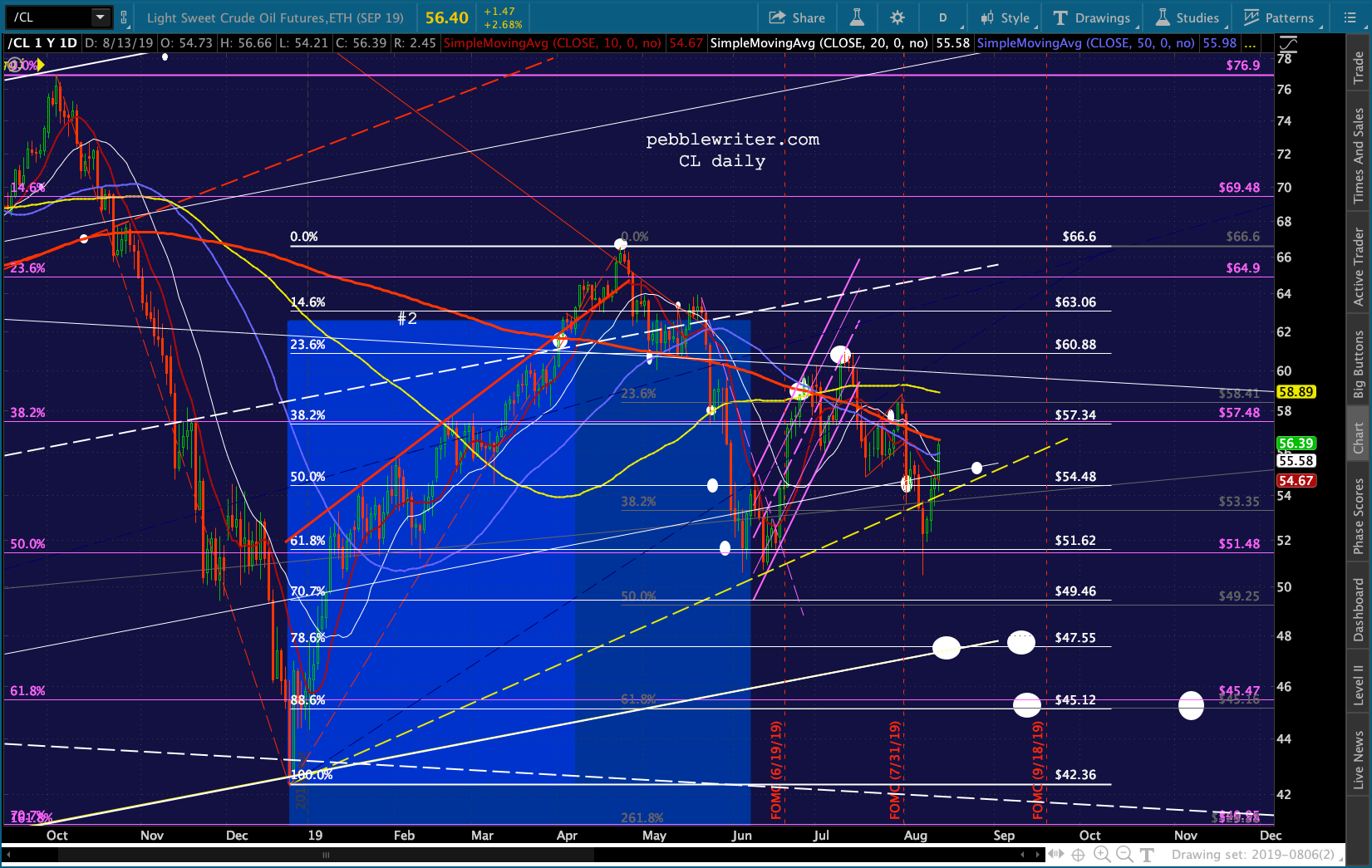 Here are the charts I was in the process of posting before the news hit that the Sep 1 additional tariffs would be delayed until December 15. CL was still backtesting the .236 channel line and CL was going nowhere, positioning itself for the next leg down.