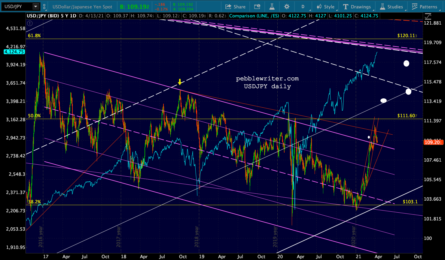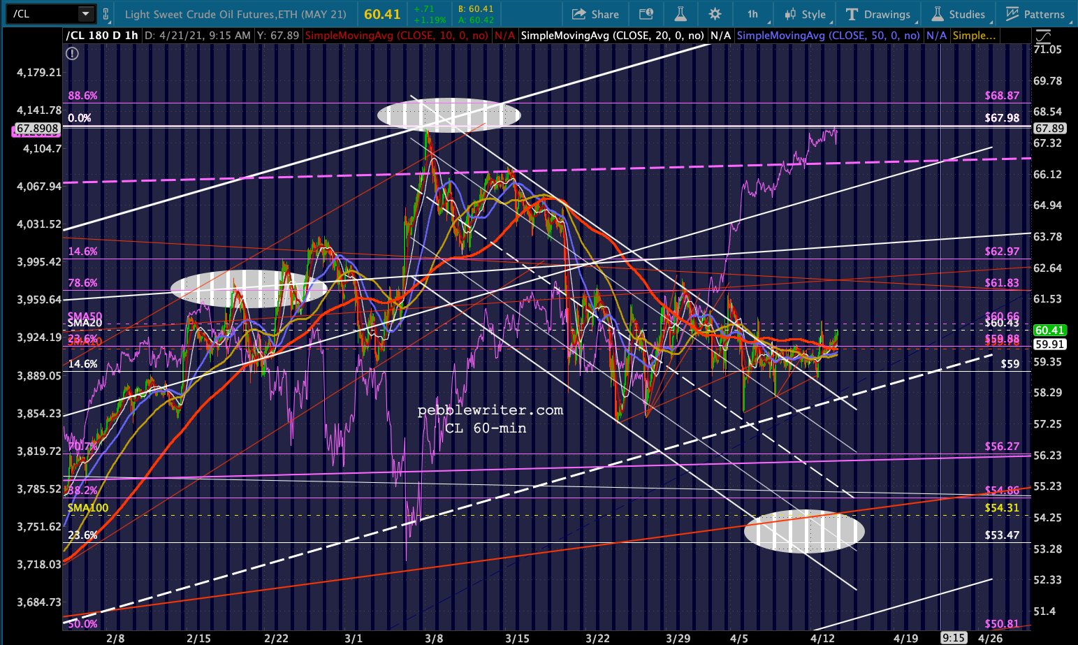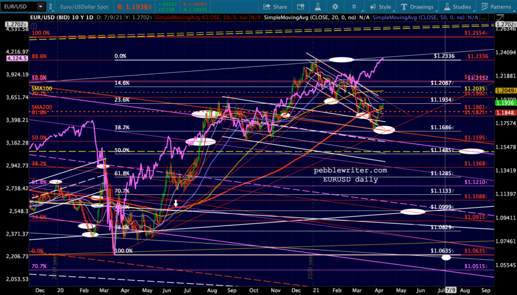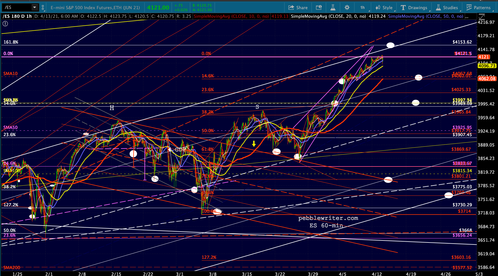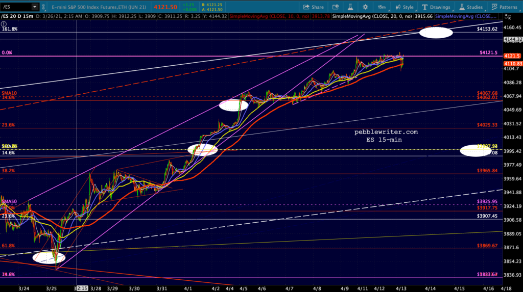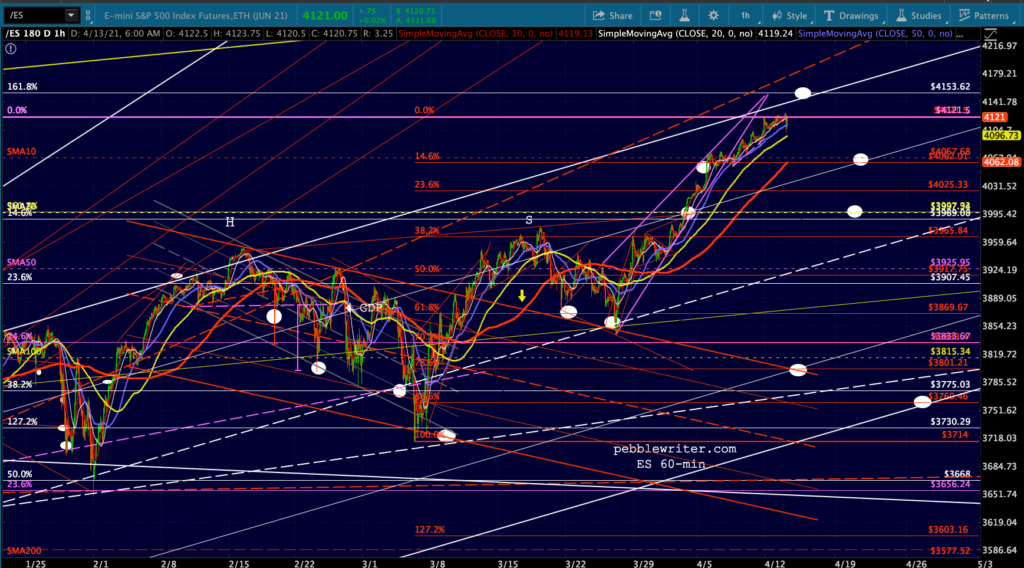 …futures’ reaction to the JNJ vaccine woes has been “fixed.” Back to even on the day, still within striking distance of the 1.618 Fib – but still eyeing a 3.618 backtest.