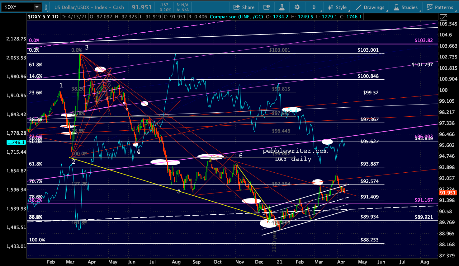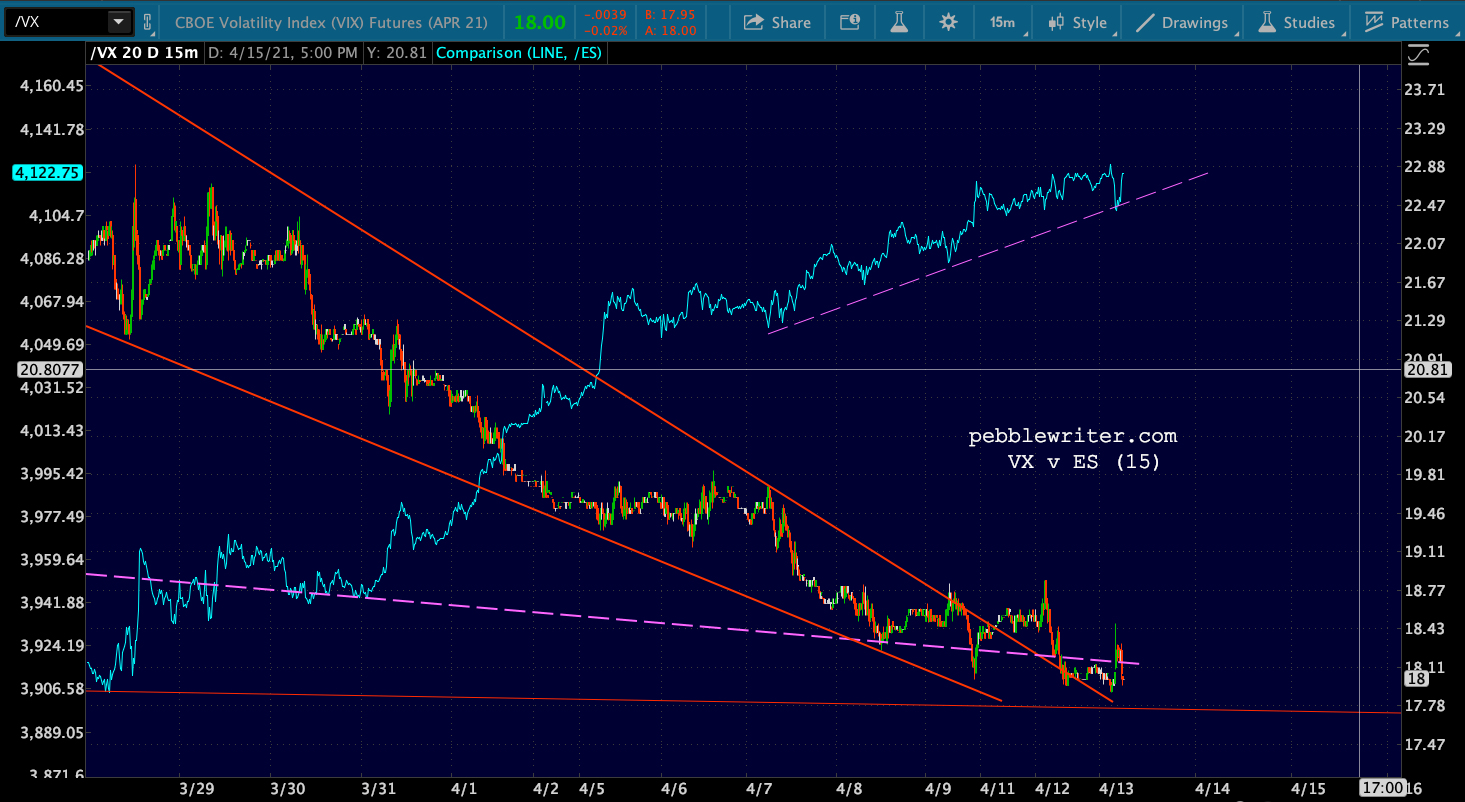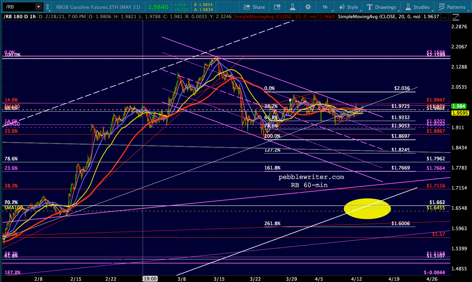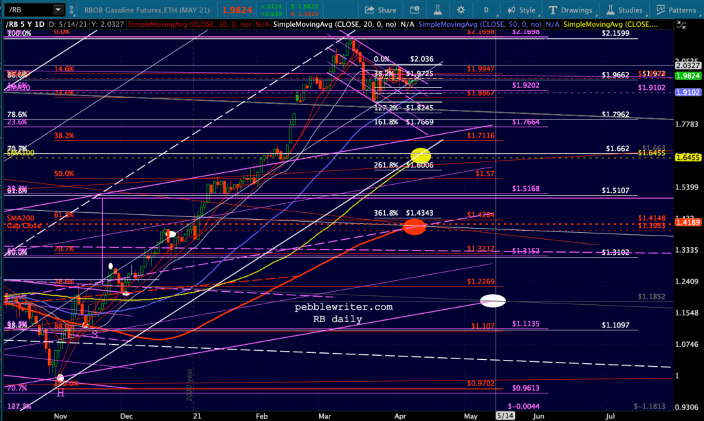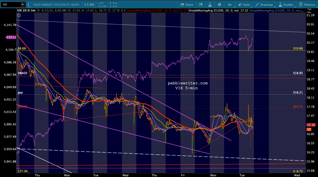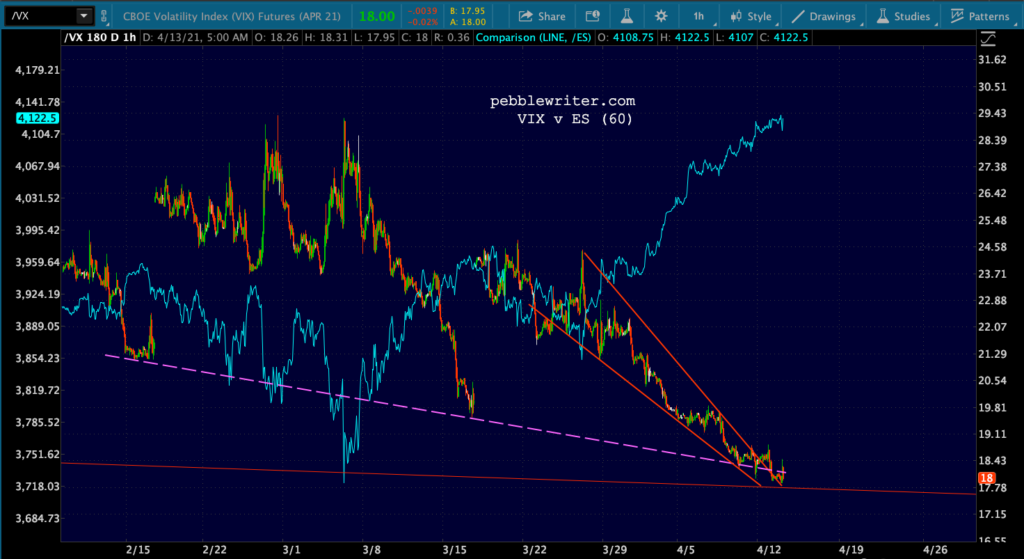…futures’ reaction to the JNJ vaccine woes has been “fixed.” Back to even on the day, still within striking distance of the 1.618 Fib – but still eyeing a 3.618 backtest.