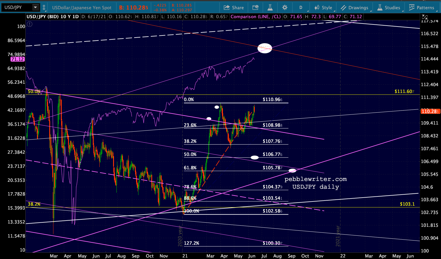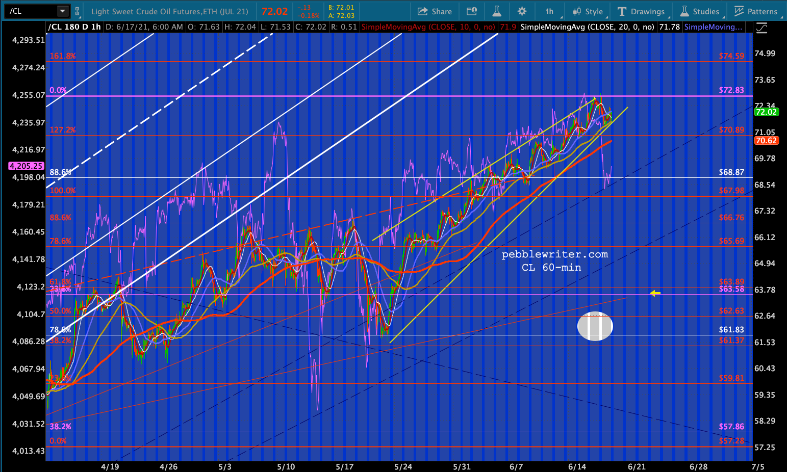 In the bears’ favor, CL’s rising wedge has broken down and is backtesting.