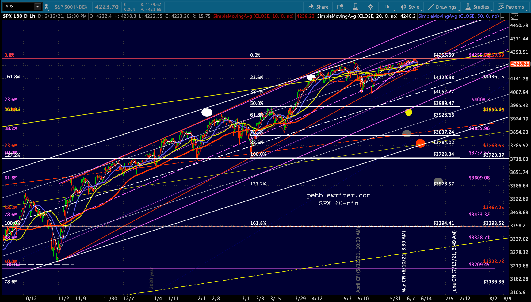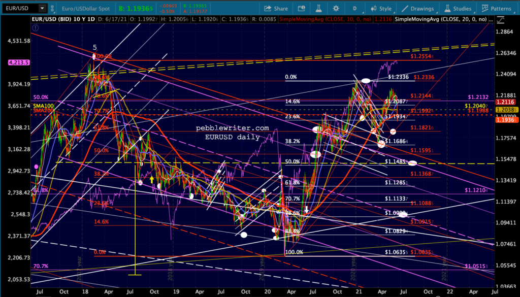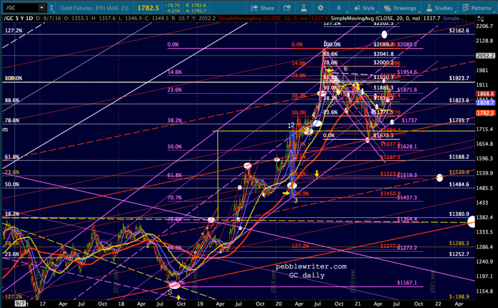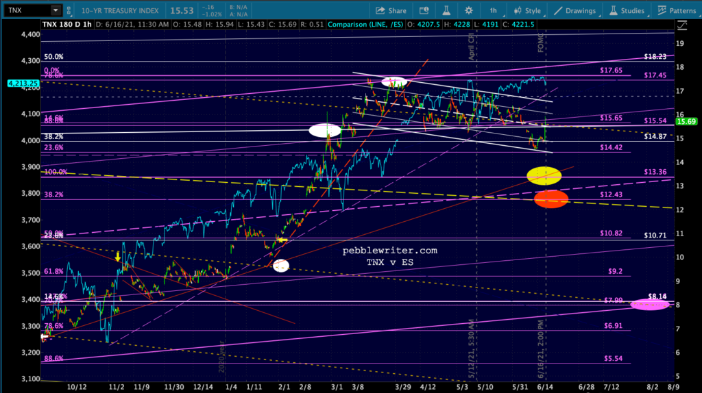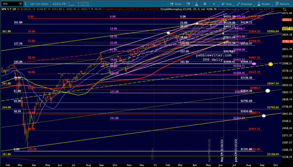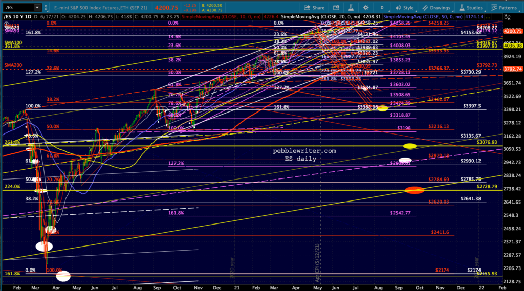First, let’s look at the big picture for ES/SPX. Note that SPX’s rising wedge hasn’t yet broken down (the red TL.) I suspect it will and either the white or purple channel will ultimately flesh out.