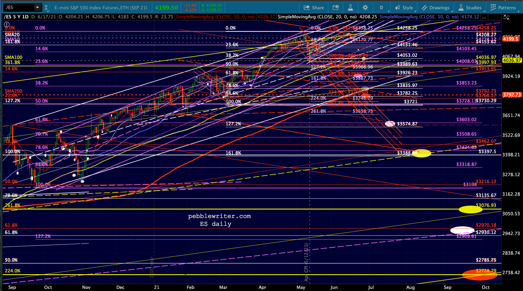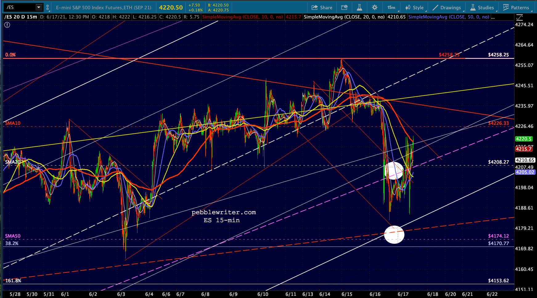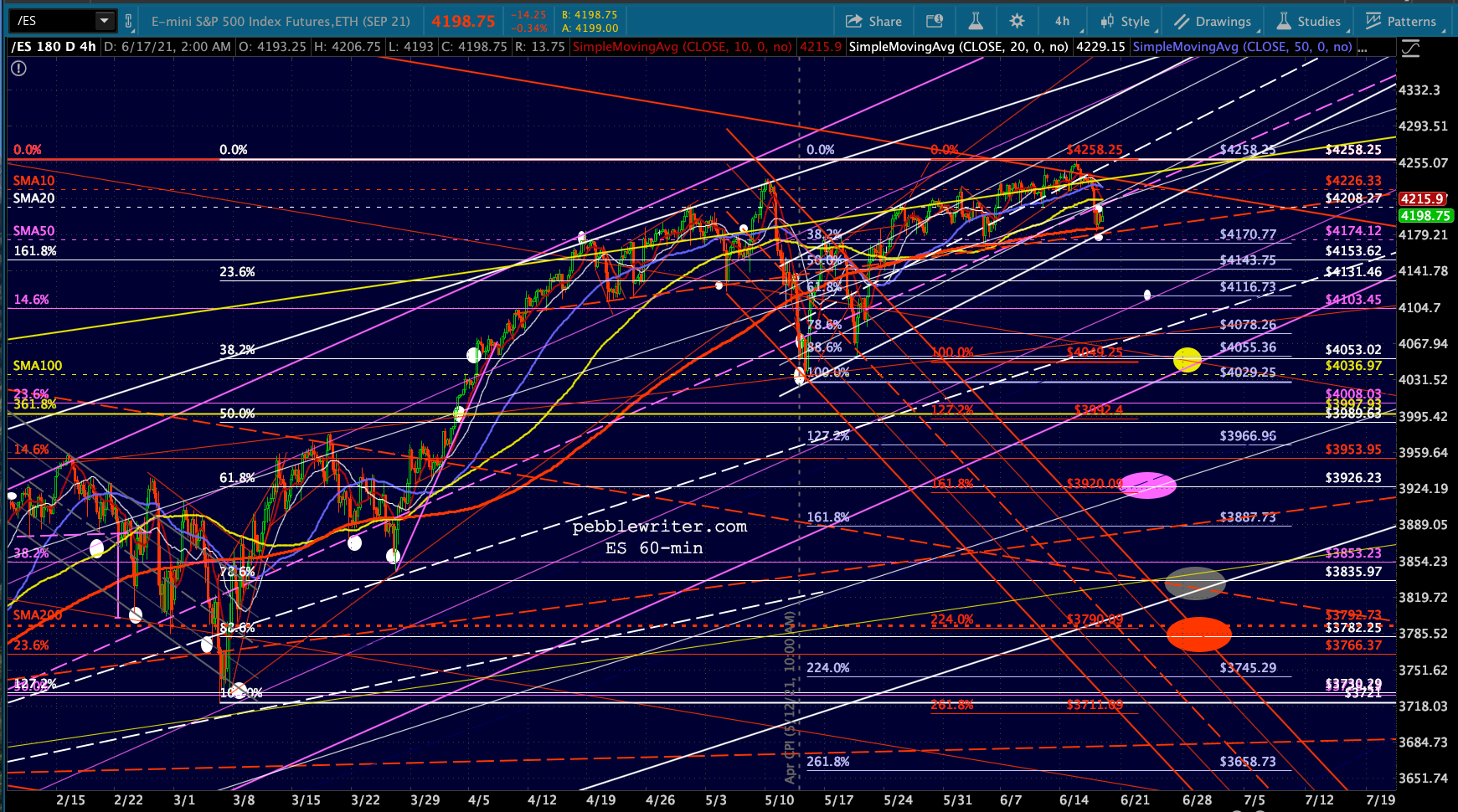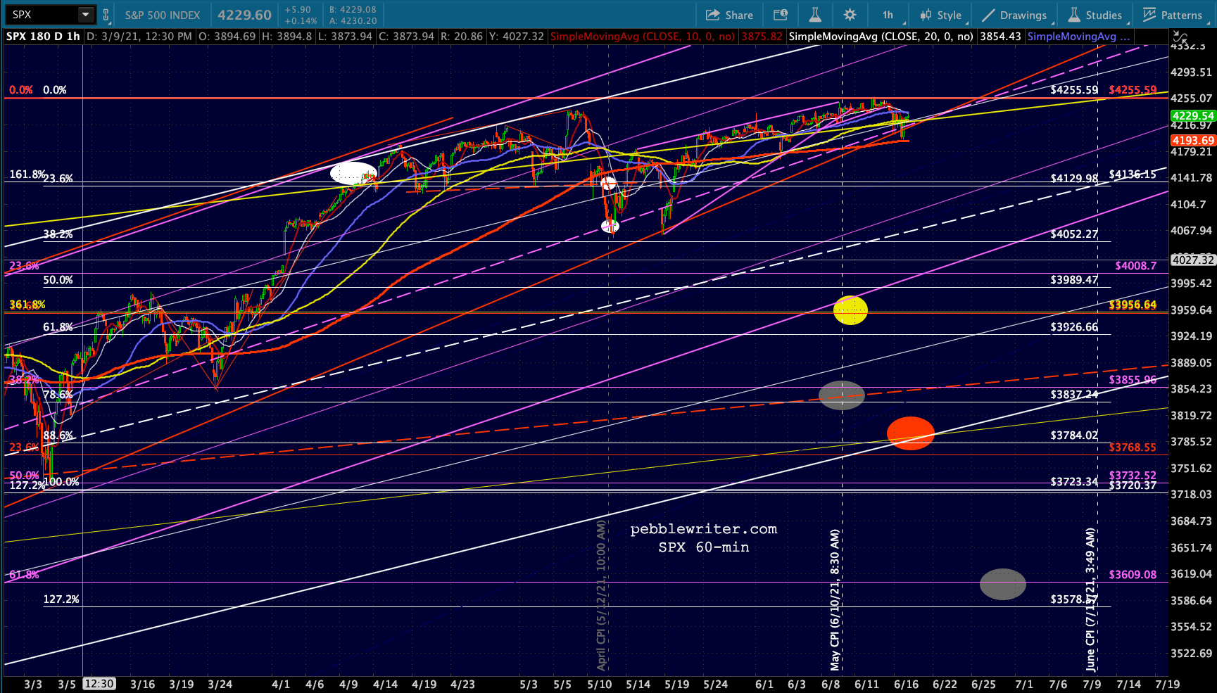 First, let’s look at the big picture for ES/SPX. Note that SPX’s rising wedge hasn’t yet broken down (the red TL.) I suspect it will and either the white or purple channel will ultimately flesh out.