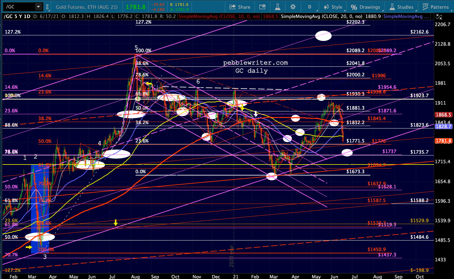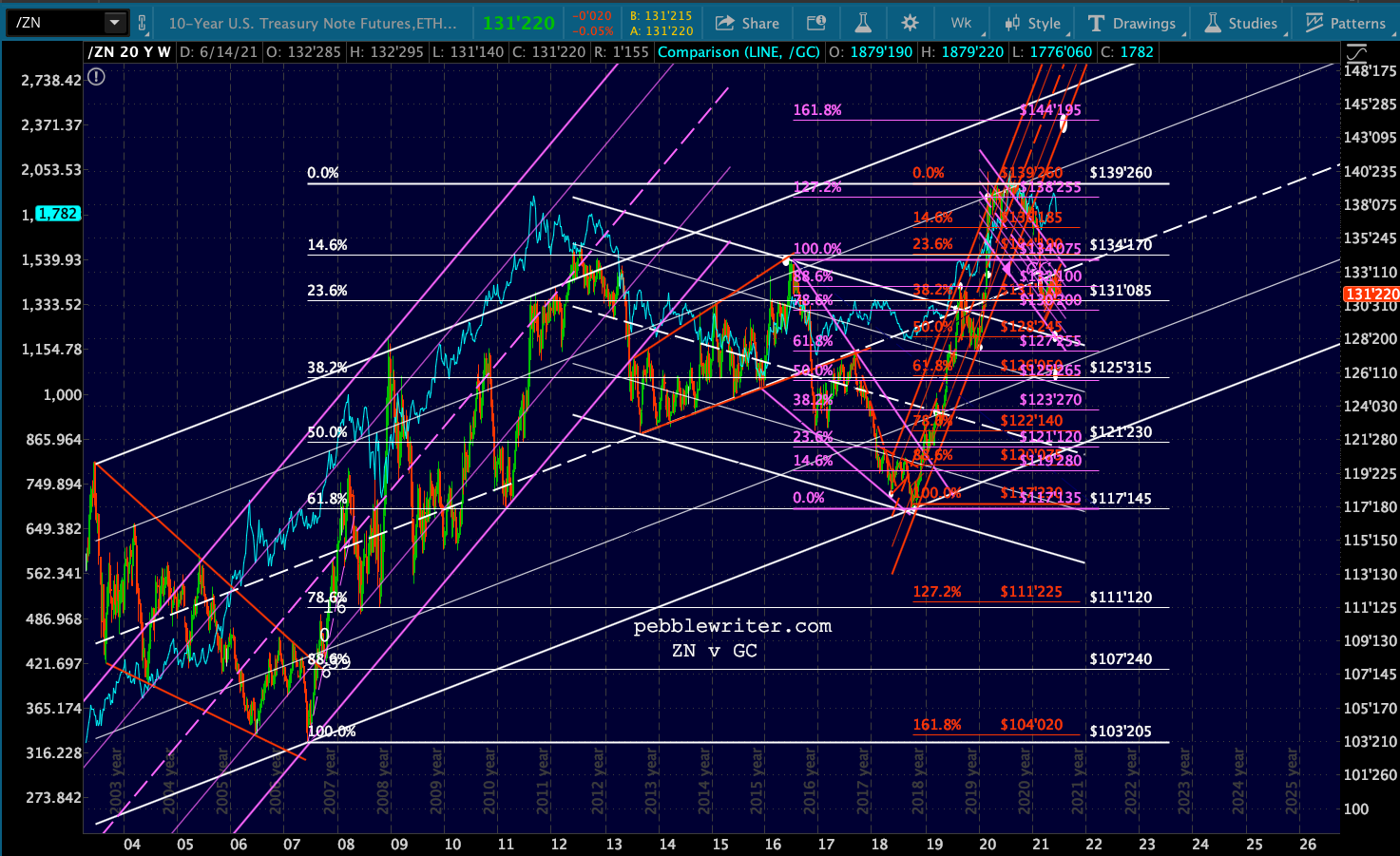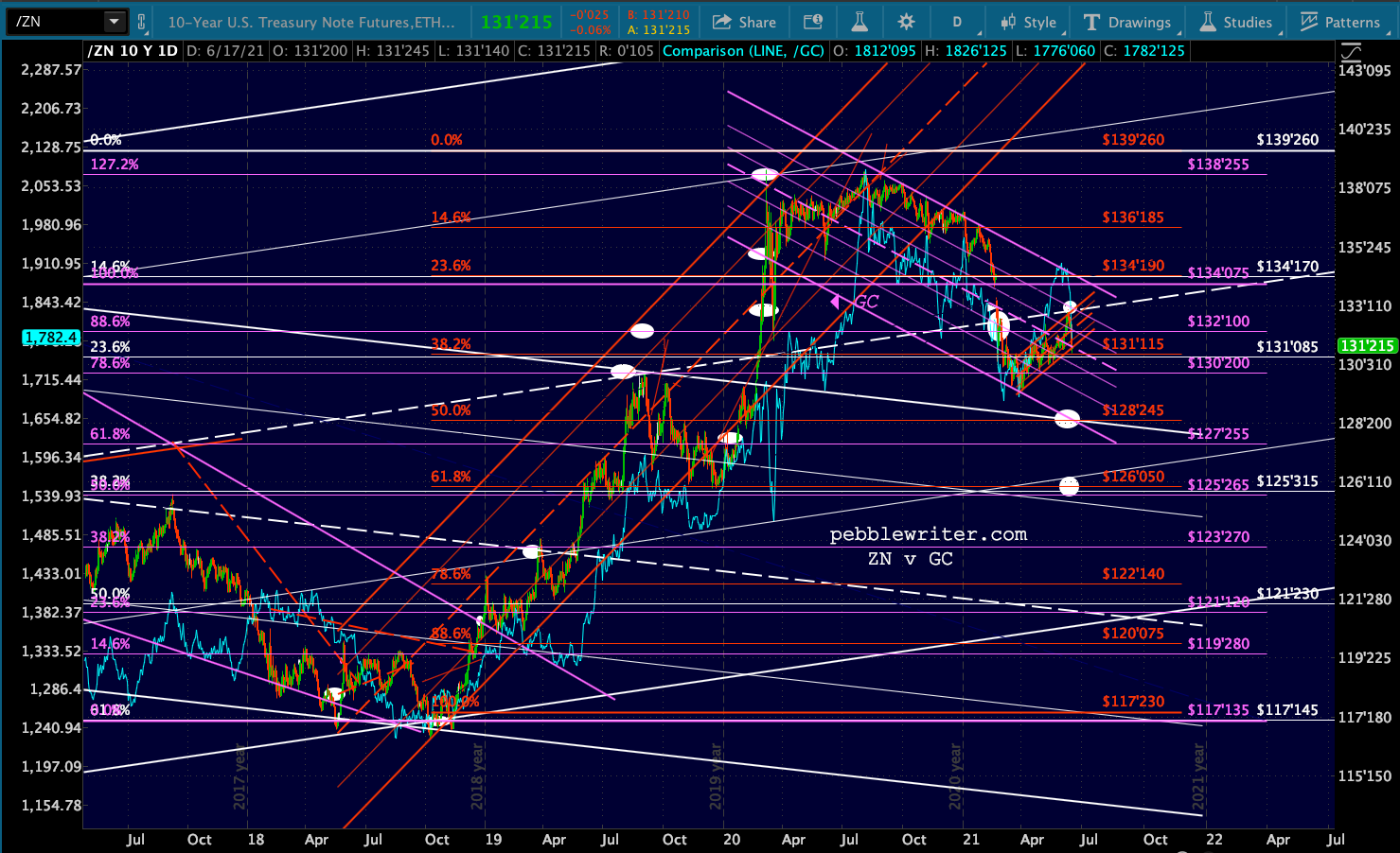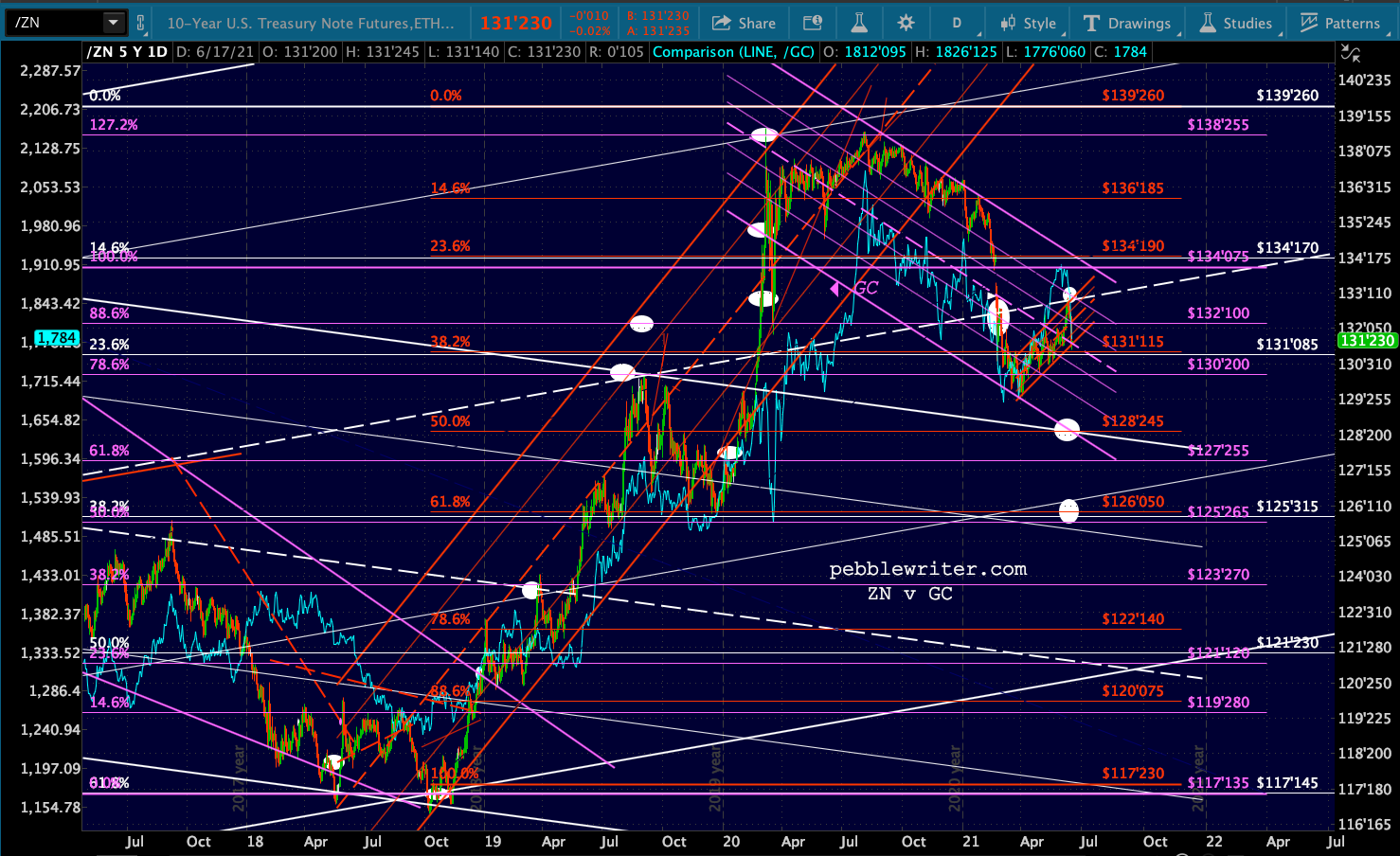And, because the relationship between ZN and GC is on again, let’s take a look at gold’s breakdown. It’s getting very close to another test of the purple channel bottom.