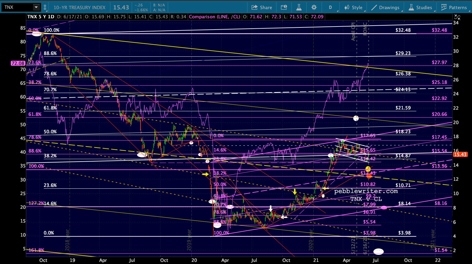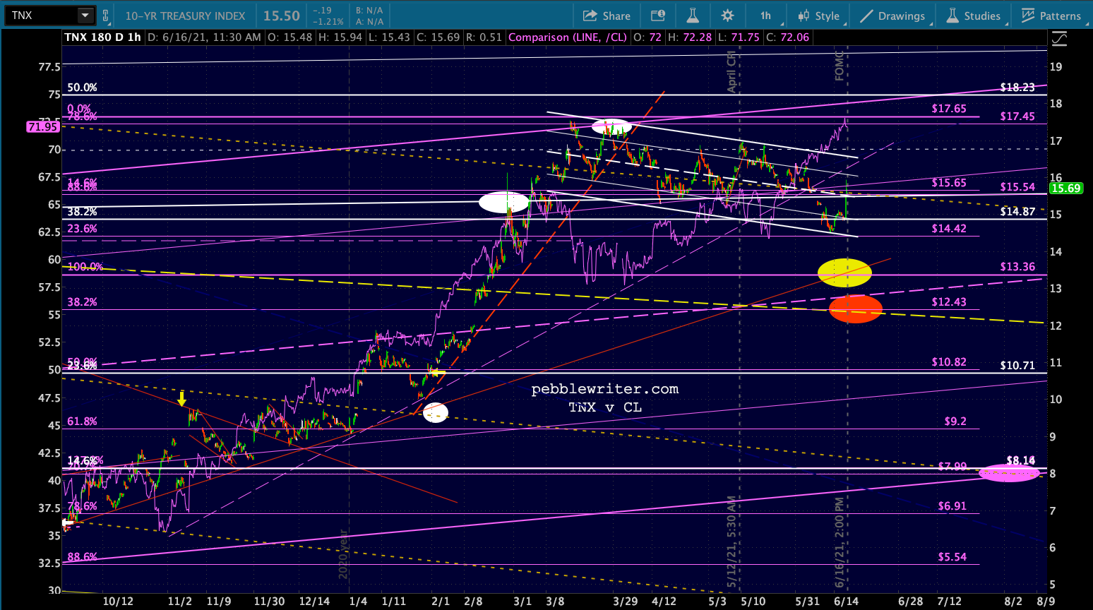A quick look at the bond market. The 10Y popped a bit on the dot plot shift, but have stalled out at channel line resistance. The next move should be lower, particularly if/when CL breaks down.