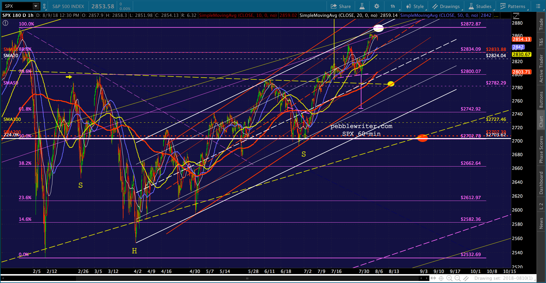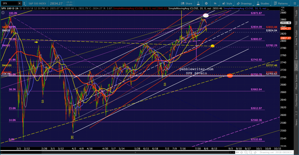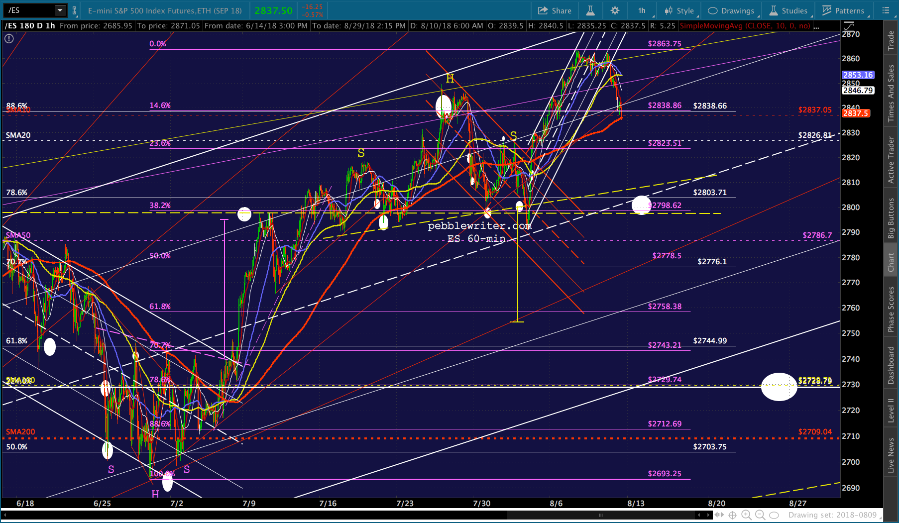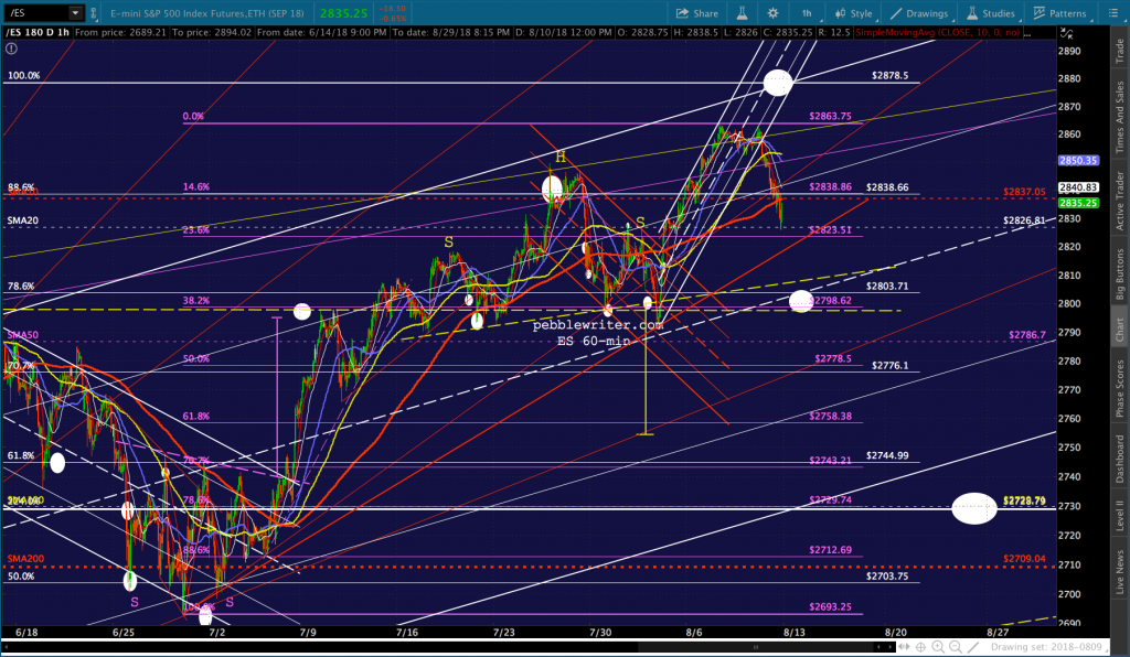 Futures are currently off about 17 points. If the SMA10 and .886 can’t hold the backtest, we could see ES backtest the busted neckline or .786 at around 2803 – 2810.