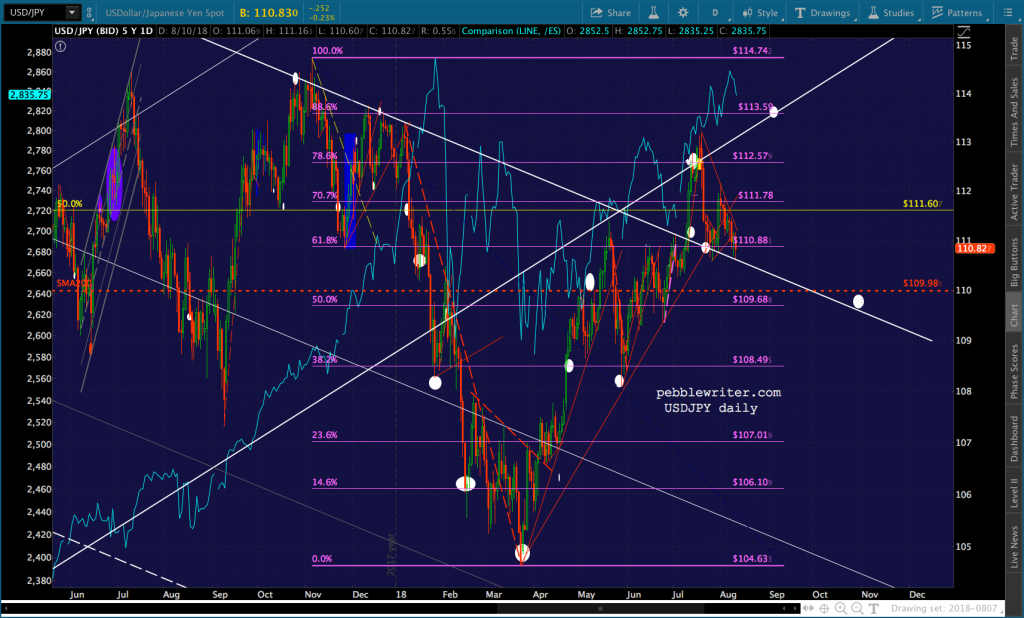 The turmoil is spilling over into the yen, which is strengthening against the dollar and doing a number on equities. If the USDJPY drops back into the falling white channel it recently broke out of, it will make for a big mess for stocks.