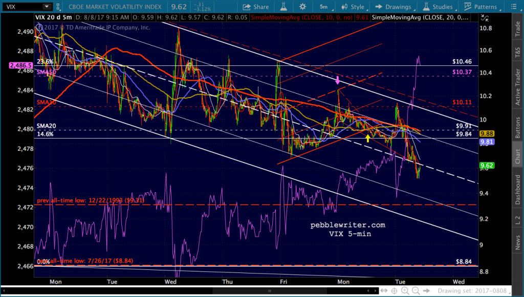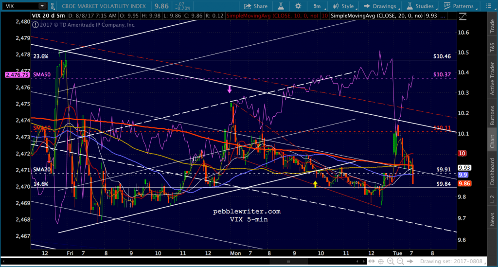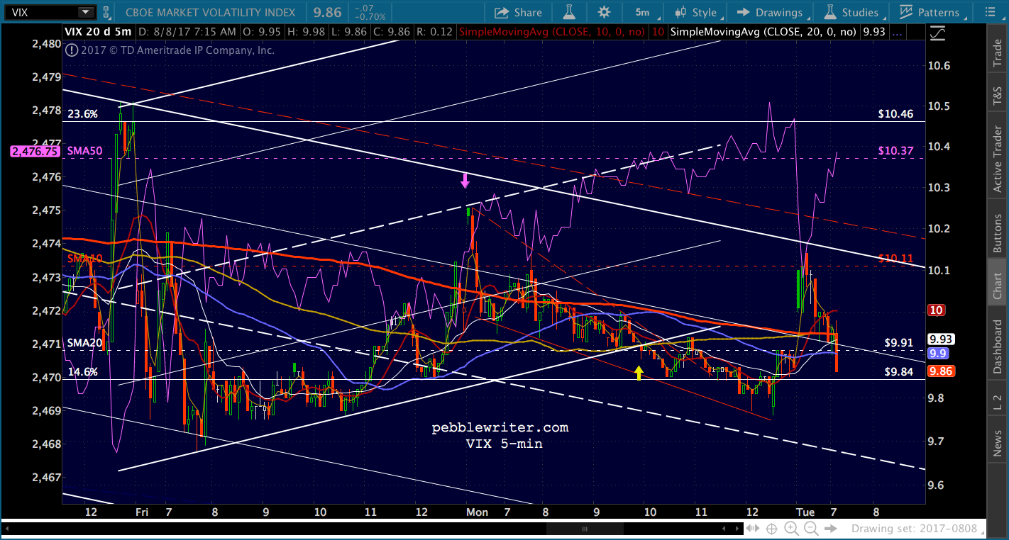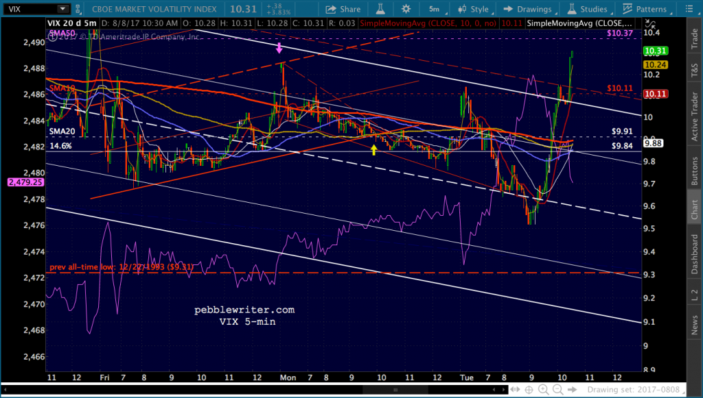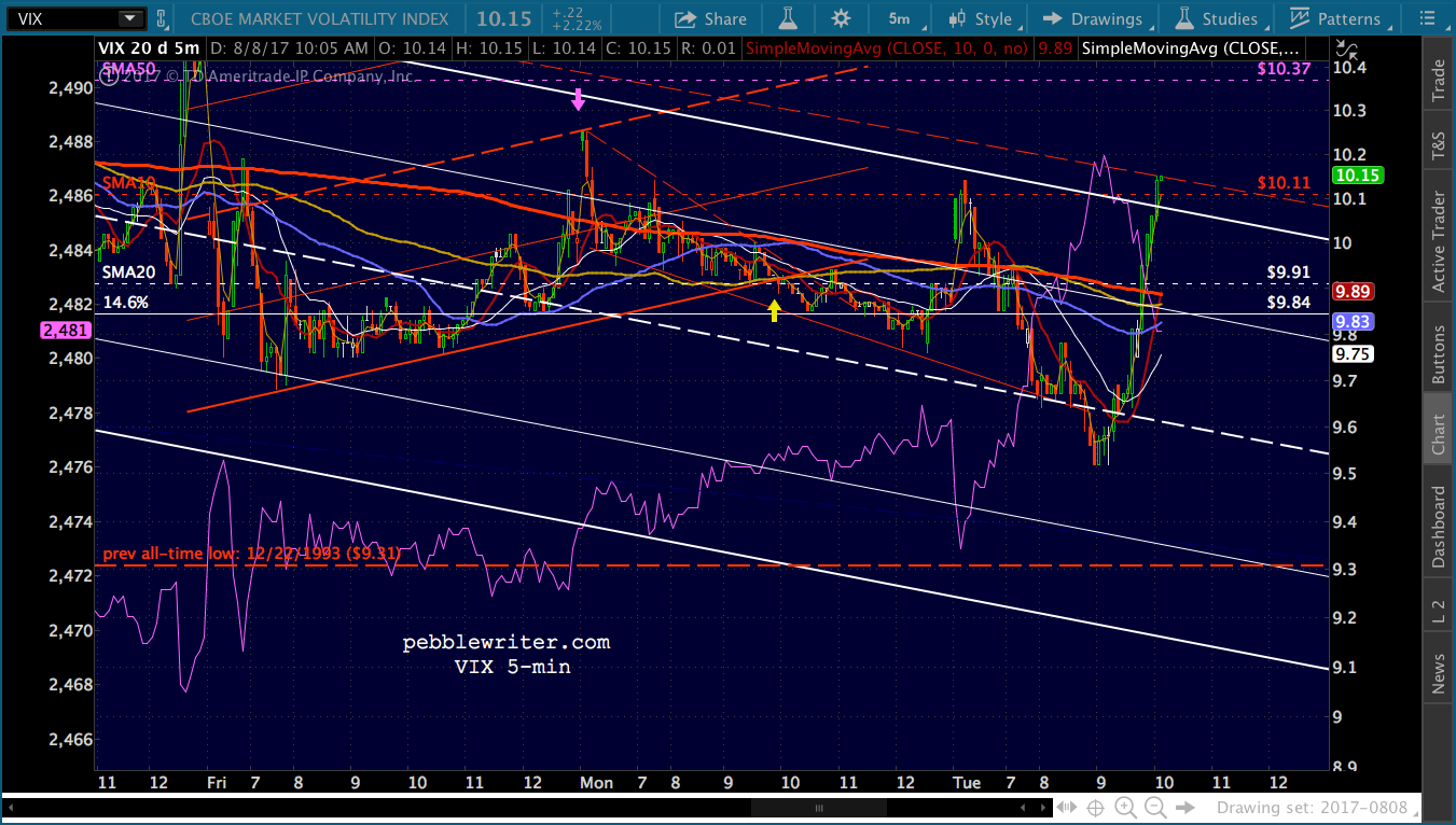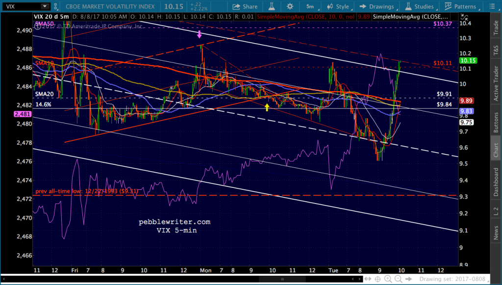 Moments ago, VIX dropped through the SMA10. It has now dropped through the white channel top in an effort to keep SPX north of the SMA5 100 and purple channel midline. Assuming it’ll keep going, and send SPX higher again. I’d cover here, even though there is clearly plenty of selling pressure out there.