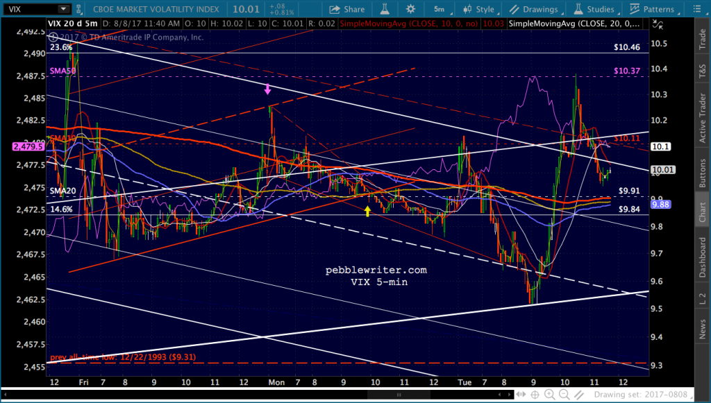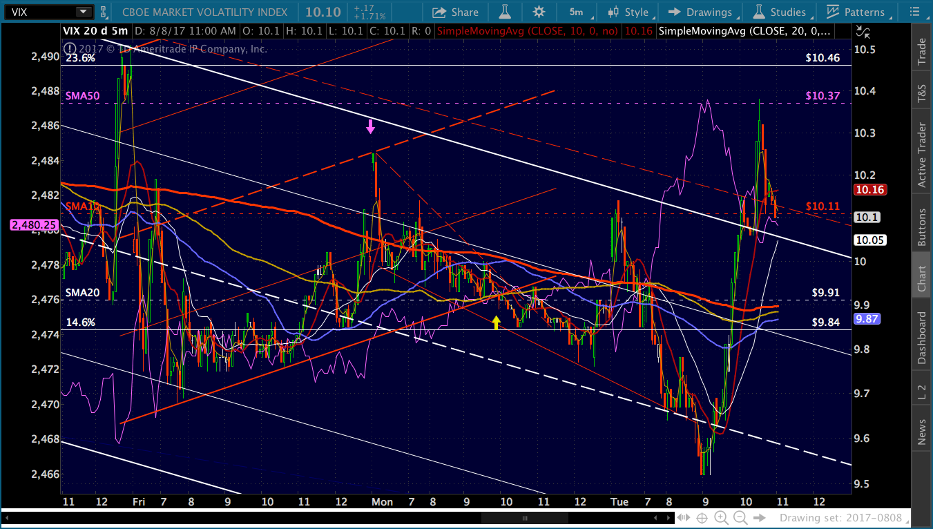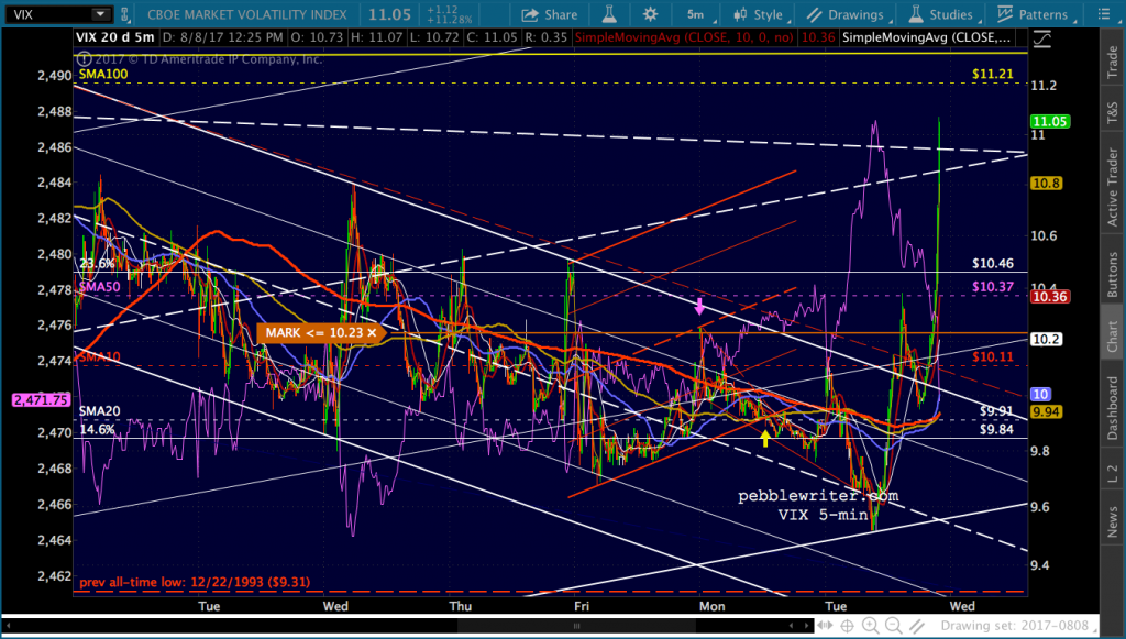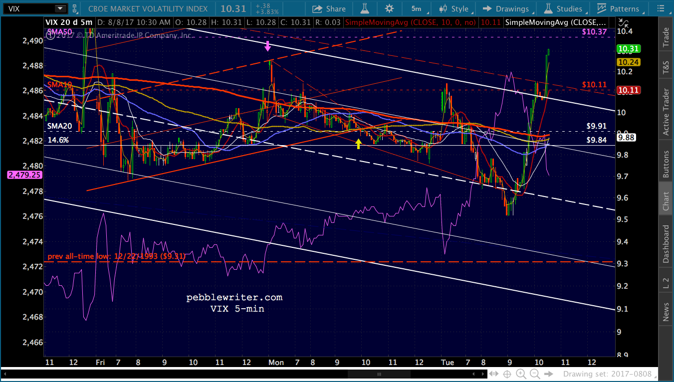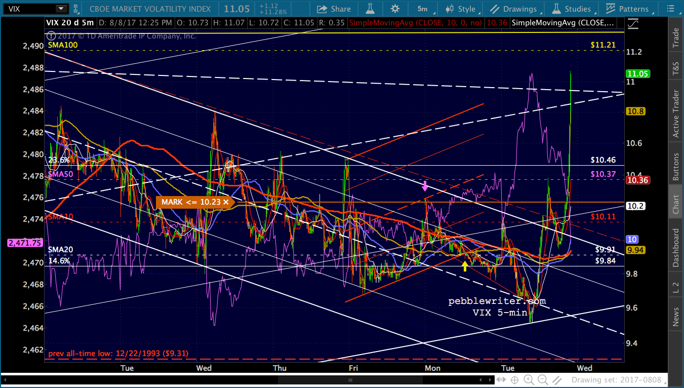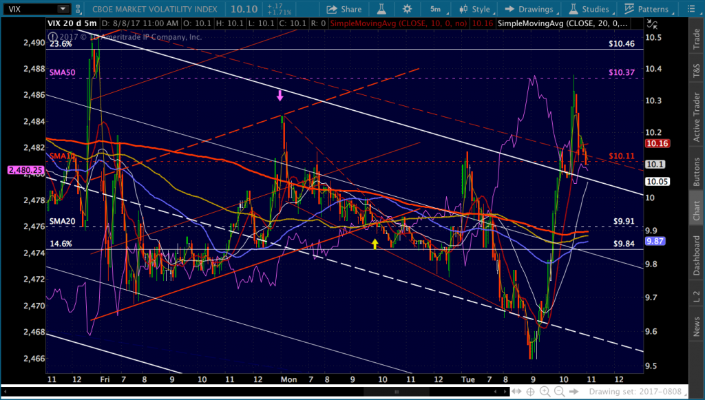 Moments ago, VIX dropped through the SMA10. It has now dropped through the white channel top in an effort to keep SPX north of the SMA5 100 and purple channel midline. Assuming it’ll keep going, and send SPX higher again. I’d cover here, even though there is clearly plenty of selling pressure out there.