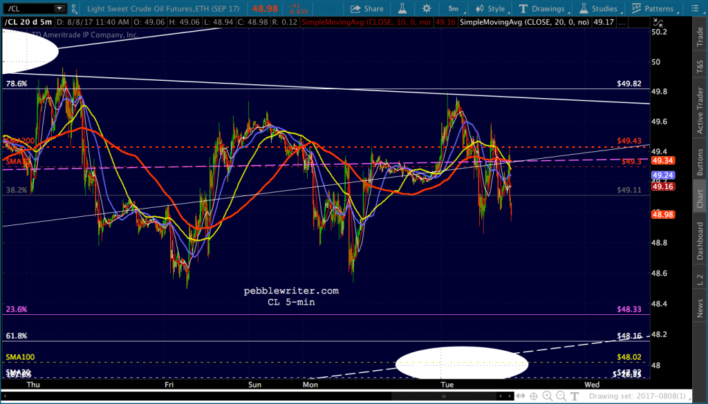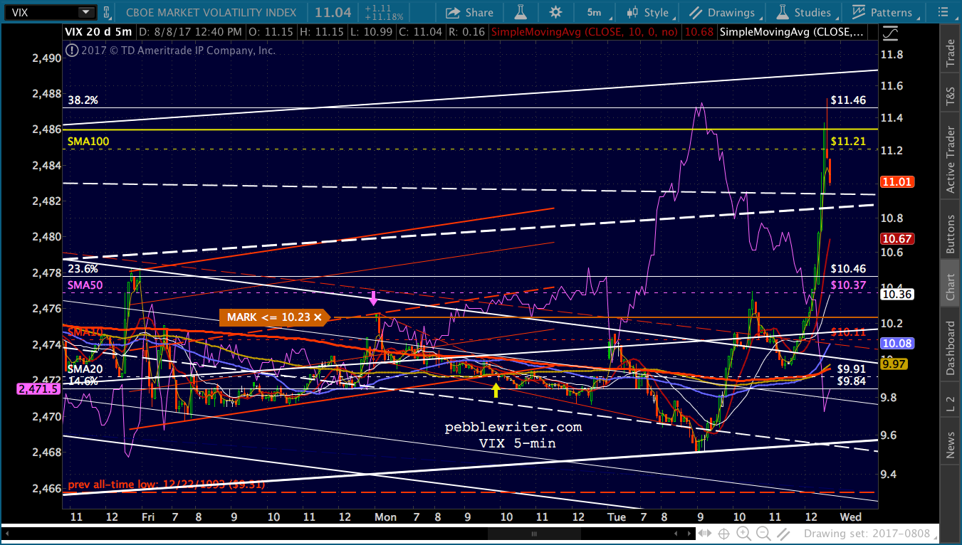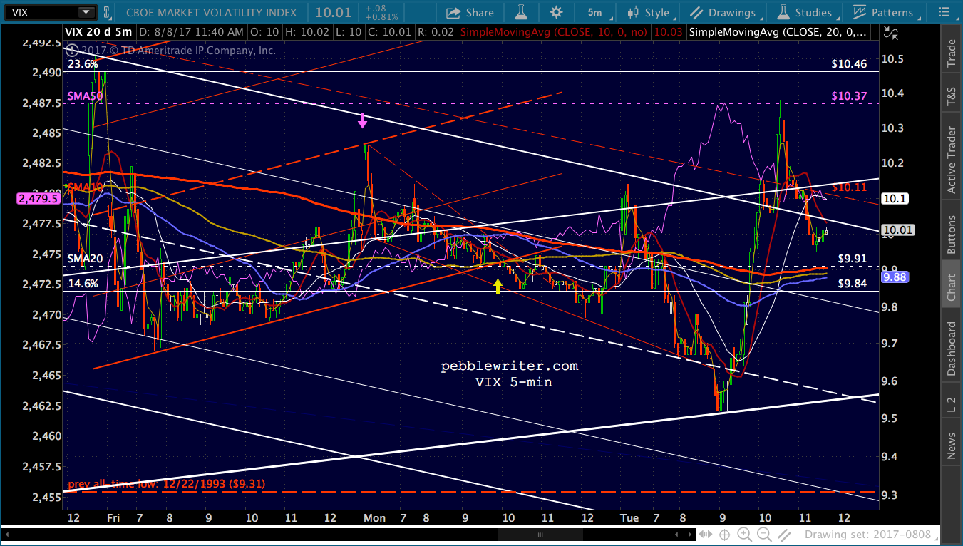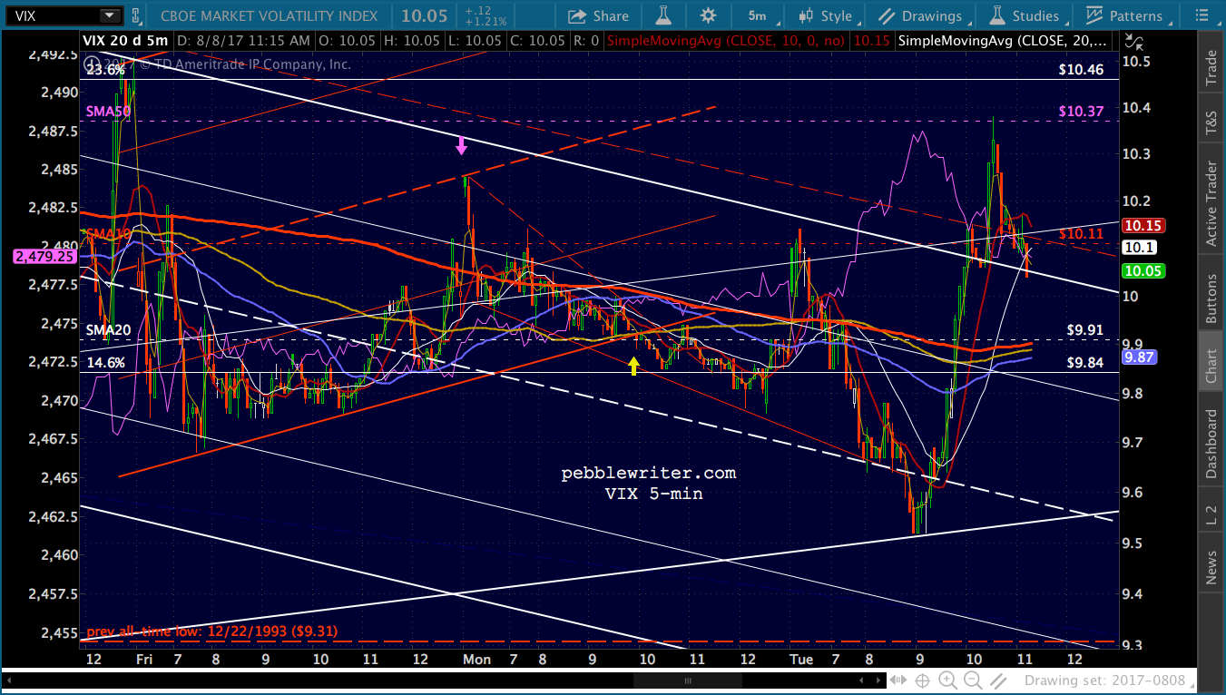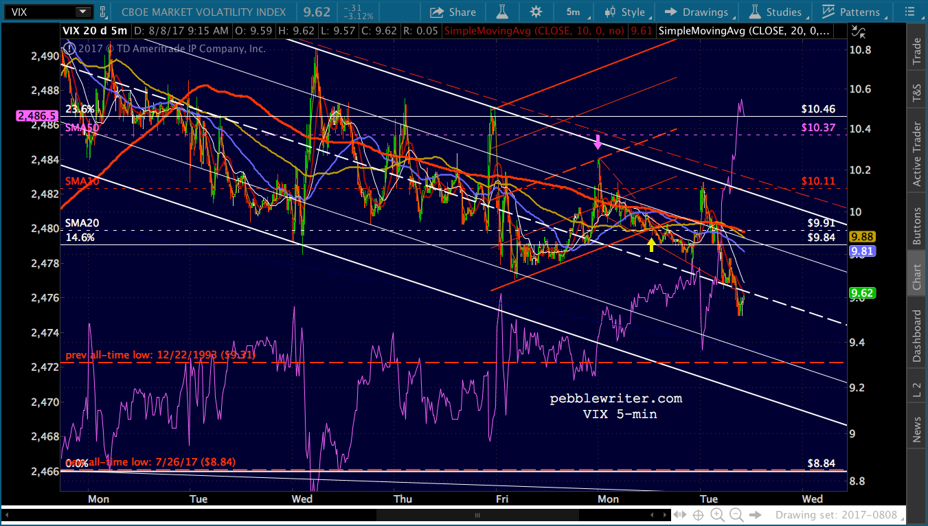Moments ago, VIX dropped through the SMA10. It has now dropped through the white channel top in an effort to keep SPX north of the SMA5 100 and purple channel midline. Assuming it’ll keep going, and send SPX higher again. I’d cover here, even though there is clearly plenty of selling pressure out there.