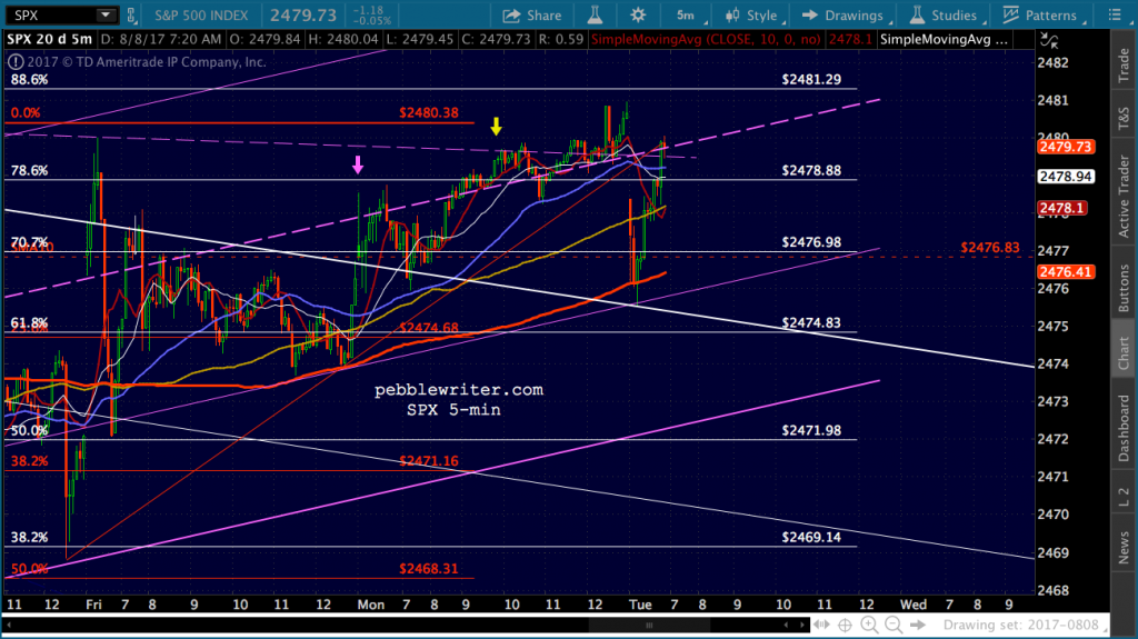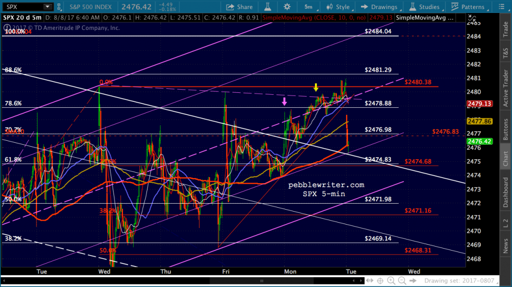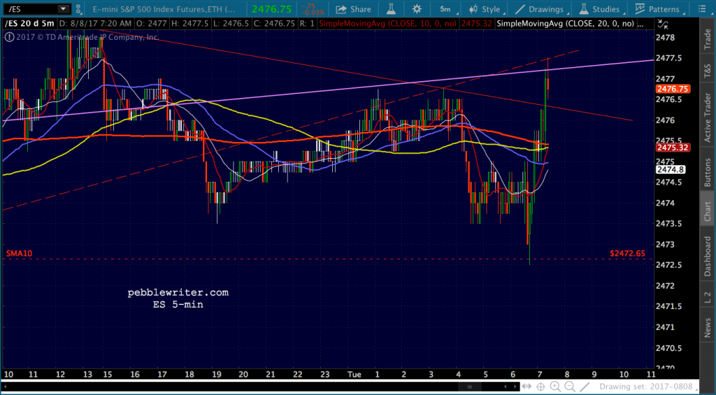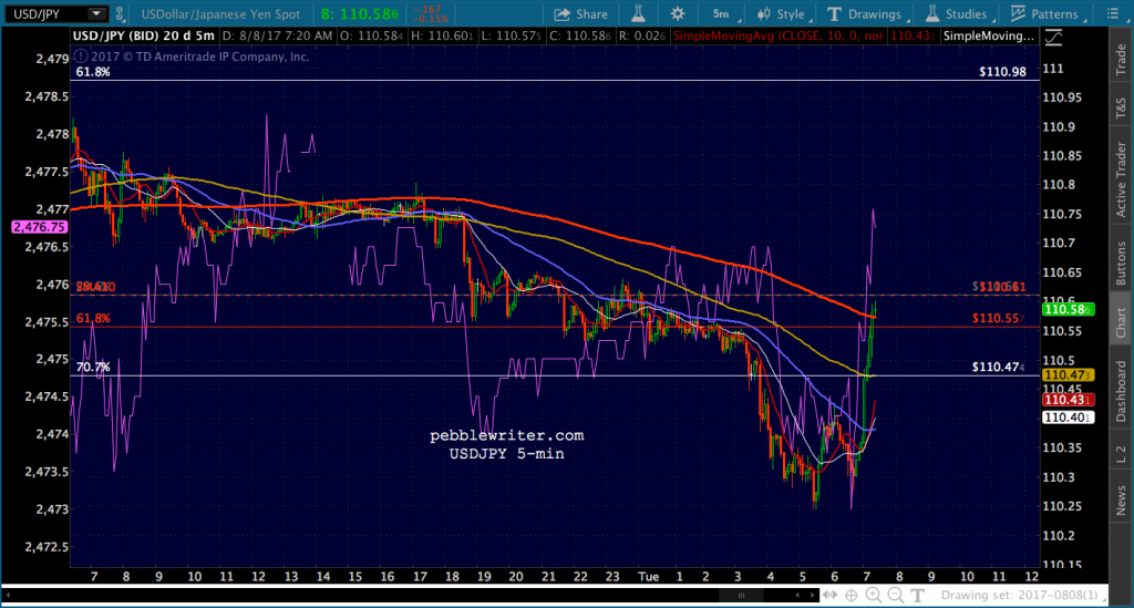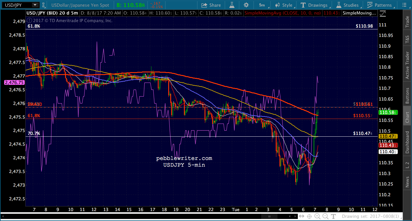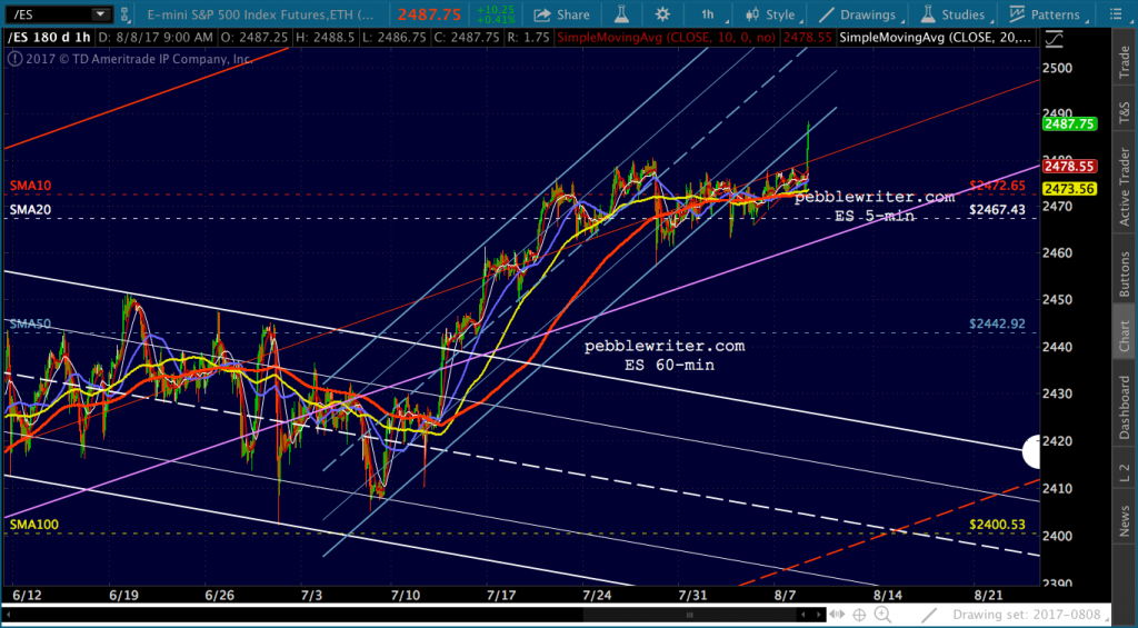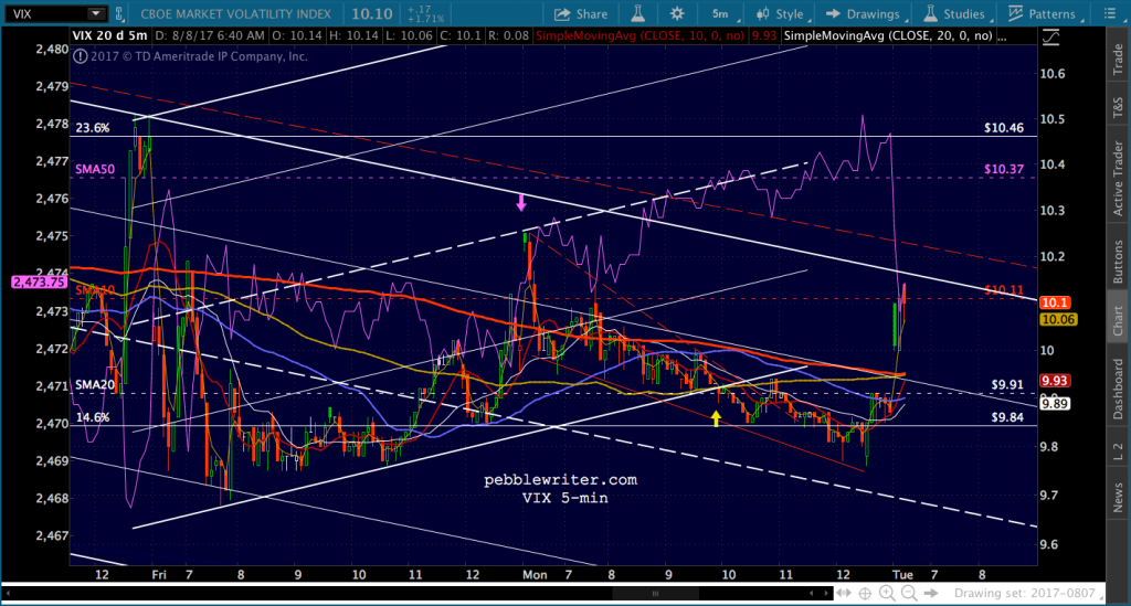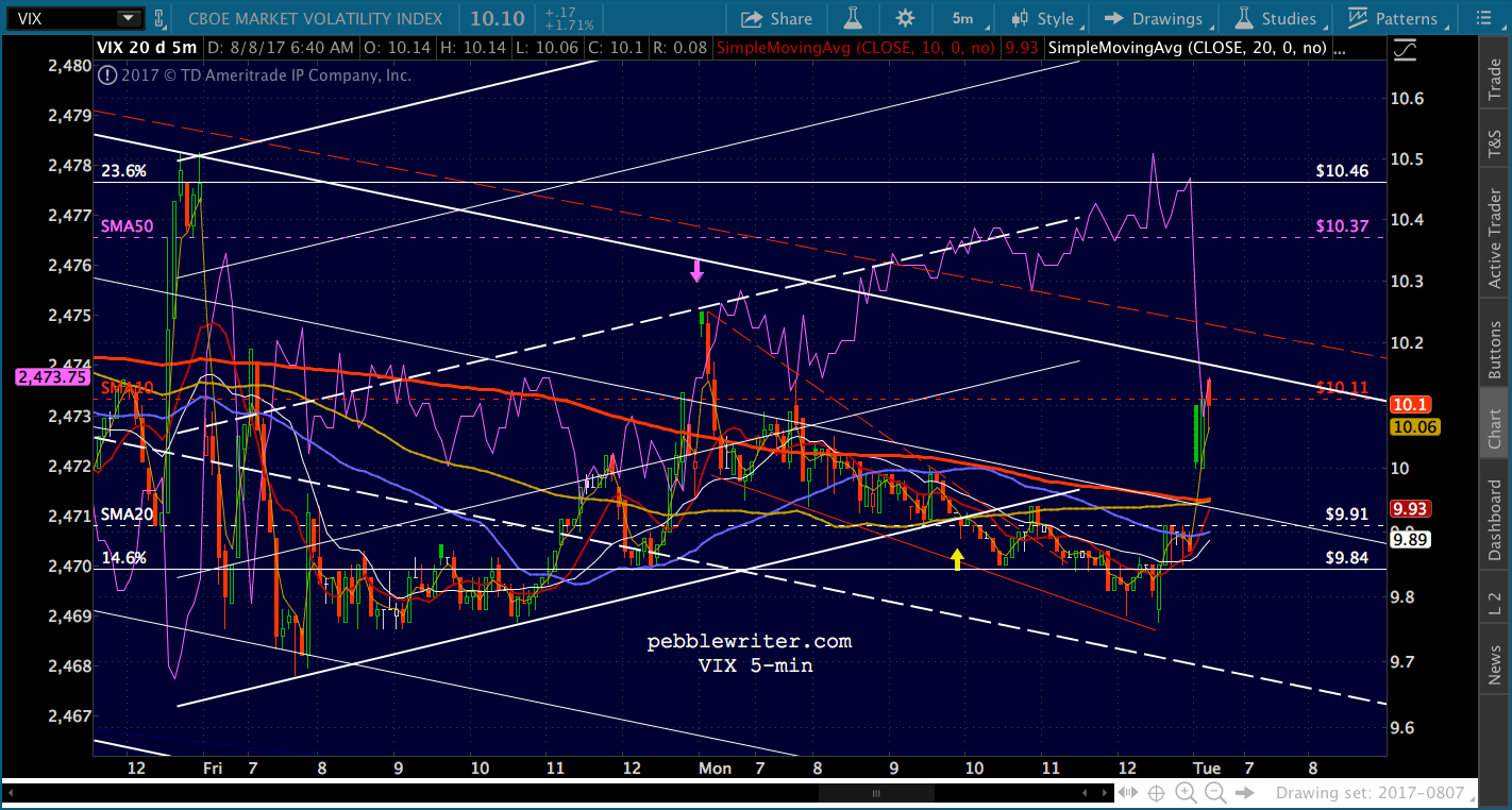 Big plunge by VIX and big spike by USDJPY. But, look where ES ended up… This might be worth another try at shorting provided ES doesn’t punch through double resistance at 2478ish. Of course, the fact that there’s double resistance there almost guarantees a further VIX plunge. I’d try shorting on any drop through the SMA5 10 it’s about to backtest. But, it’s just as likely (if not more) to run up to tag the .886.