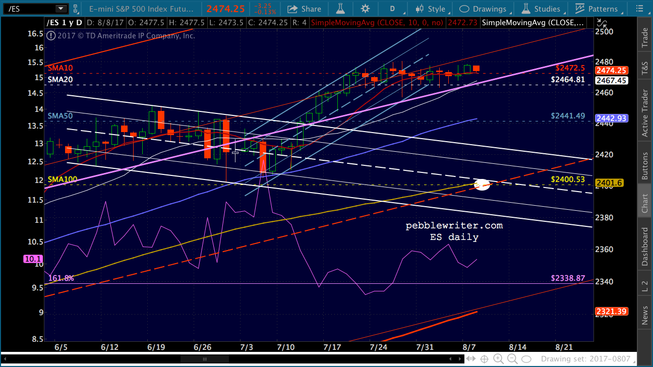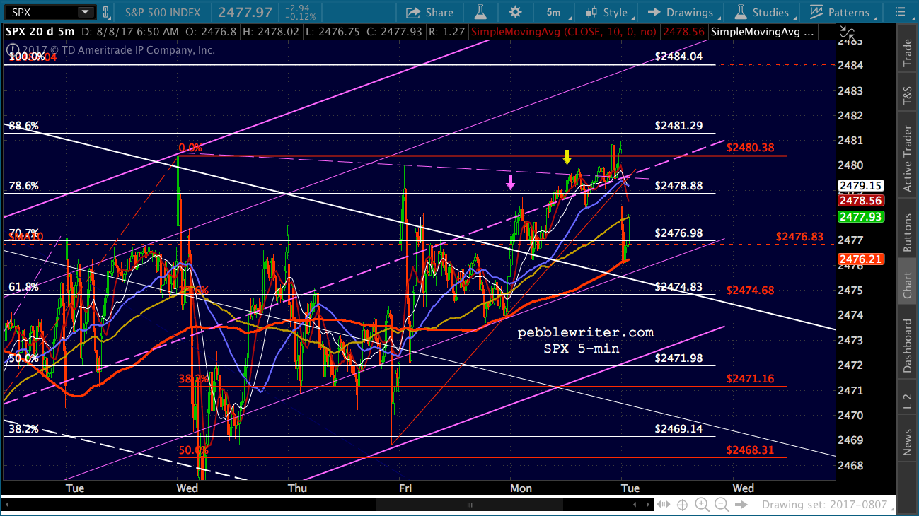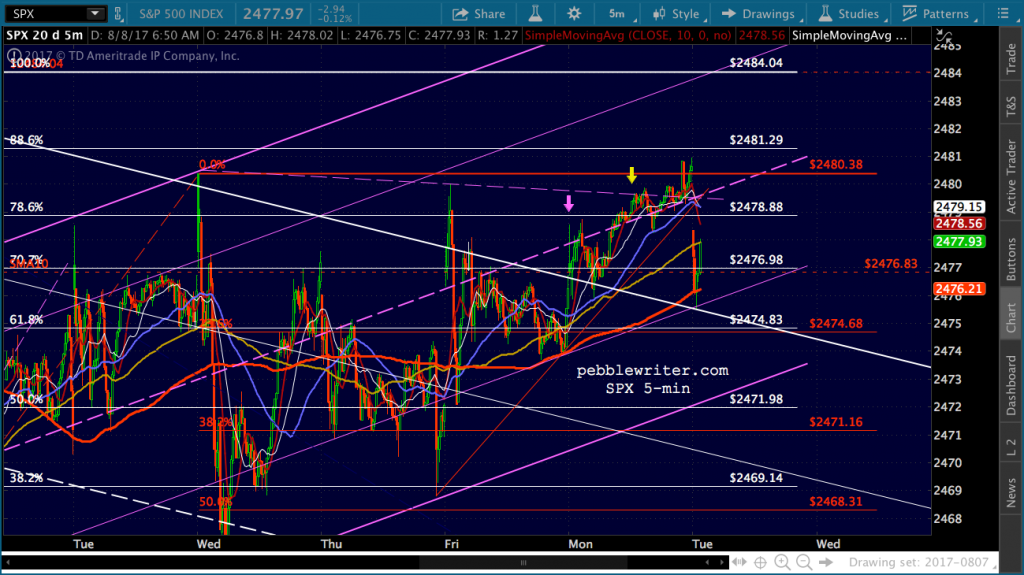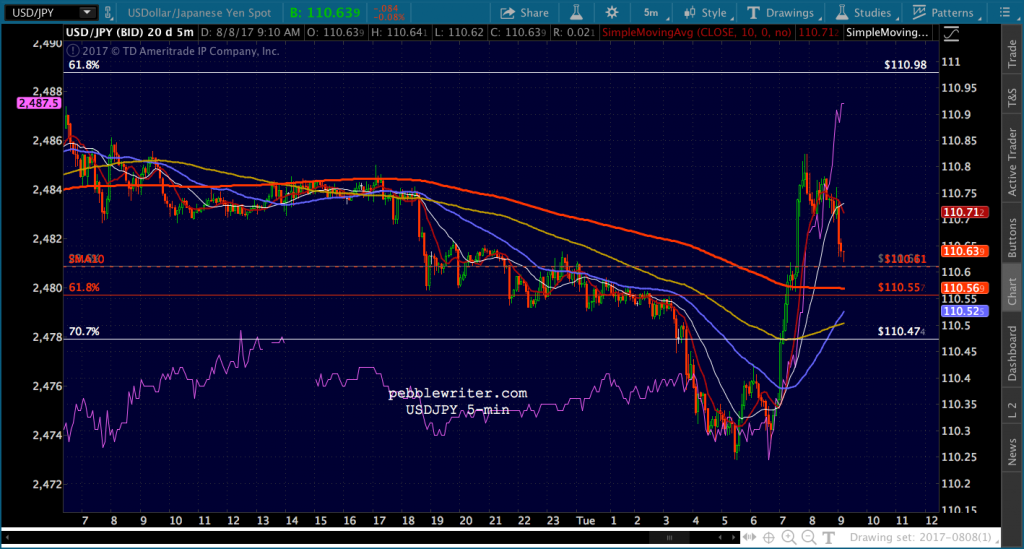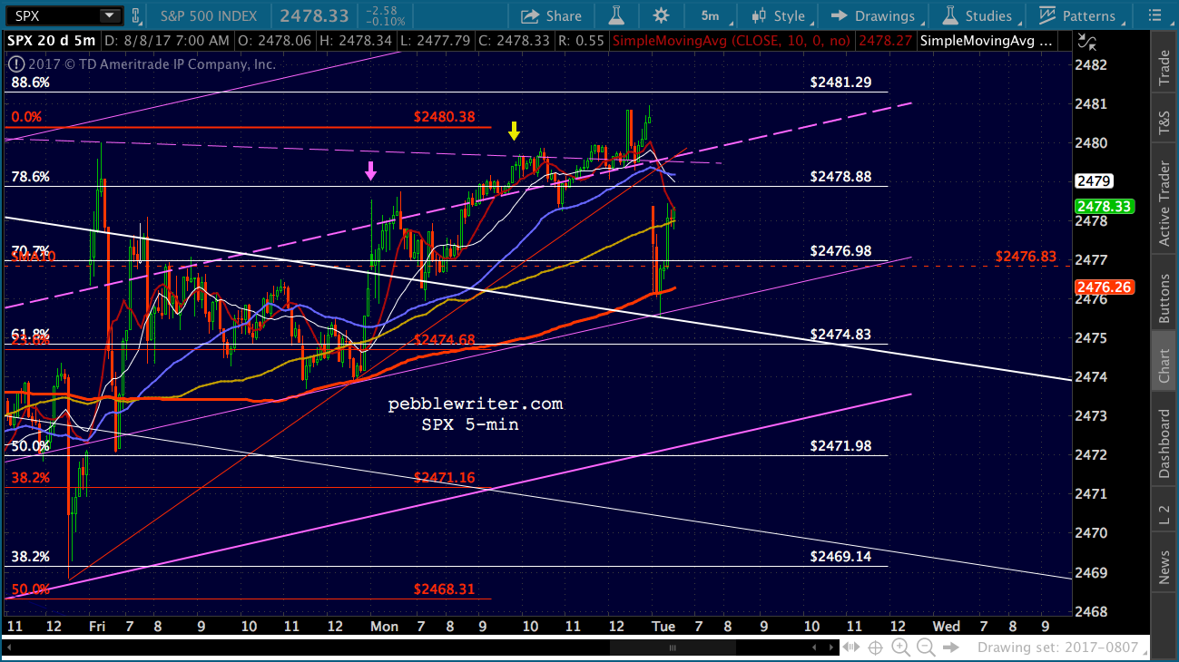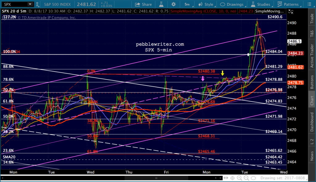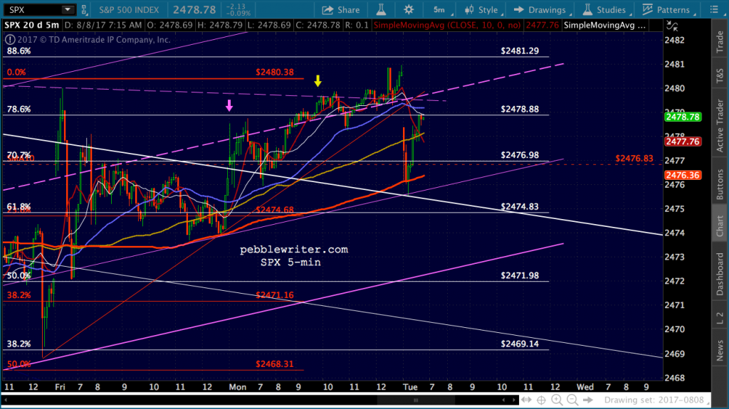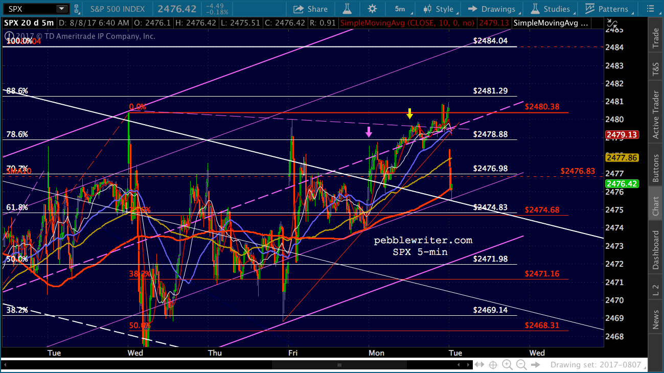 Big plunge by VIX and big spike by USDJPY. But, look where ES ended up… This might be worth another try at shorting provided ES doesn’t punch through double resistance at 2478ish. Of course, the fact that there’s double resistance there almost guarantees a further VIX plunge. I’d try shorting on any drop through the SMA5 10 it’s about to backtest. But, it’s just as likely (if not more) to run up to tag the .886.
