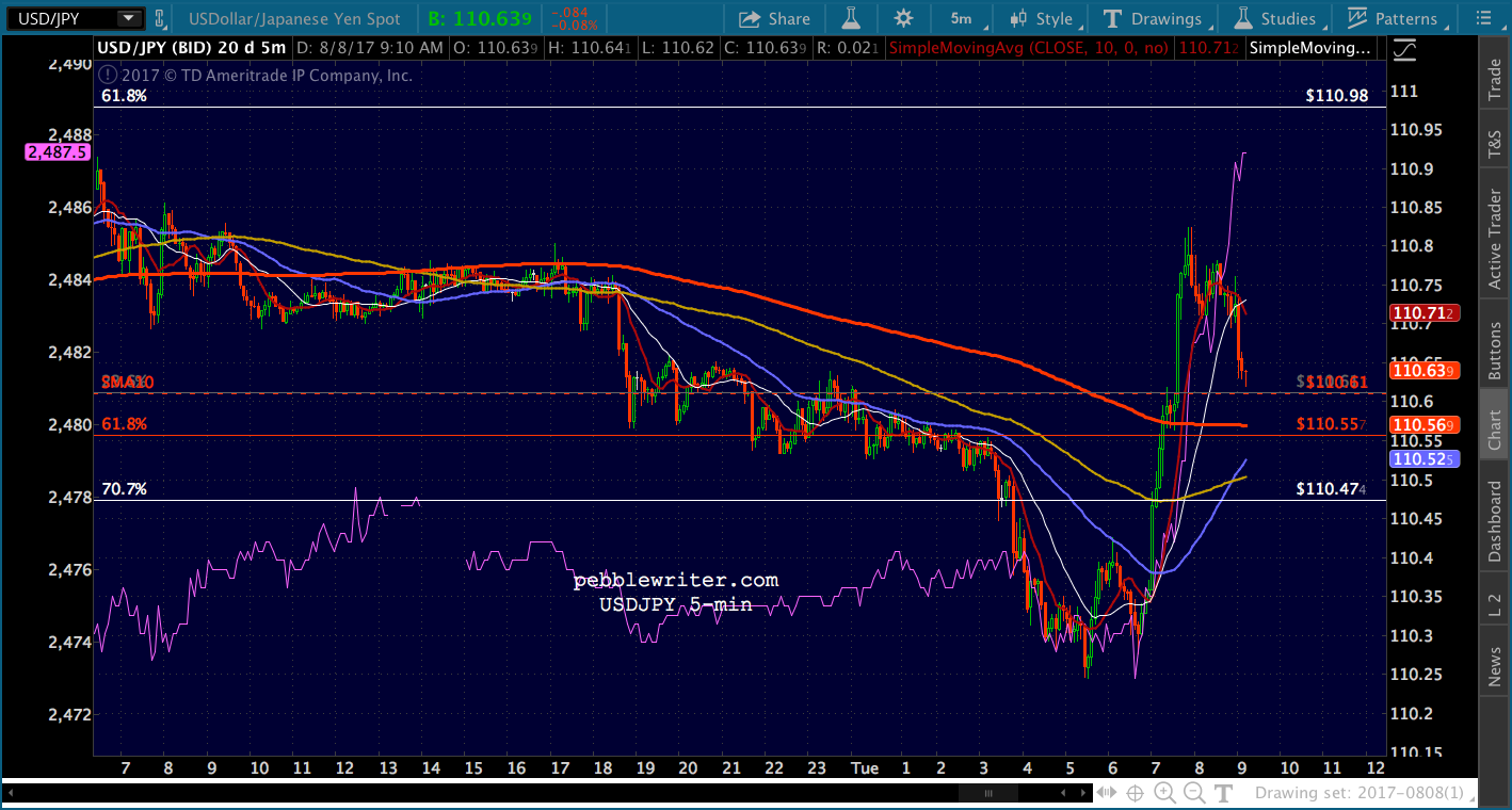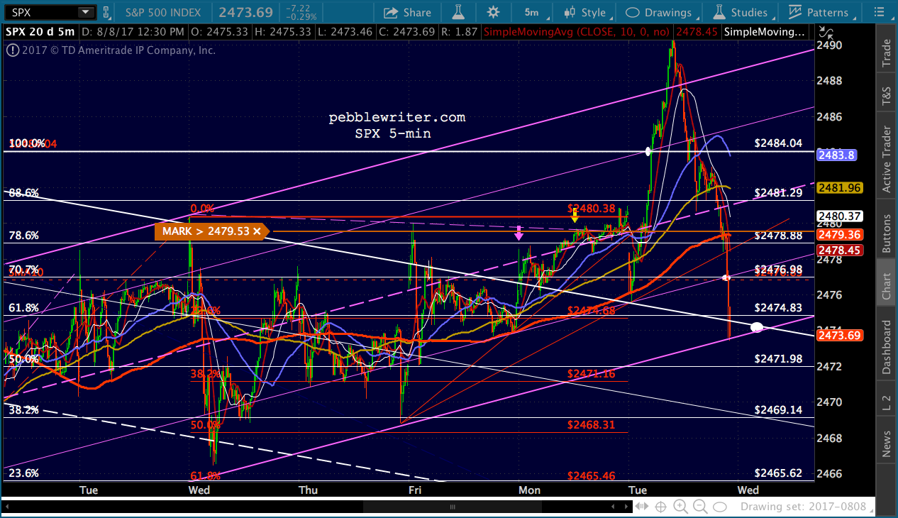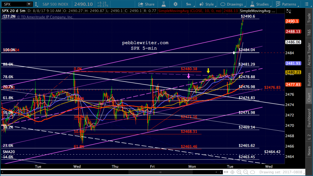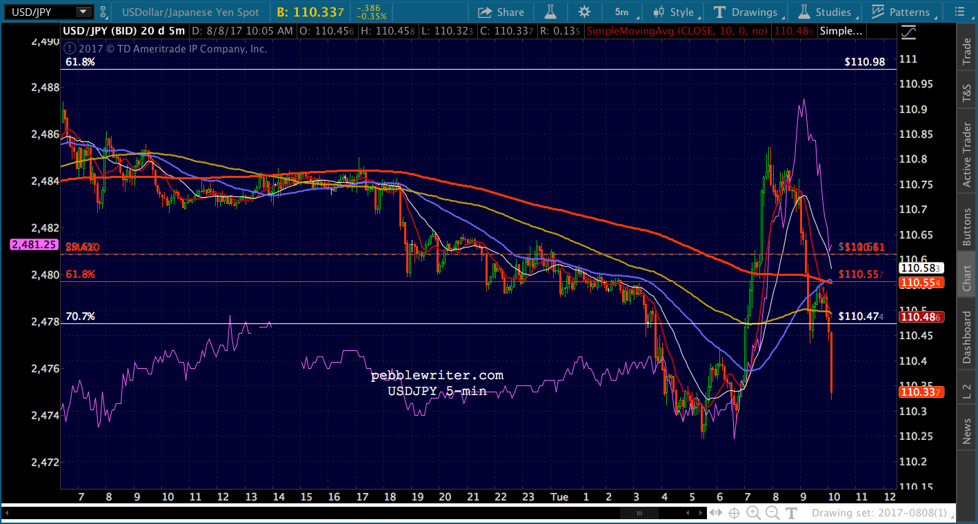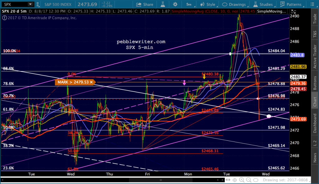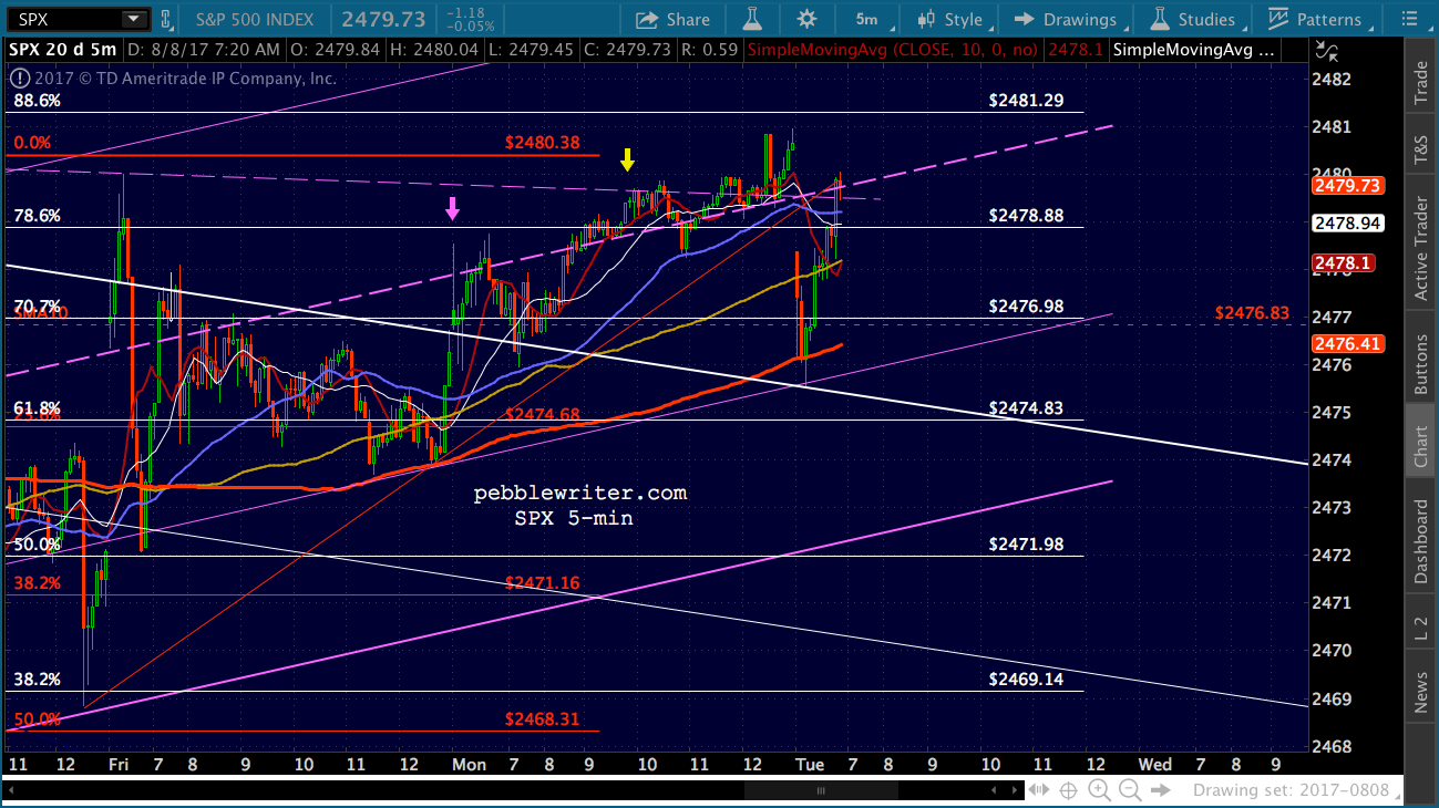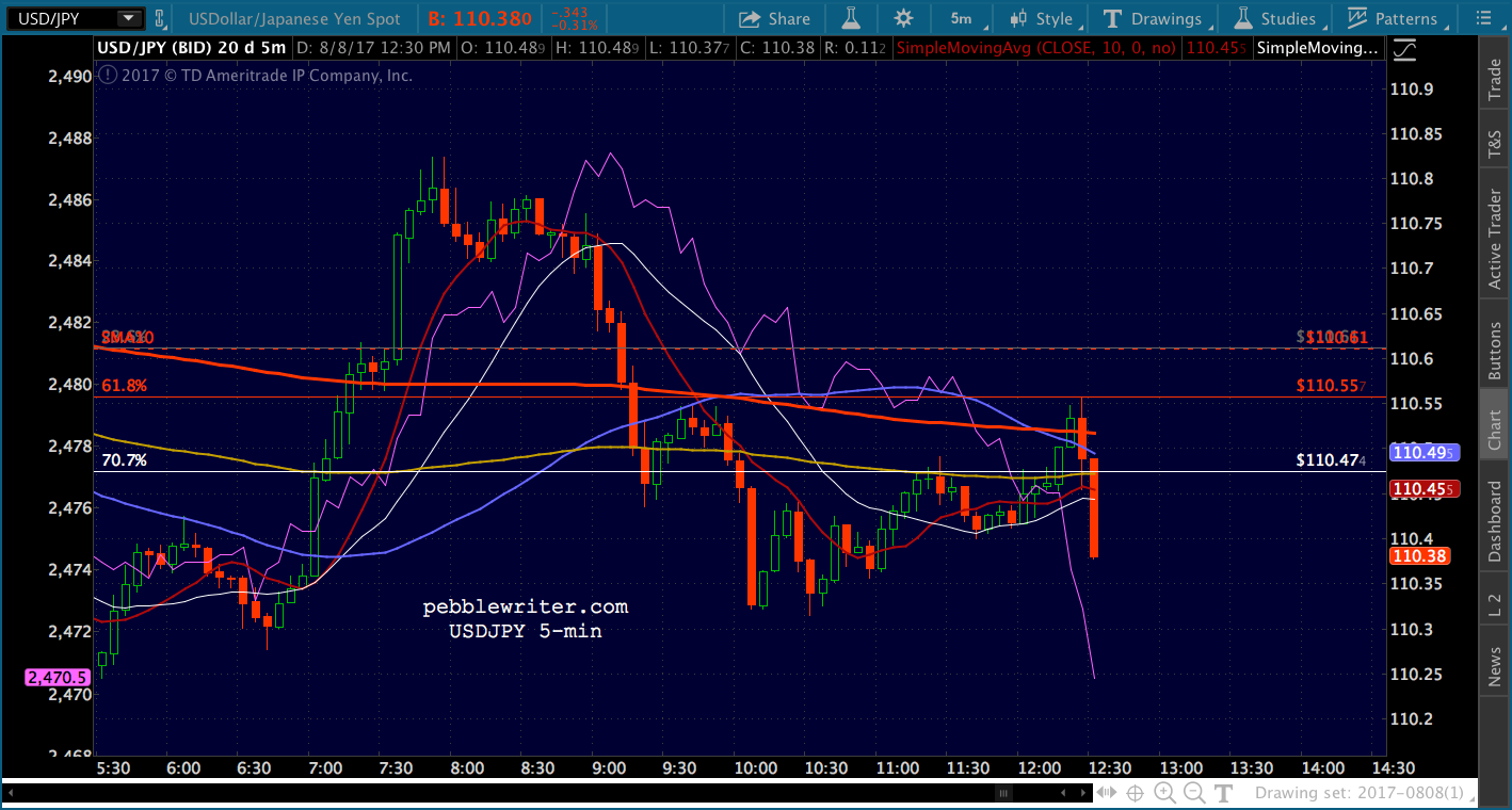 Big plunge by VIX and big spike by USDJPY. But, look where ES ended up… This might be worth another try at shorting provided ES doesn’t punch through double resistance at 2478ish. Of course, the fact that there’s double resistance there almost guarantees a further VIX plunge. I’d try shorting on any drop through the SMA5 10 it’s about to backtest. But, it’s just as likely (if not more) to run up to tag the .886.