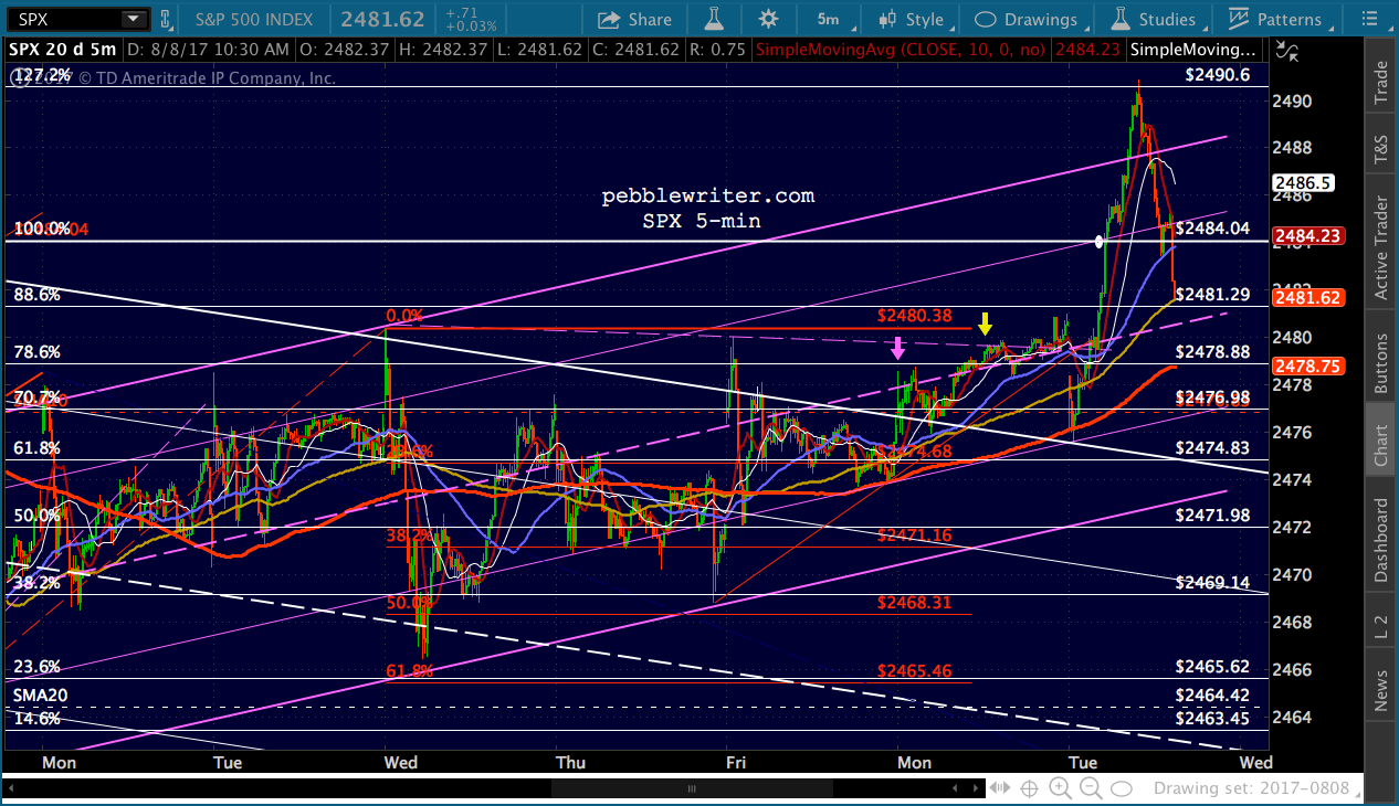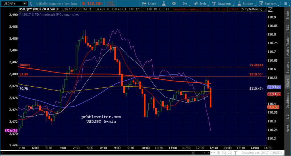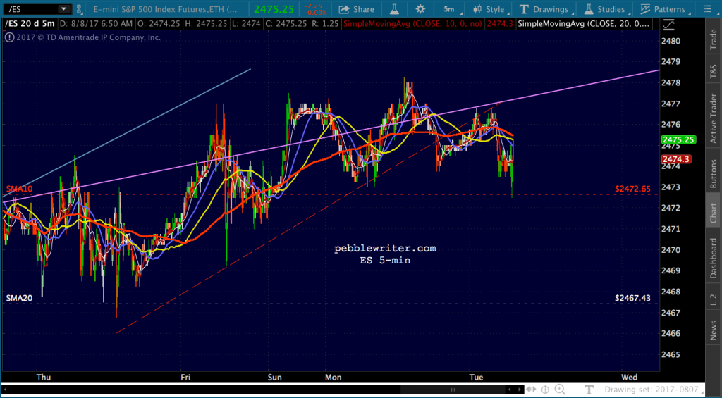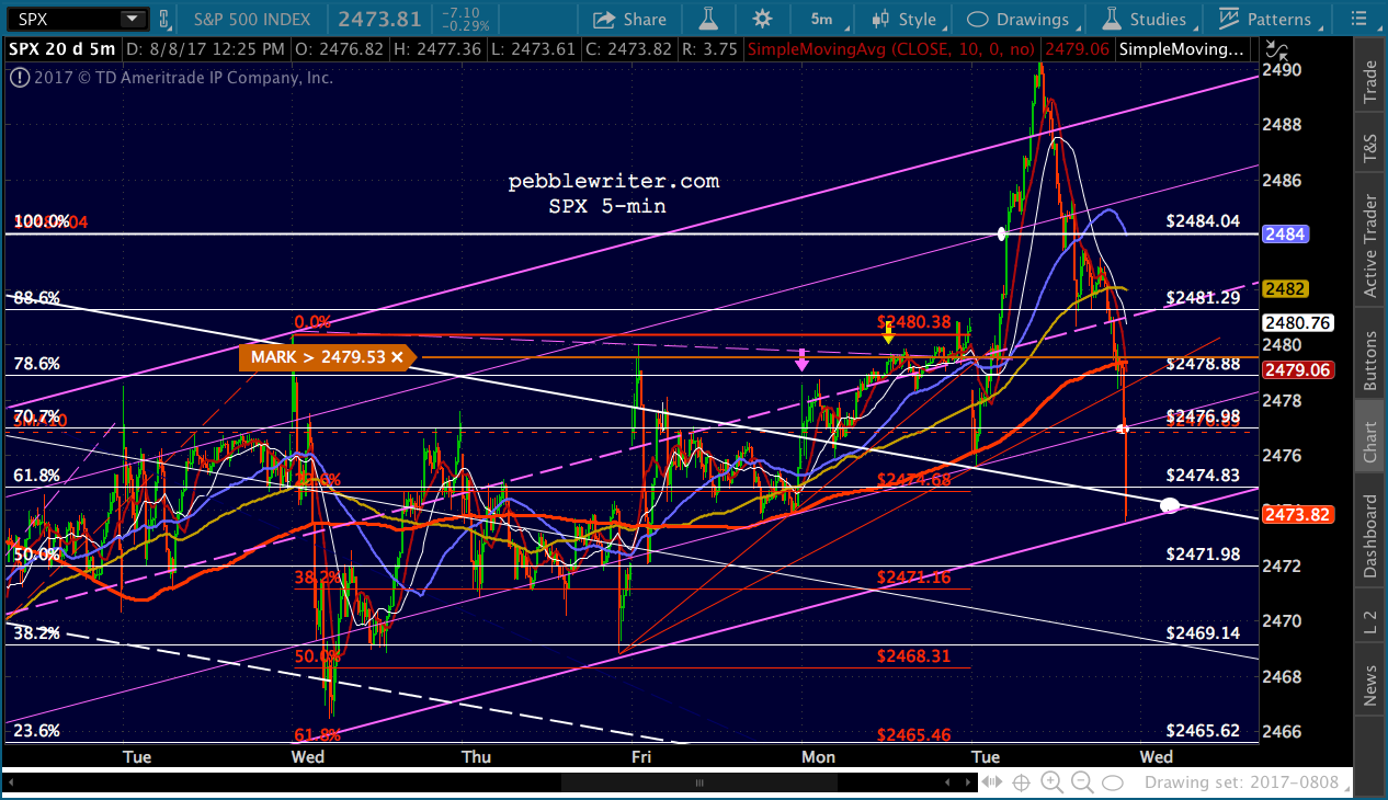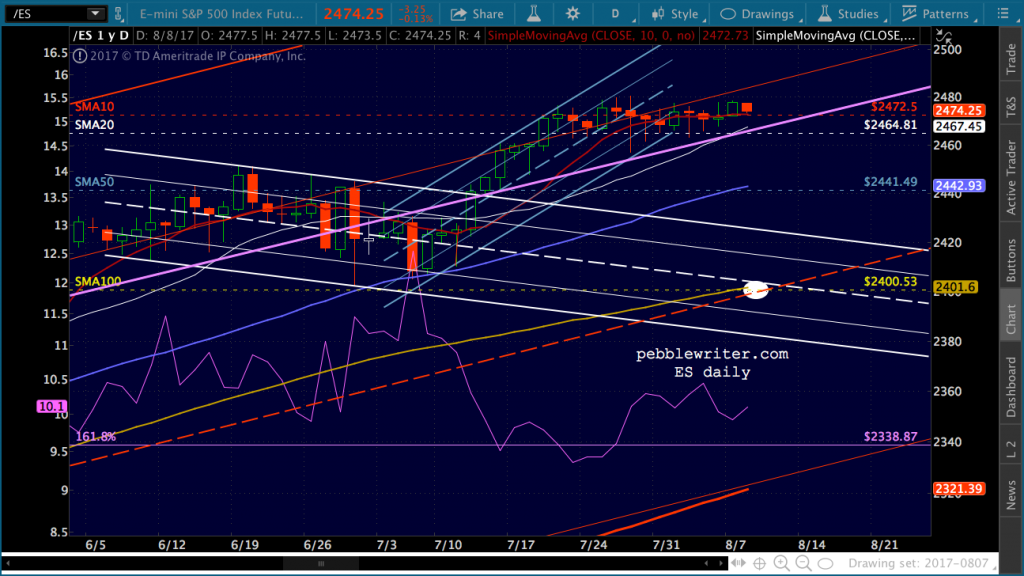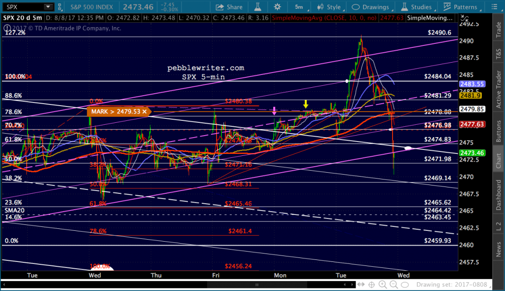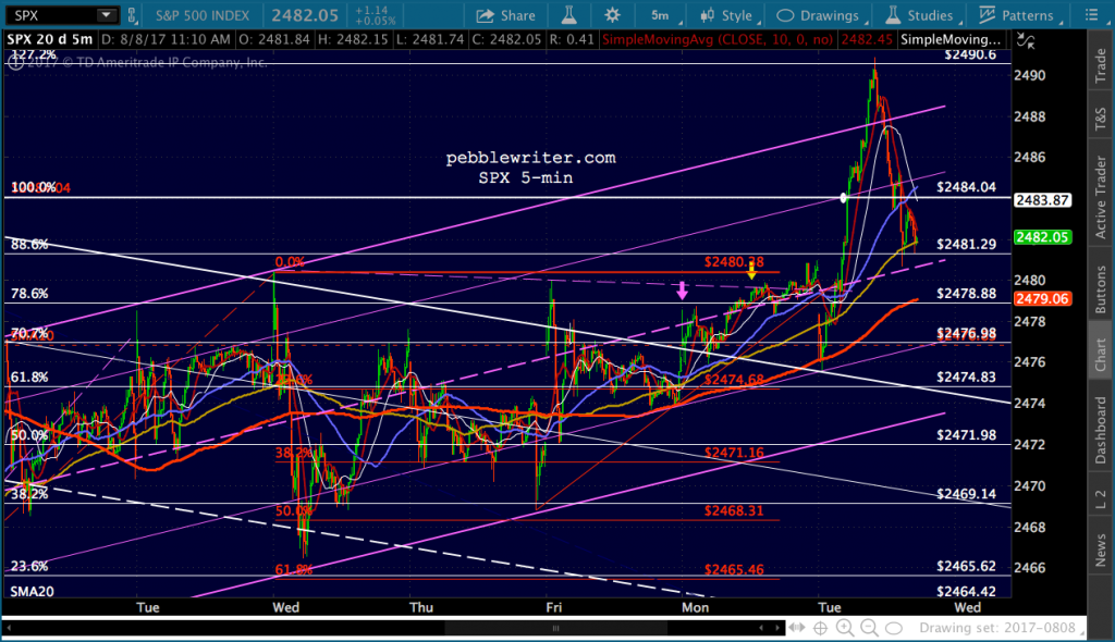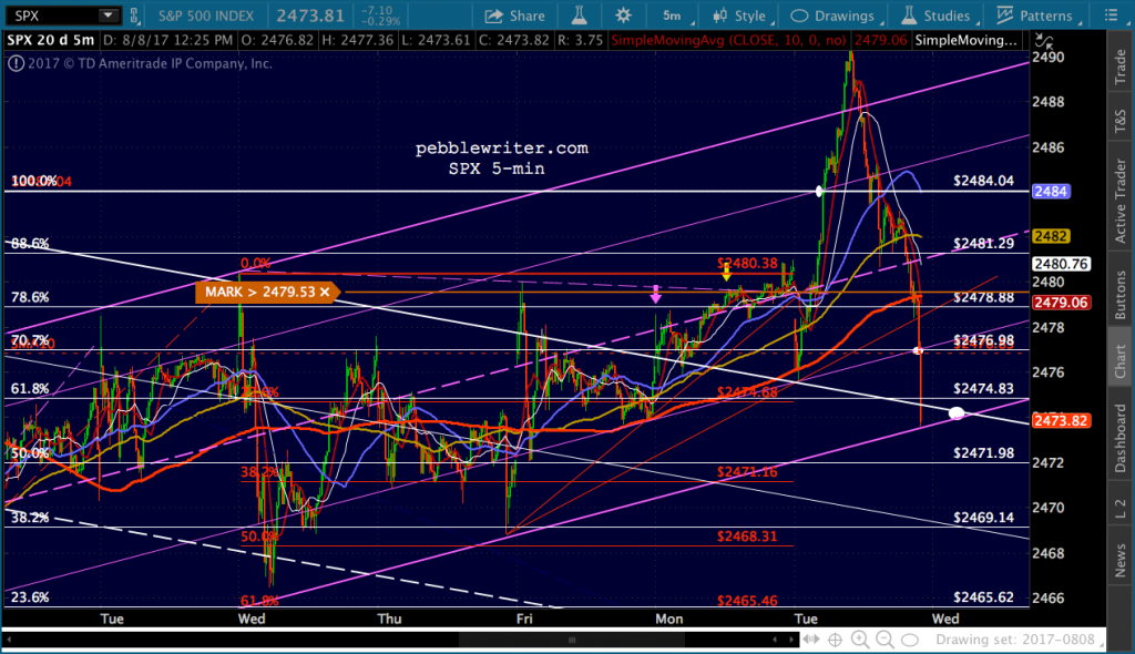 Big plunge by VIX and big spike by USDJPY. But, look where ES ended up… This might be worth another try at shorting provided ES doesn’t punch through double resistance at 2478ish. Of course, the fact that there’s double resistance there almost guarantees a further VIX plunge. I’d try shorting on any drop through the SMA5 10 it’s about to backtest. But, it’s just as likely (if not more) to run up to tag the .886.