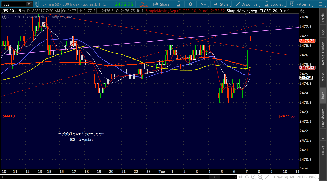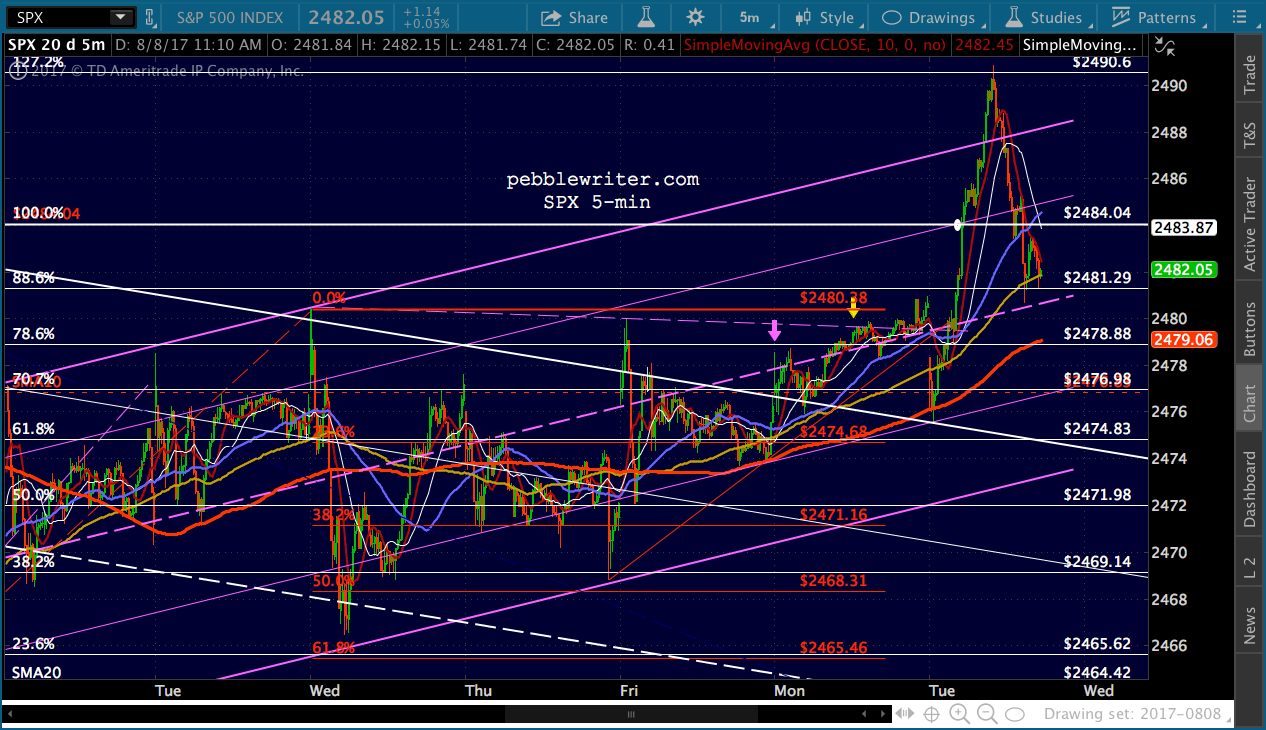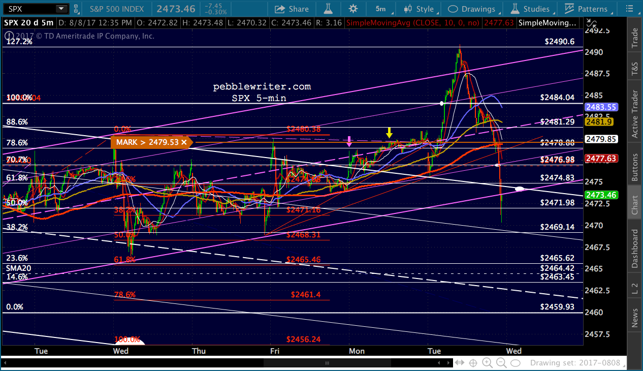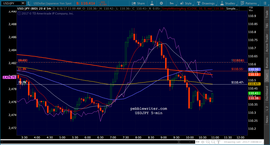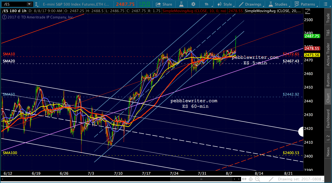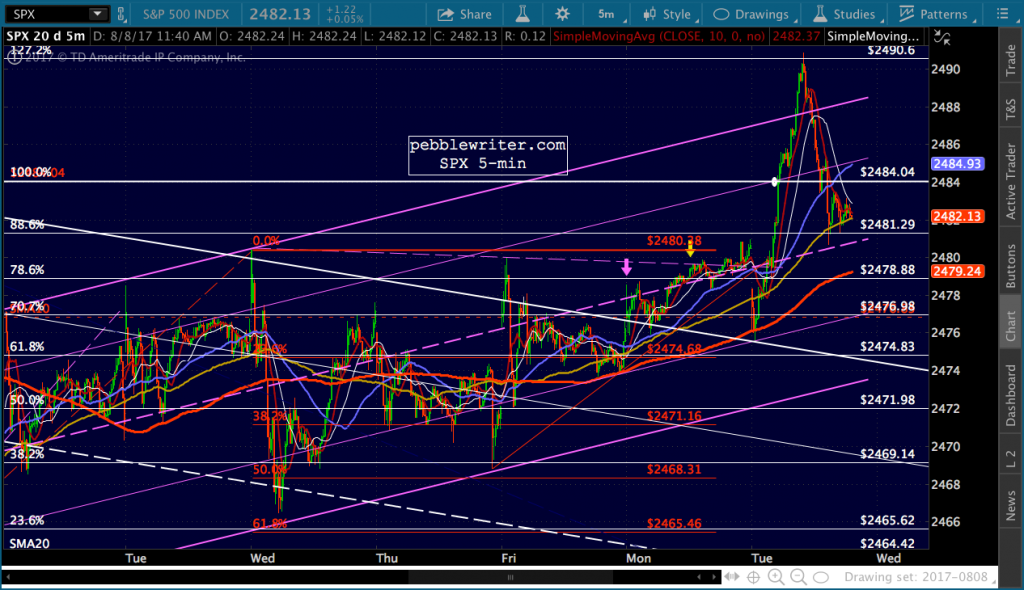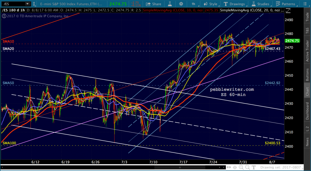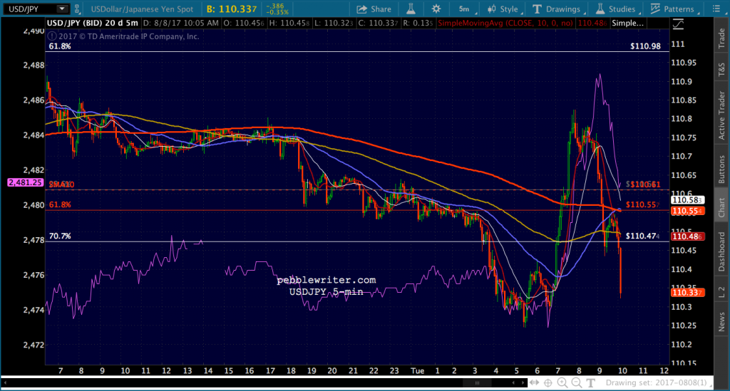 Big plunge by VIX and big spike by USDJPY. But, look where ES ended up… This might be worth another try at shorting provided ES doesn’t punch through double resistance at 2478ish. Of course, the fact that there’s double resistance there almost guarantees a further VIX plunge. I’d try shorting on any drop through the SMA5 10 it’s about to backtest. But, it’s just as likely (if not more) to run up to tag the .886.