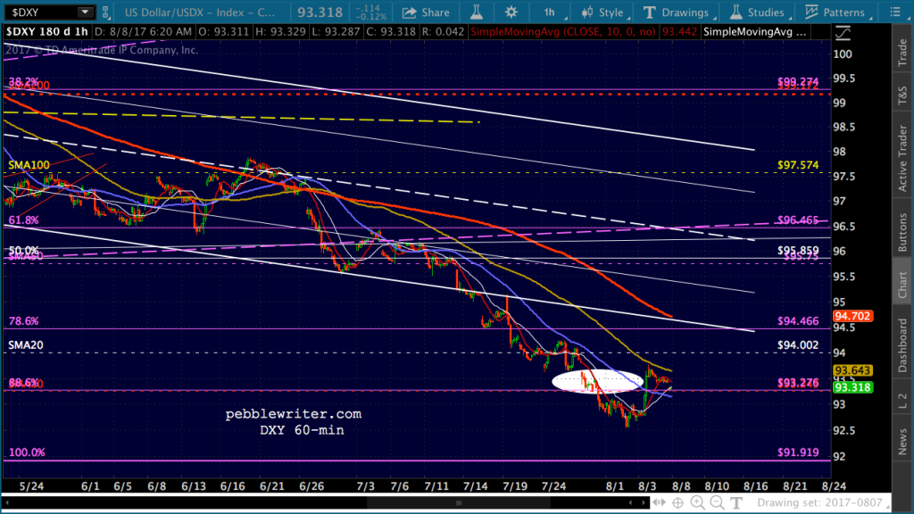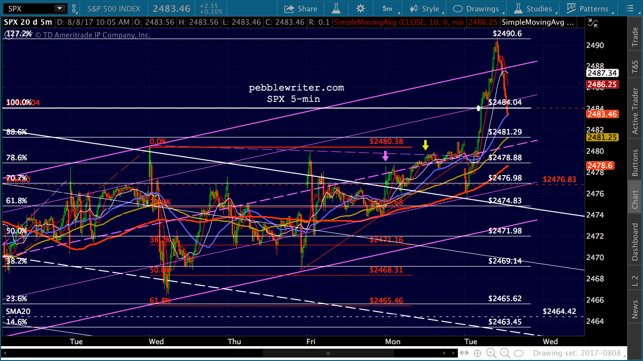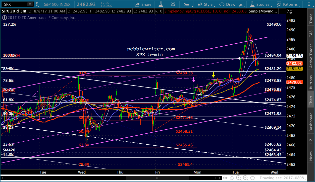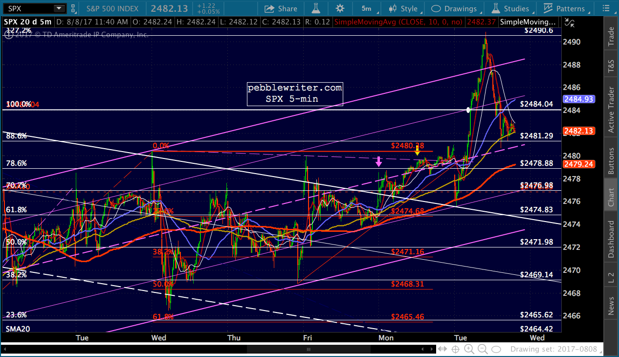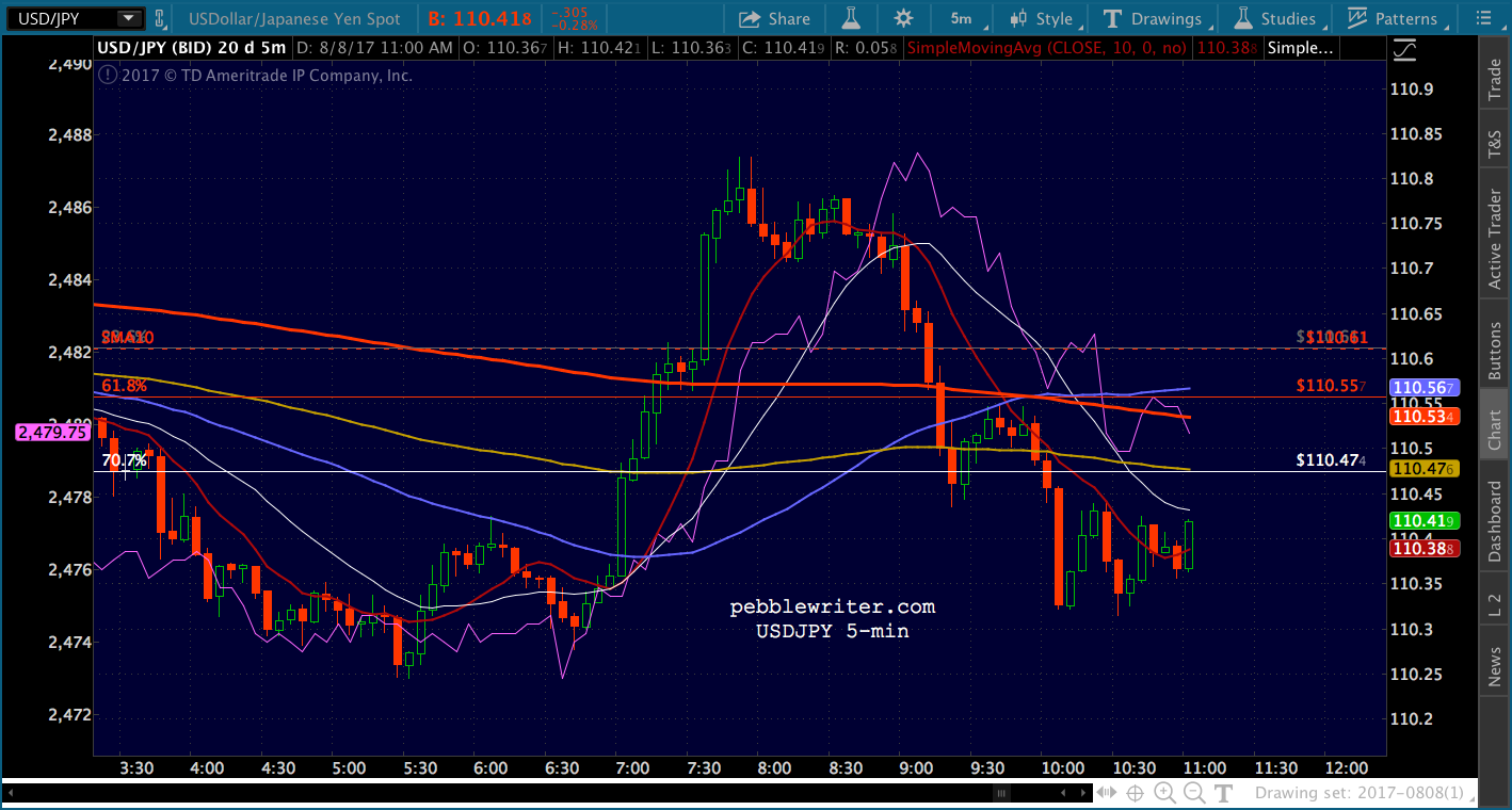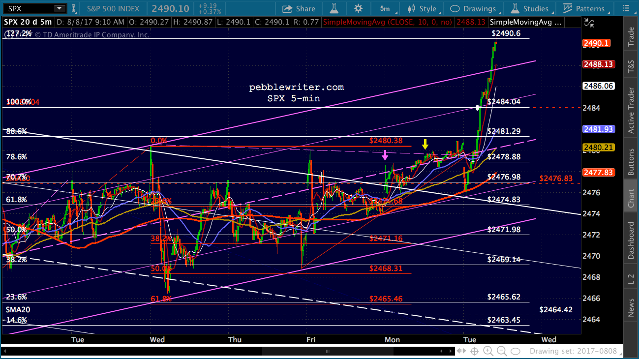 Big plunge by VIX and big spike by USDJPY. But, look where ES ended up… This might be worth another try at shorting provided ES doesn’t punch through double resistance at 2478ish. Of course, the fact that there’s double resistance there almost guarantees a further VIX plunge. I’d try shorting on any drop through the SMA5 10 it’s about to backtest. But, it’s just as likely (if not more) to run up to tag the .886.