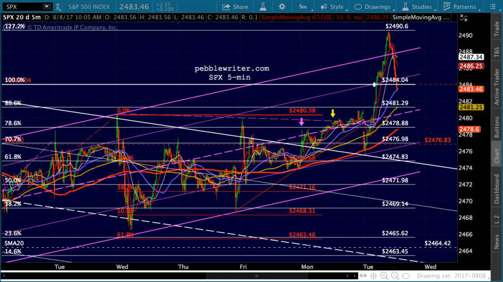 VIX just broke out, so it’s back to short for SPX on the drop through the SMA5 50 (2483.81), with the likely target of the SMA5 200 (2478.78) or SMA10 (2476.83.) If neither of those holds, the white .618 at 2474.83 would offer another backtest opportunity — but, do we really need a third? The key, of course, is whether VIX remains broken out of the falling white channel and above its SMA10 (10.11.) If so, there’s plenty of room for a deeper drop – especially if USDJPY continues falling.