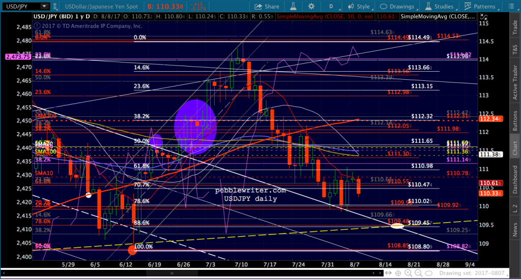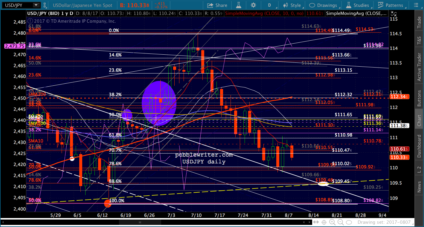 It’s hardly a surprise, but VIX just dipped below the red TL and should soon test the SMA10 and white channel top. If it plunges through the SMA10, SPX should be done dropping. USDJPY’s drop has already been arrested – at least for the time being. Watch your stops.