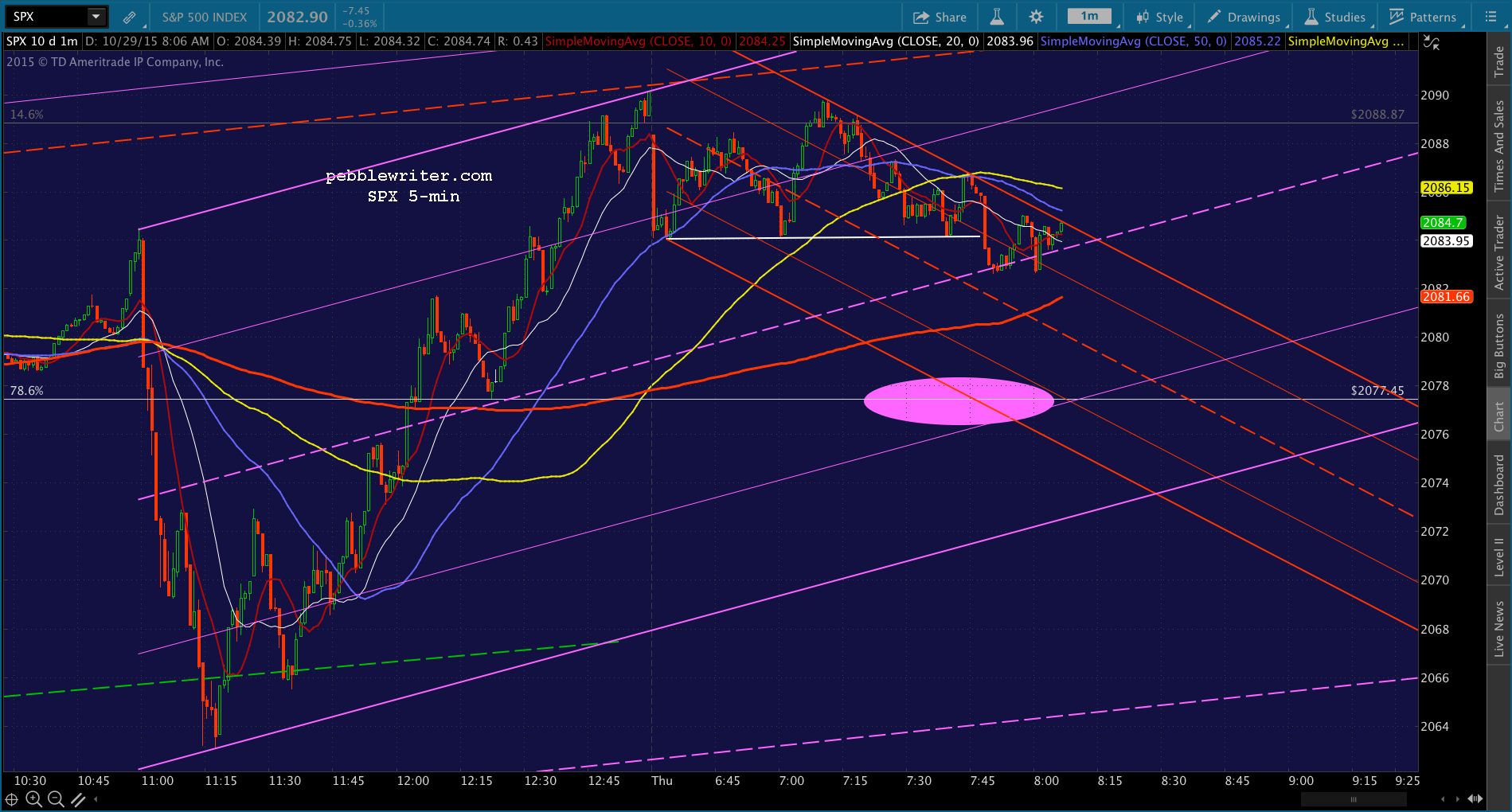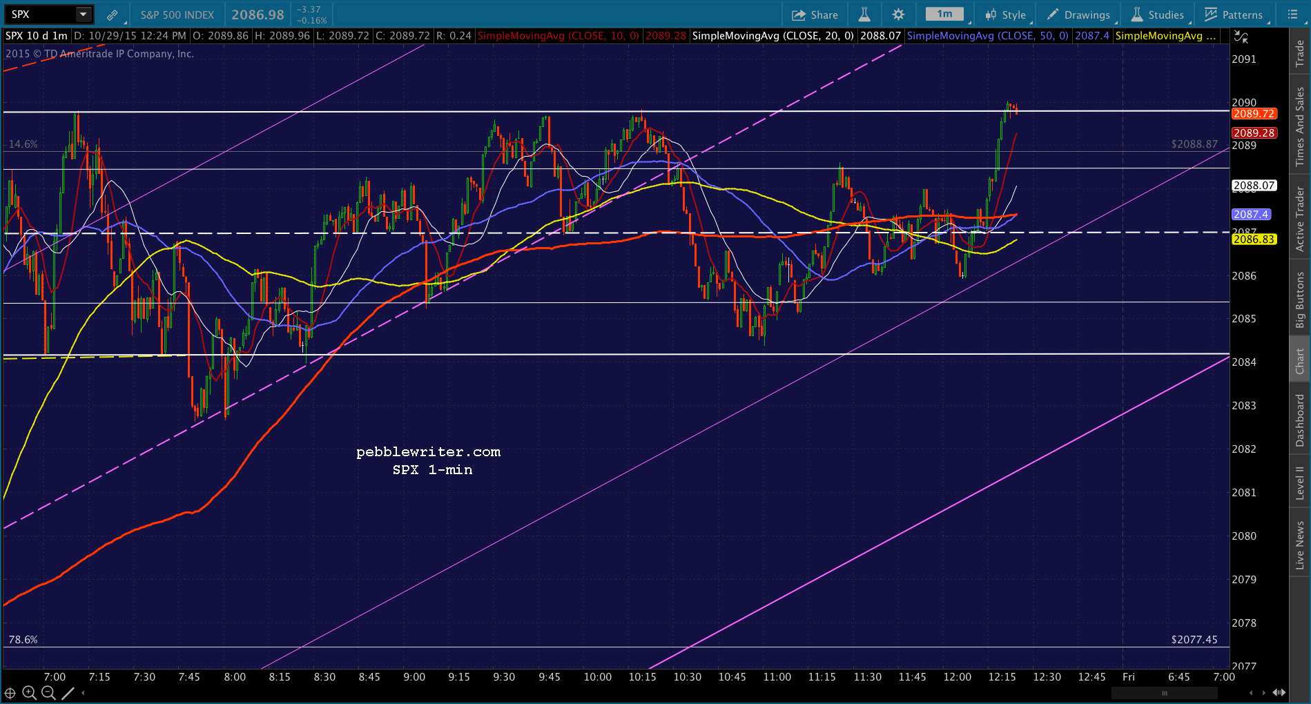 Out at 2086. Even if CL/USDJPY suddenly reverse lower, SPX will likely be propped up at the SMA200 – now at 2084. Hard to get excited about those prospects. If the SMA200 catches up, and SPX pushes below it on a CL or USDJPY reversal, I’d be game for a shot at 2077. But, at this rate, I woudn’t be surprised if it waits until overnight.