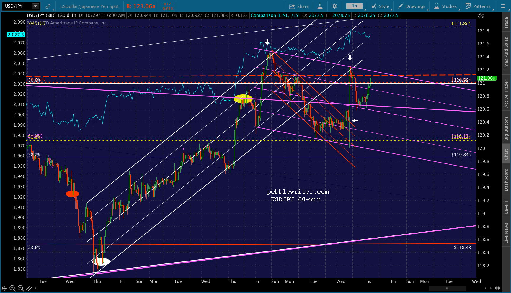 But, consider the chart below — which shows USDJPY’s 5 previous tags of the dashed, red trend line. ES – the thin purple line – didn’t react all that kindly in the past. Is there any reason to expect it will this time?