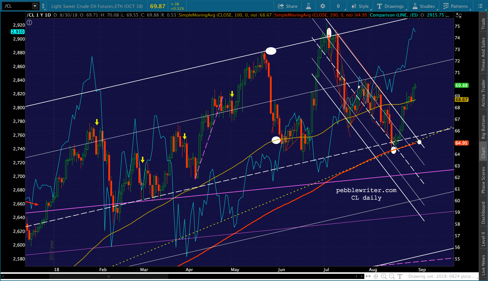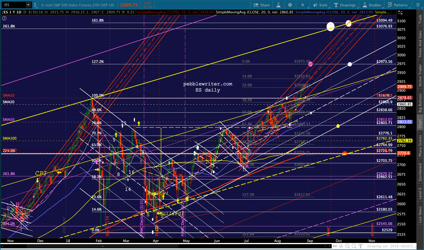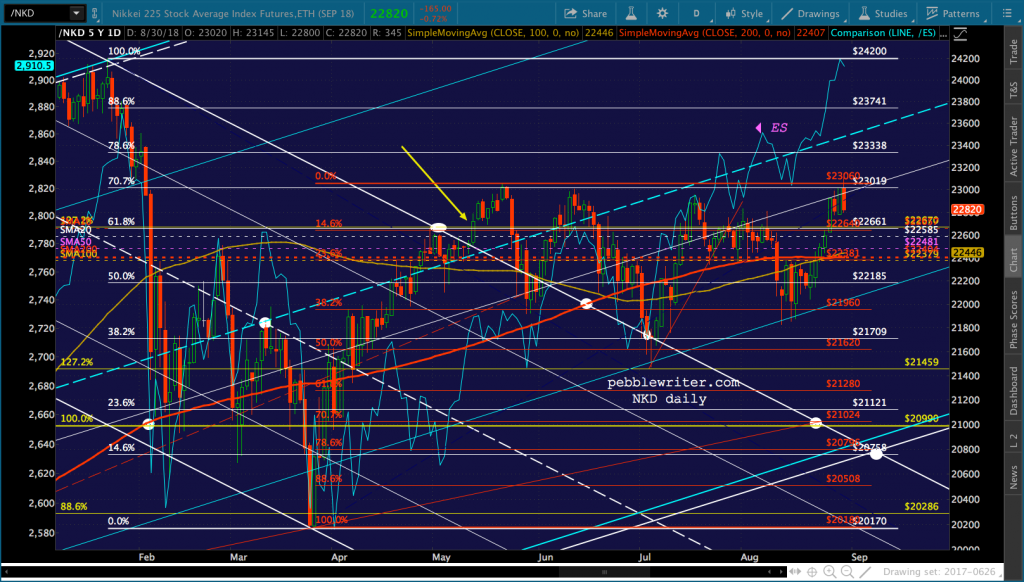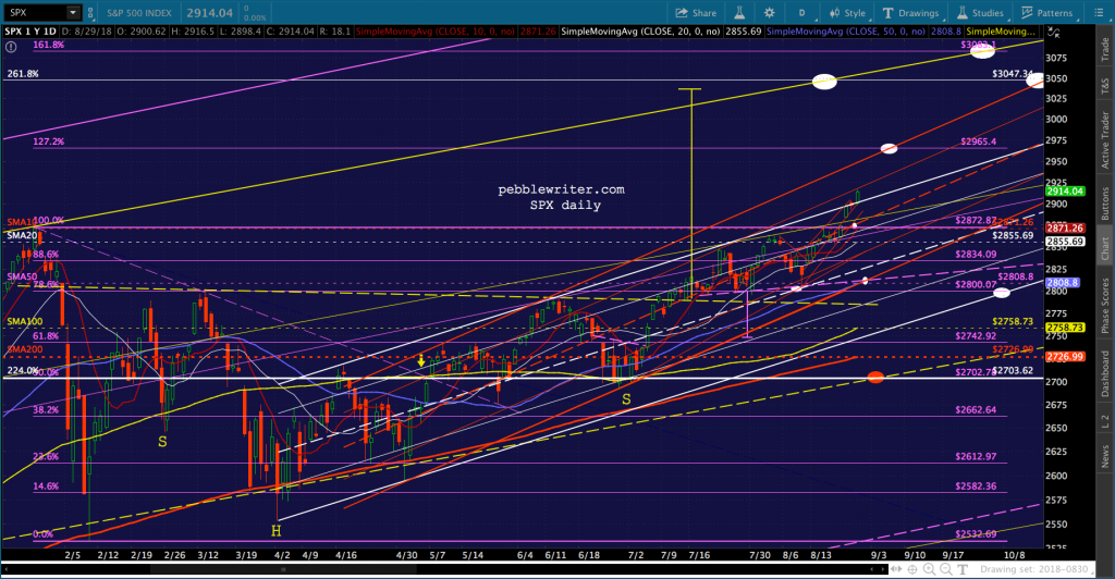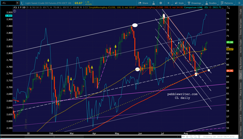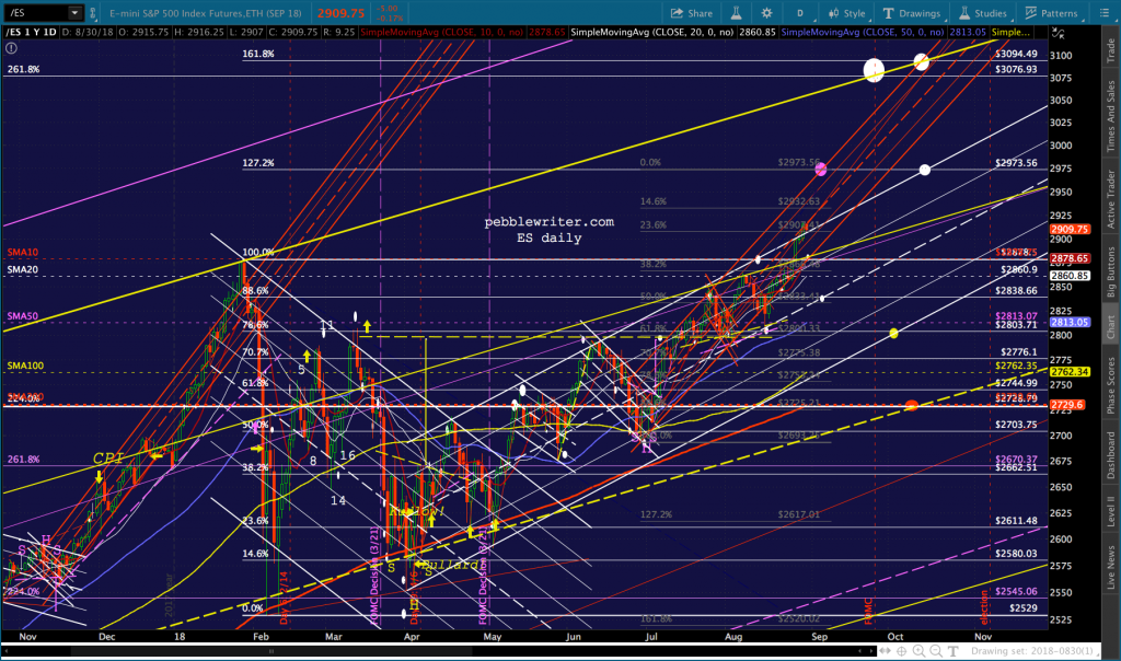 It’s worth noting that the current red channel isn’t that far off from the slope of the Nov 2017 – Feb 2018 one. In fact, if we tilt it to match, ES reaches 3076 about the time of the Sept FOMC meeting.