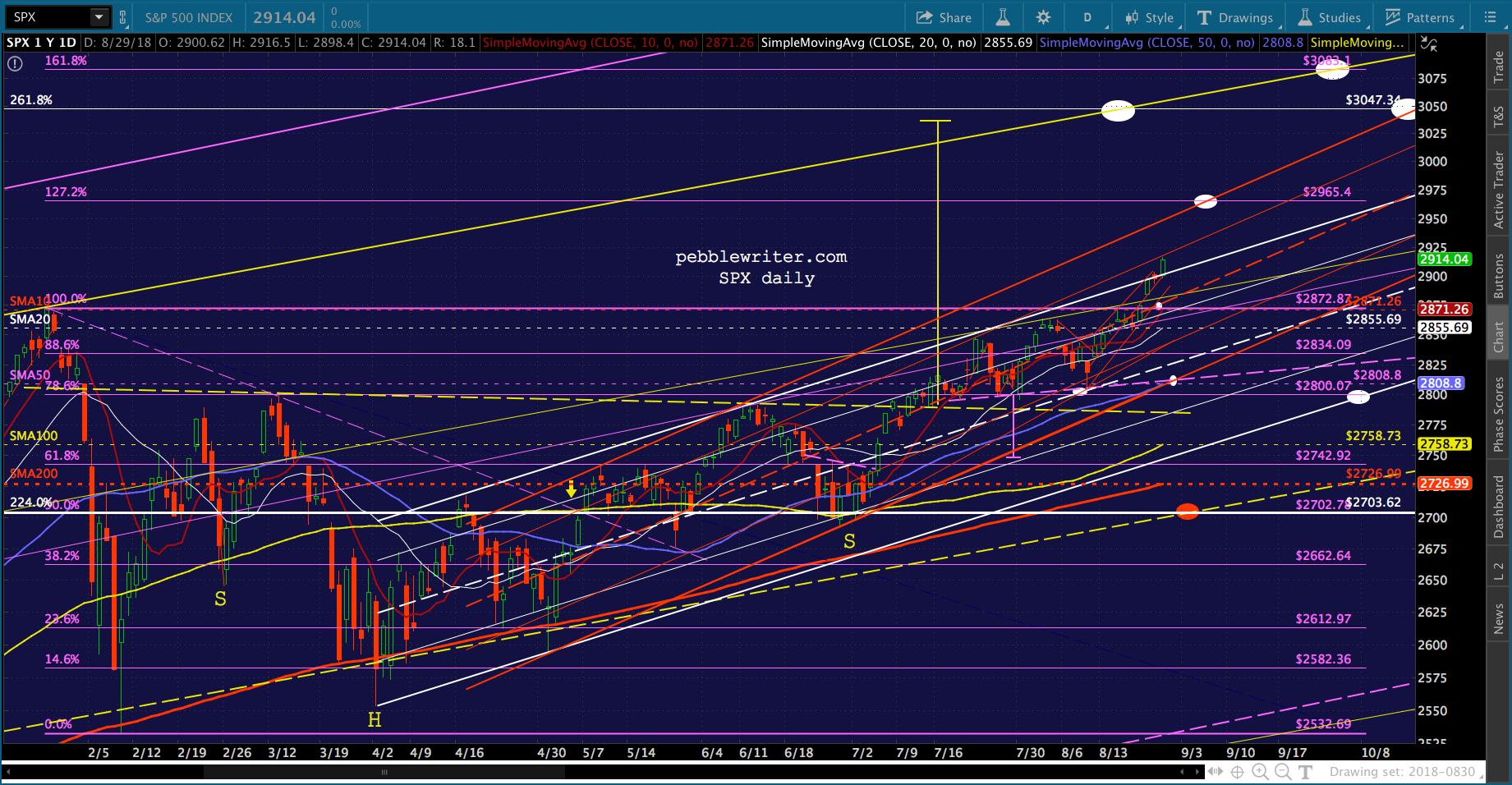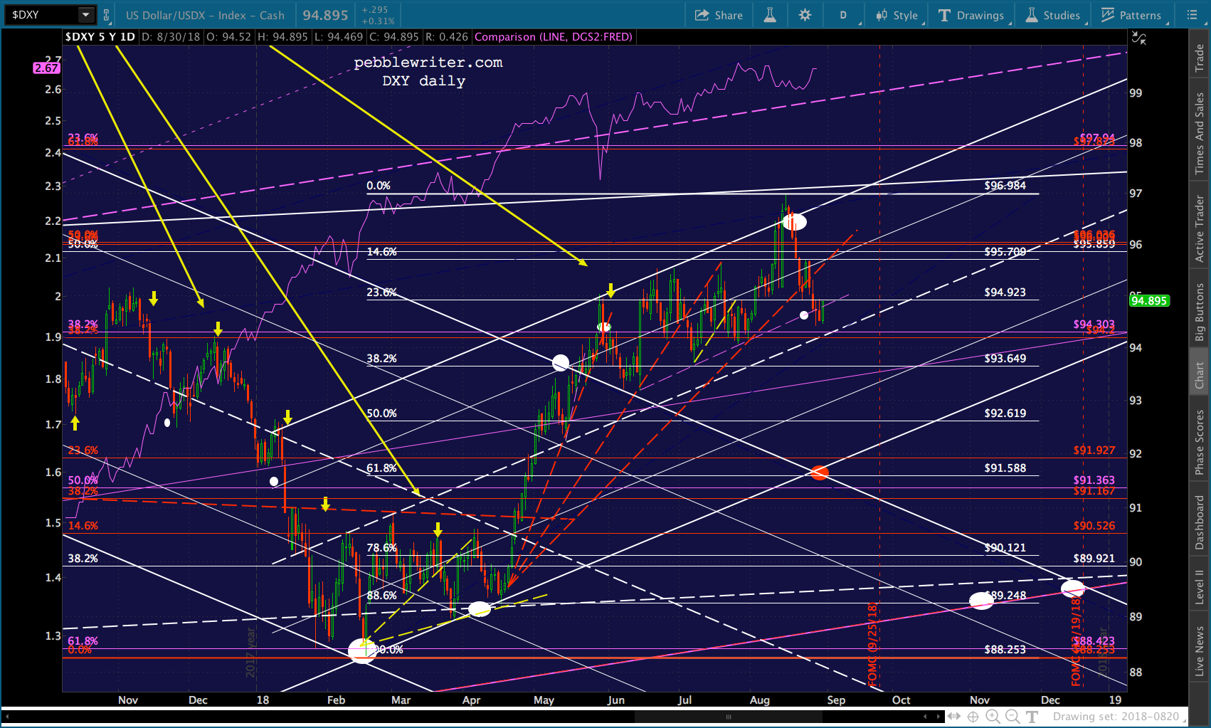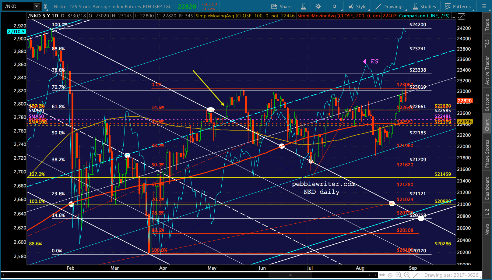 It’s worth noting that the current red channel isn’t that far off from the slope of the Nov 2017 – Feb 2018 one. In fact, if we tilt it to match, ES reaches 3076 about the time of the Sept FOMC meeting.