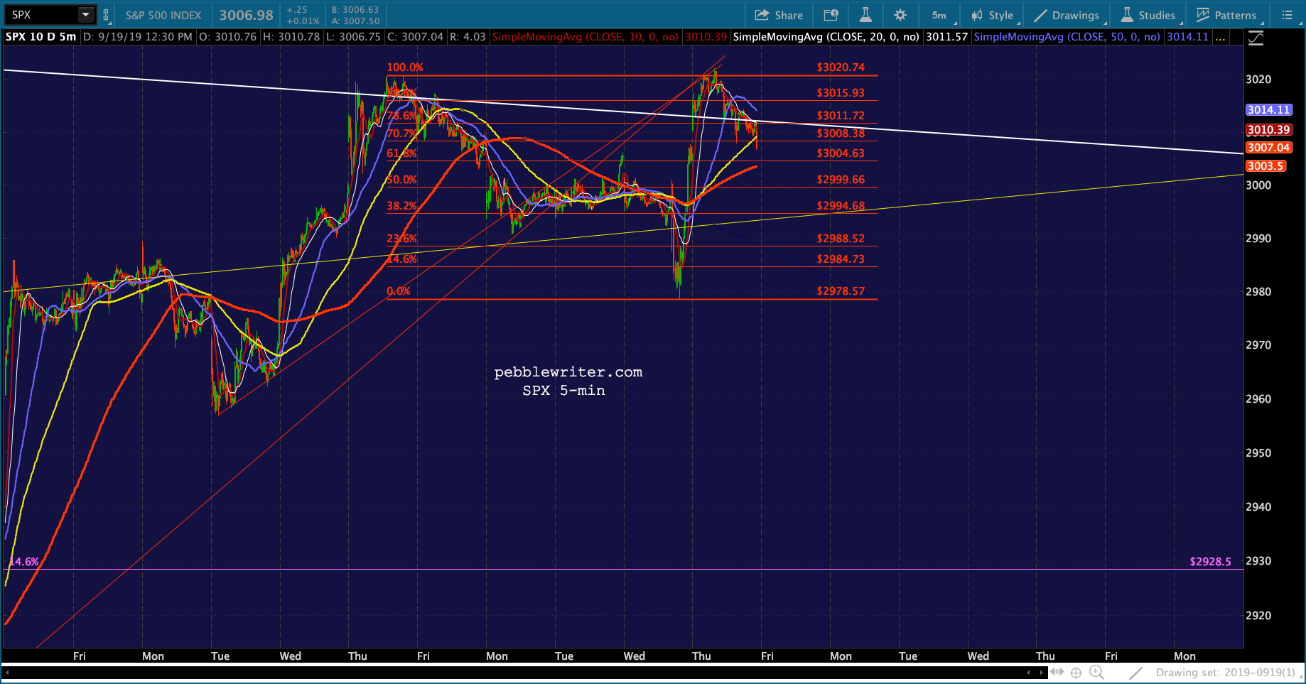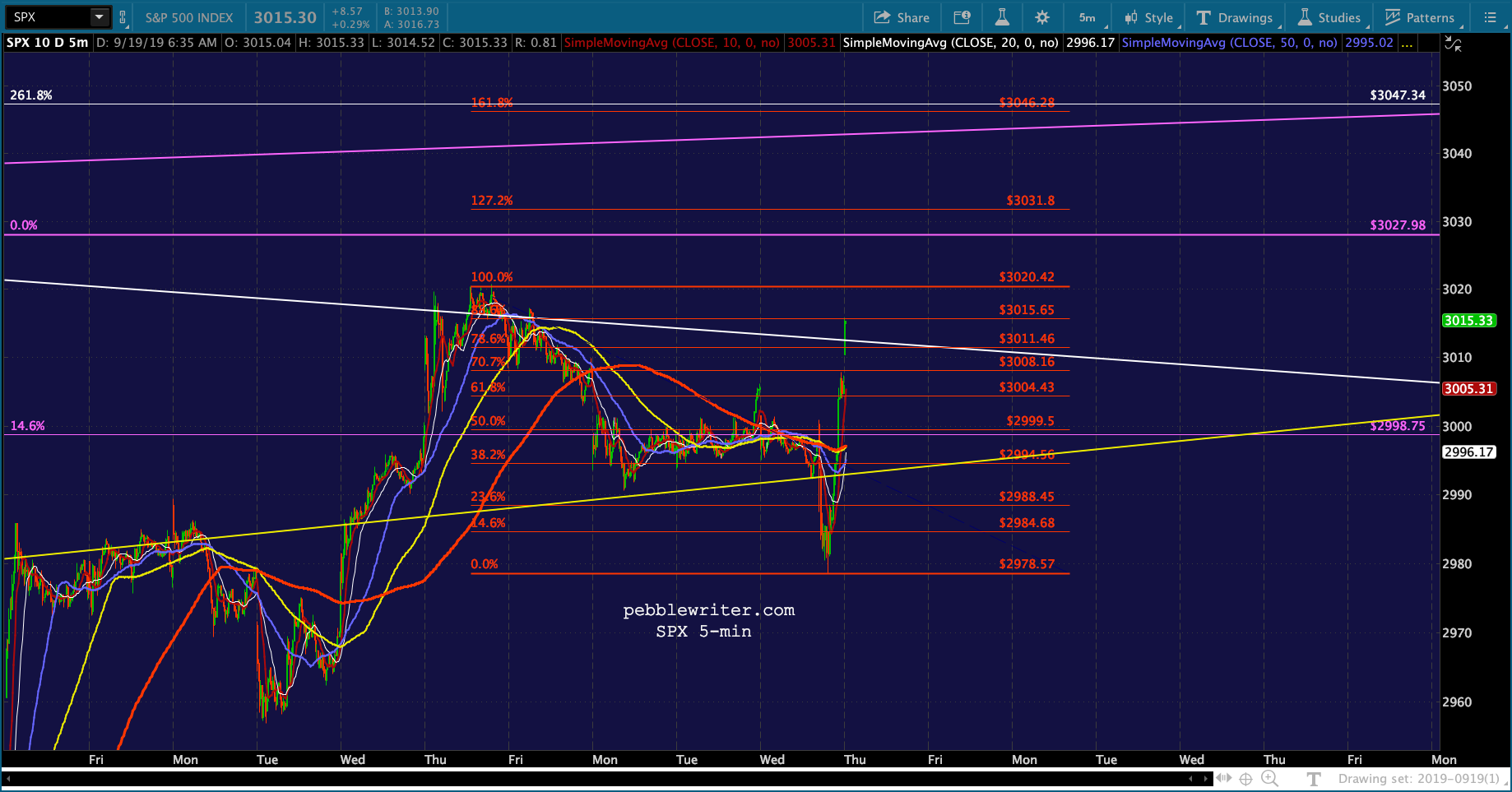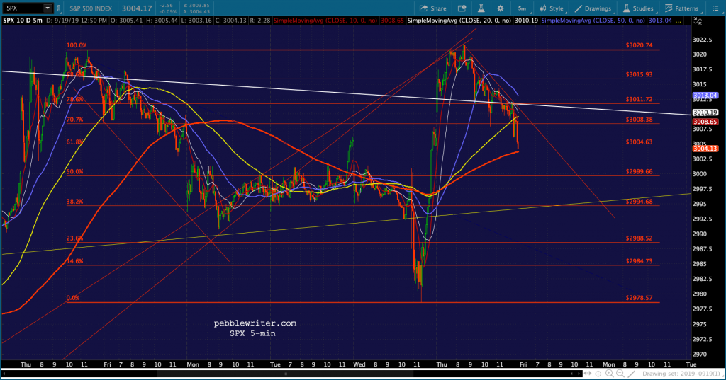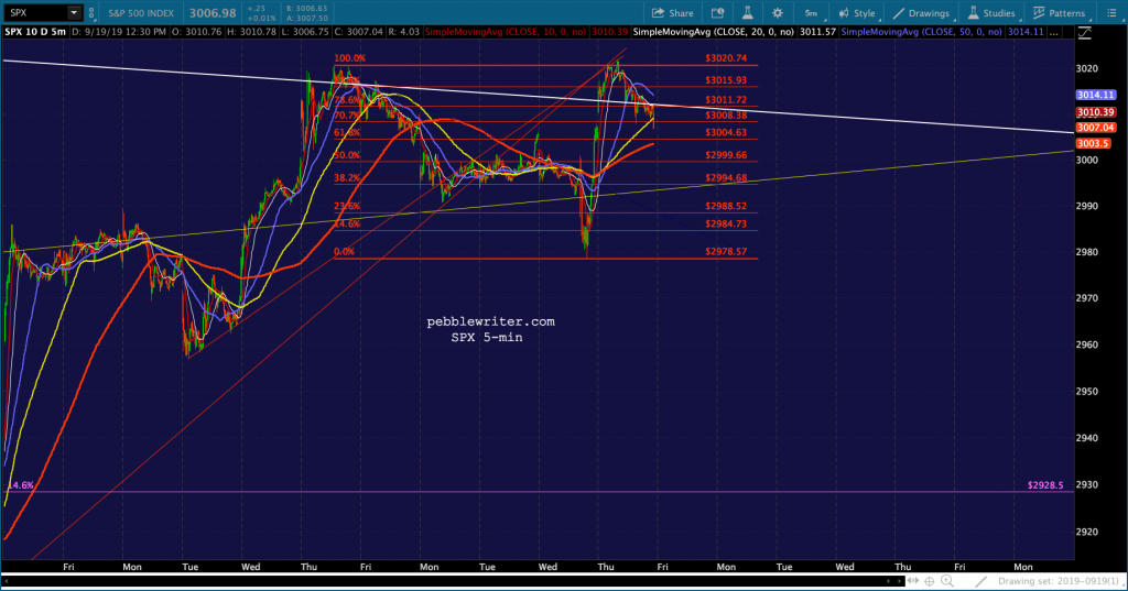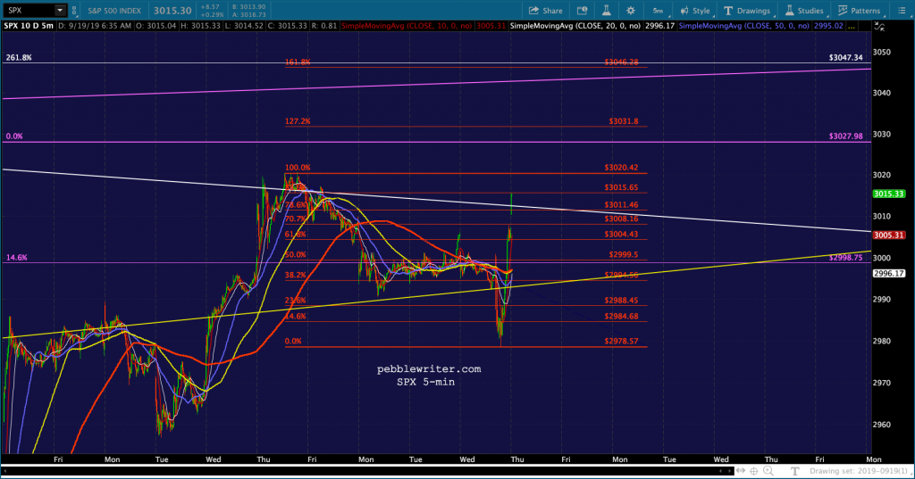 The key charts to watch today are the same as yesterday. If VIX’s .886 or lows hold today, the bears are still alive. If not, we’re looking at a retest of the 3020.42 highs, the 3027.98 highs, or the 2.618 Fib extension at 3047.34.