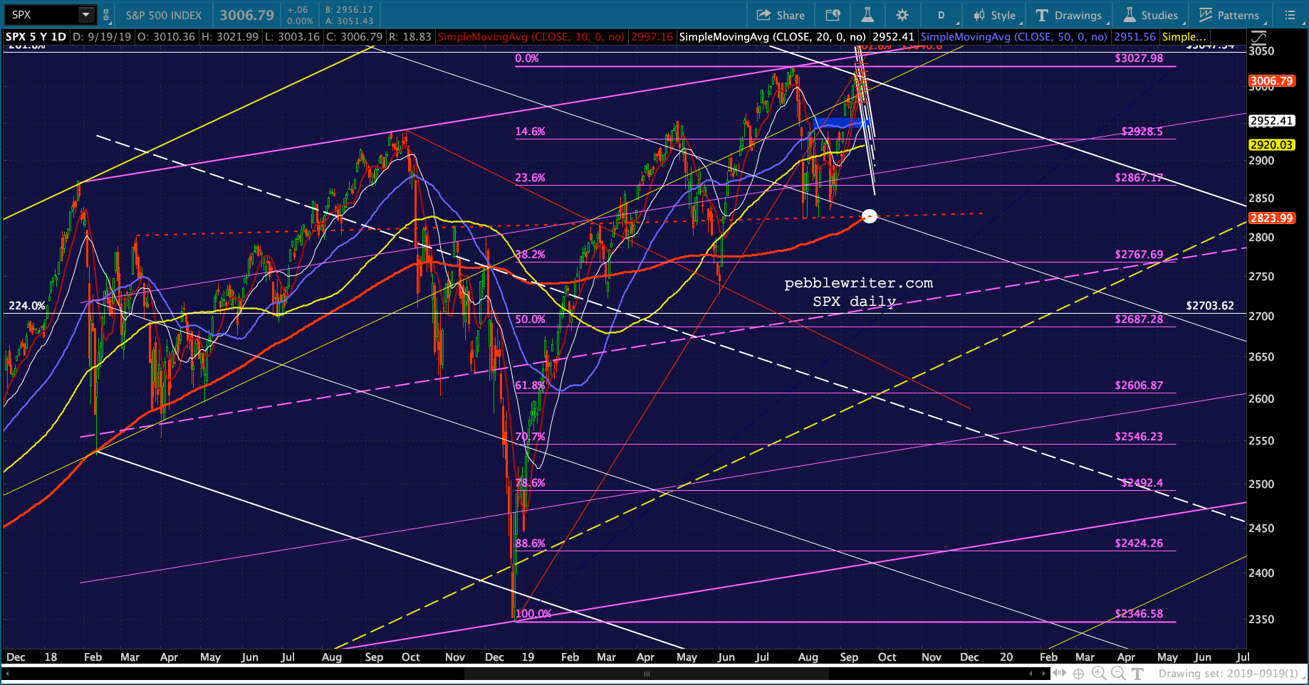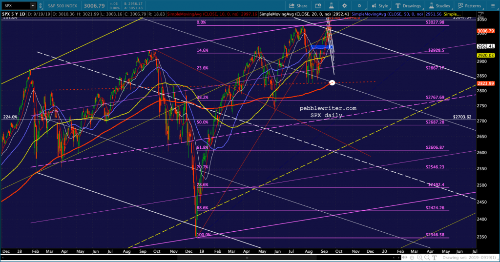 A lower low at 2816ish, sometime in the next session or two (preferably no later than Sep 25), would make for a nice corrective A-B-C wave. A higher low would suggest, at least, that SPX pop up past 3027.98.