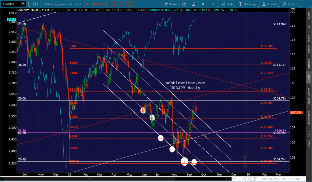 USDJPY is trying not to break down, but its red TL from Aug 25 has clearly broken — great for the bears.