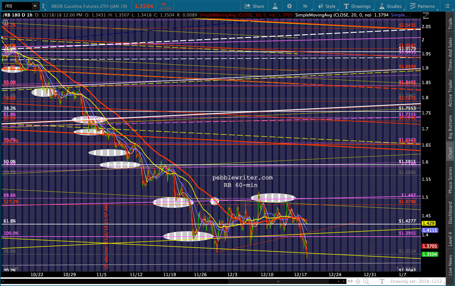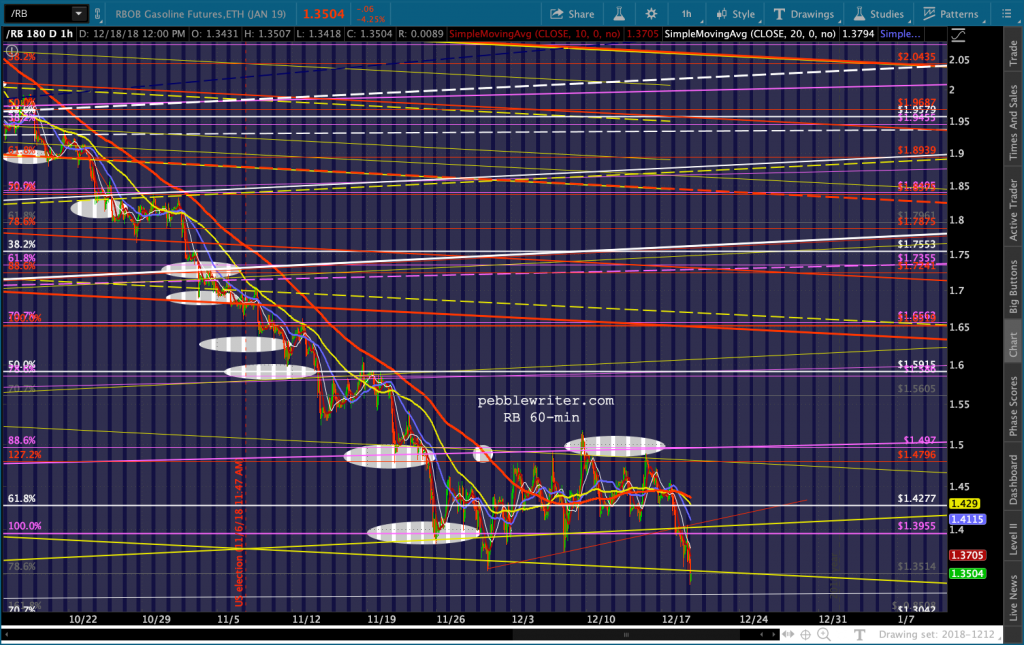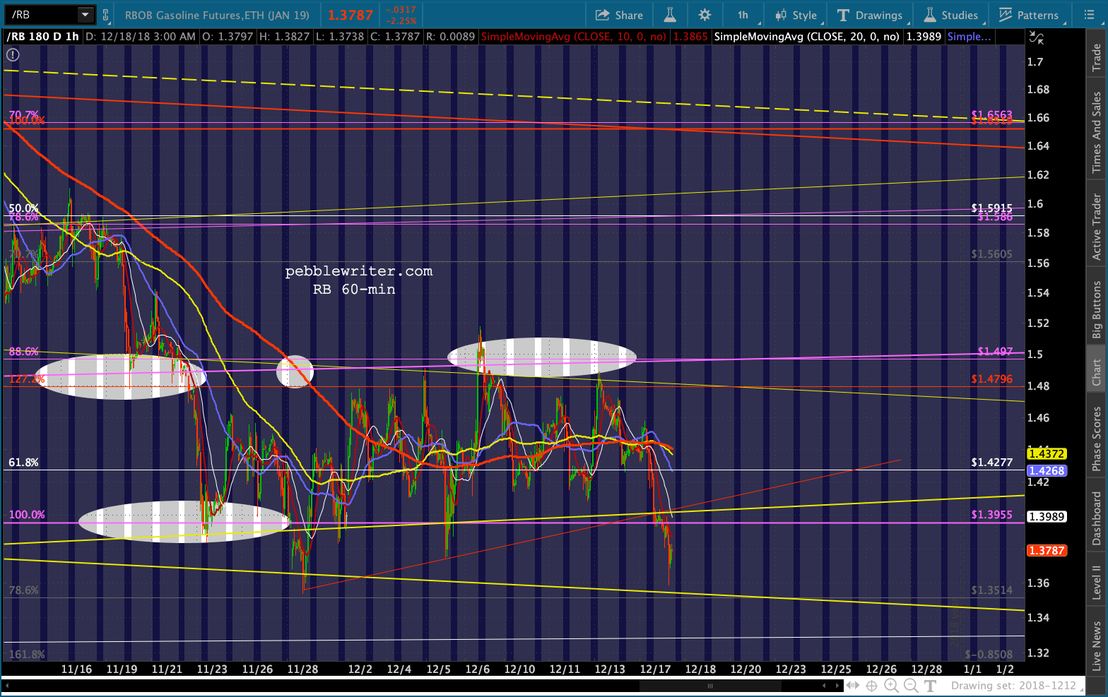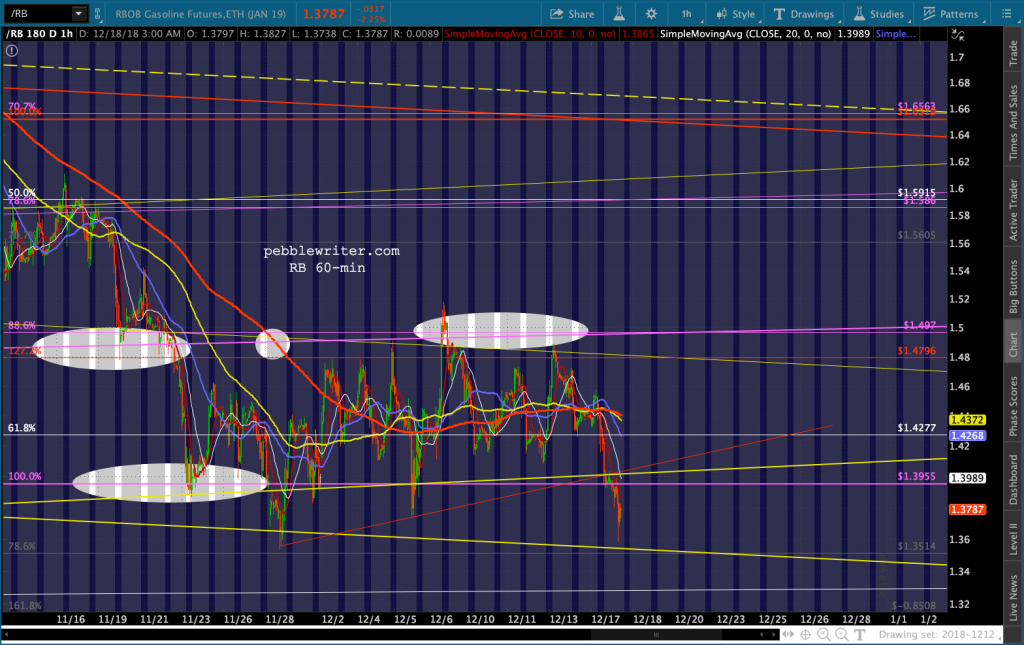 CL has reached our 46.02 downside target with the .618 at still on deck, while RB punched to slightly lower lows.