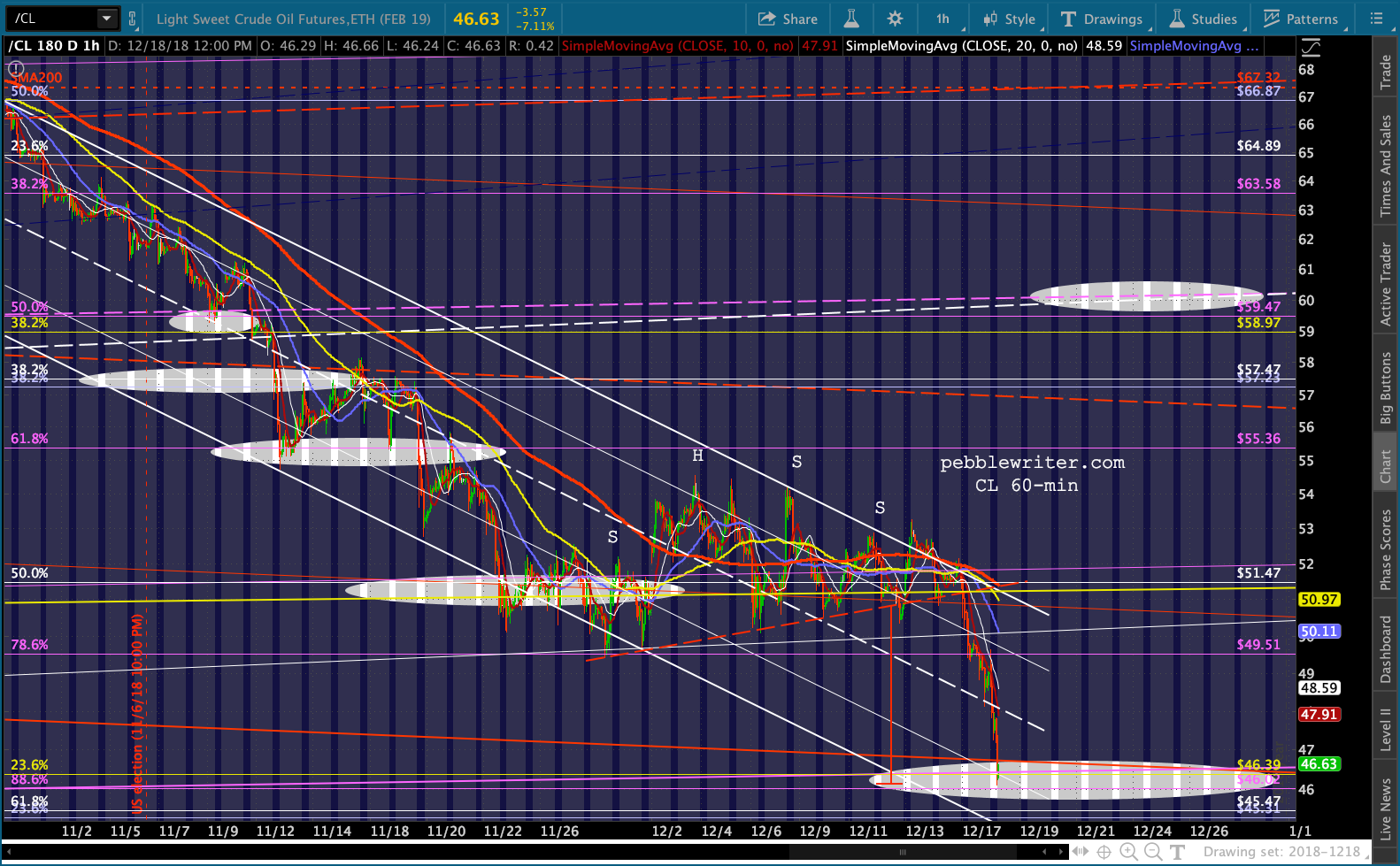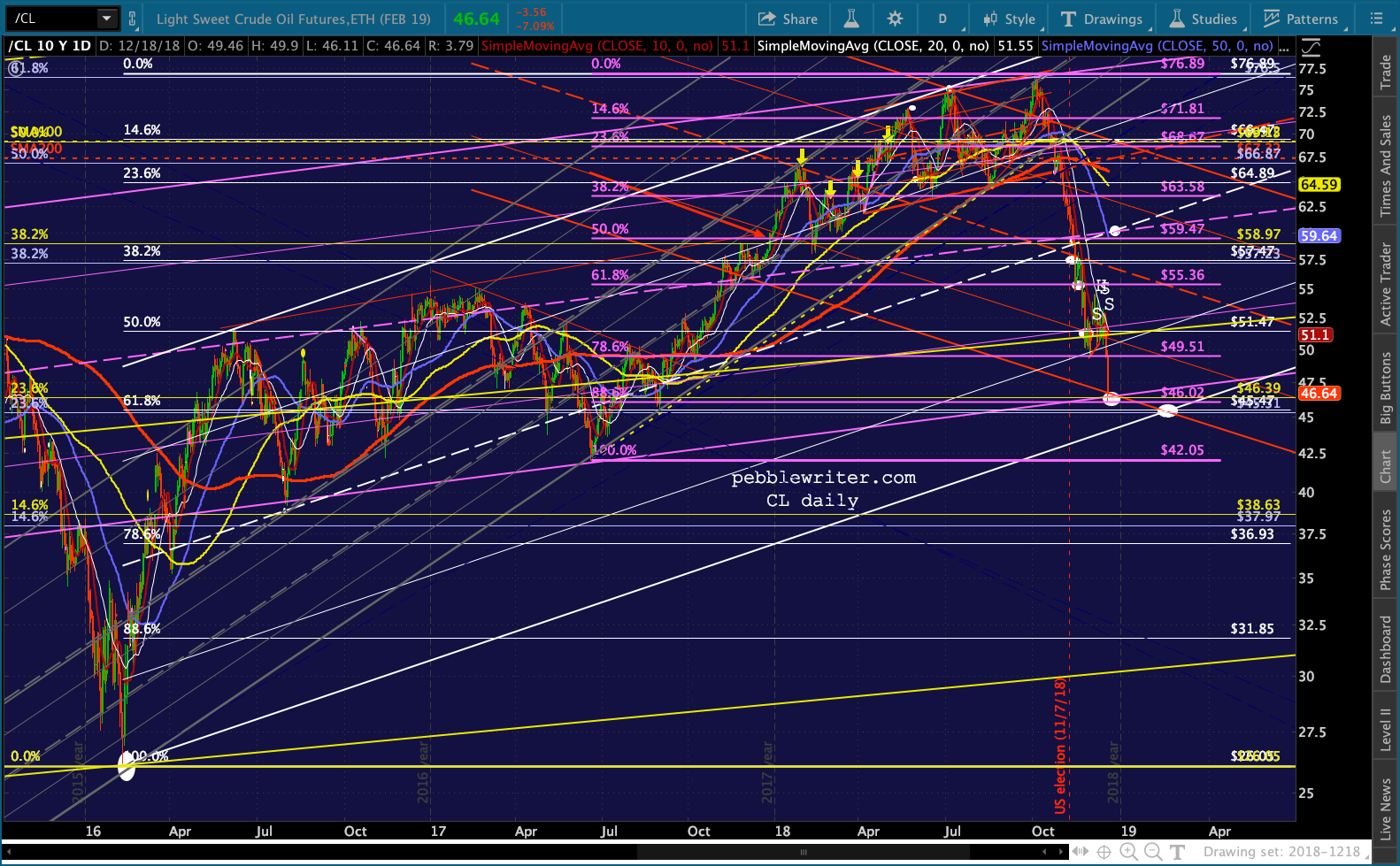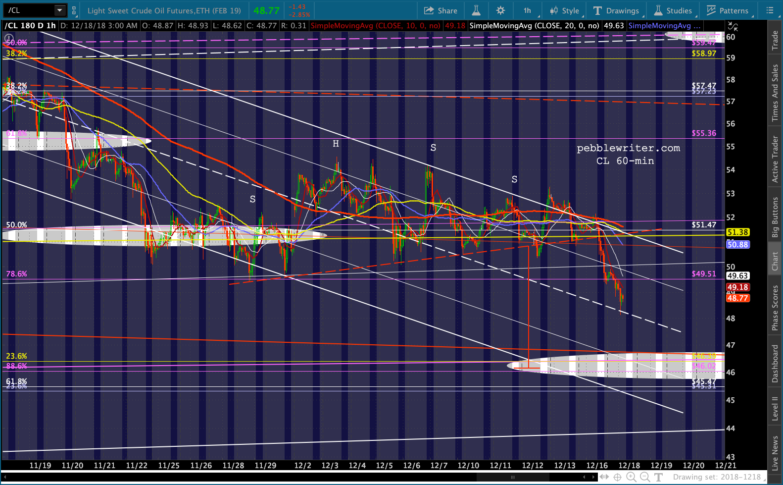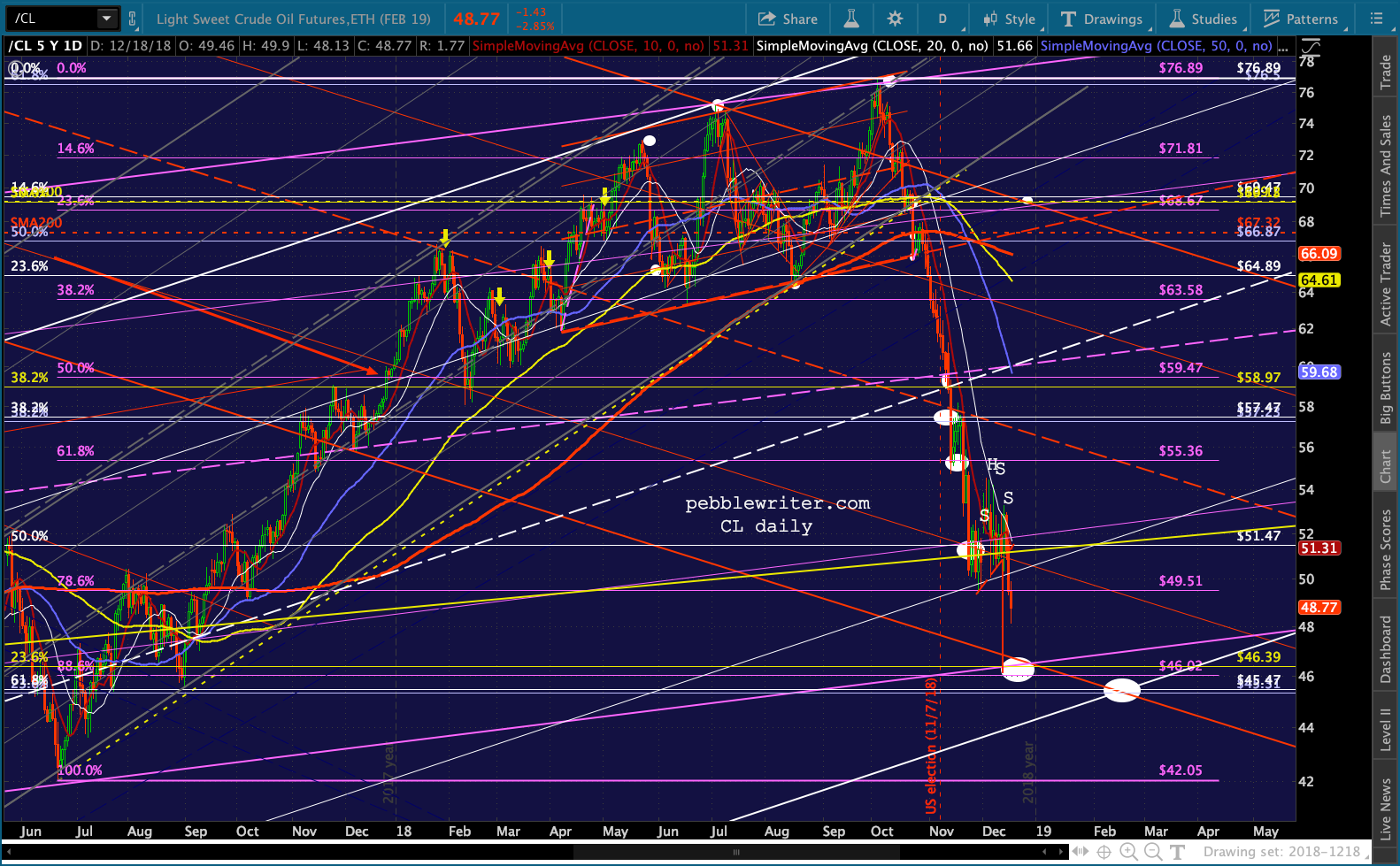 CL has reached our 46.02 downside target with the .618 at still on deck, while RB punched to slightly lower lows.