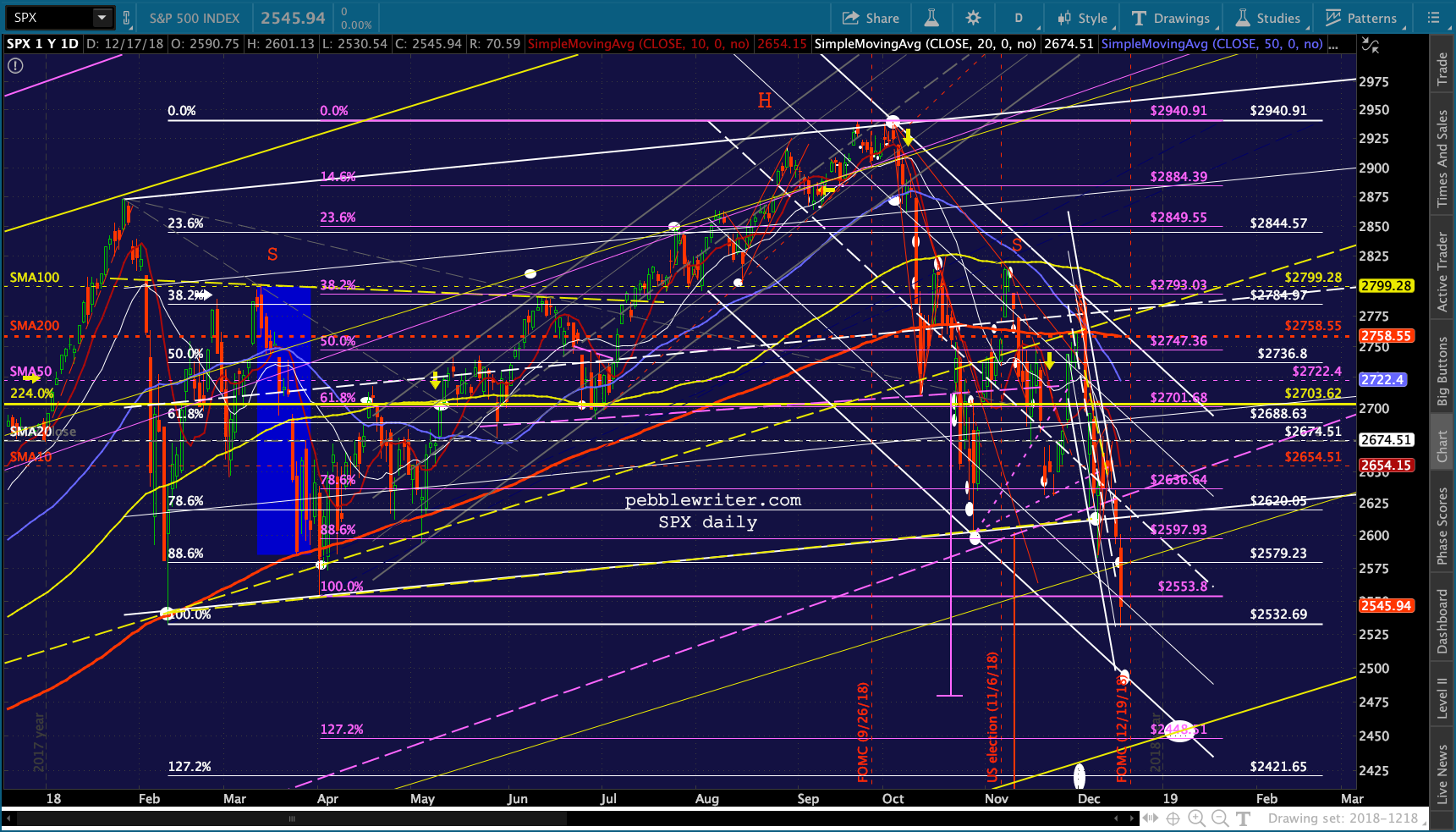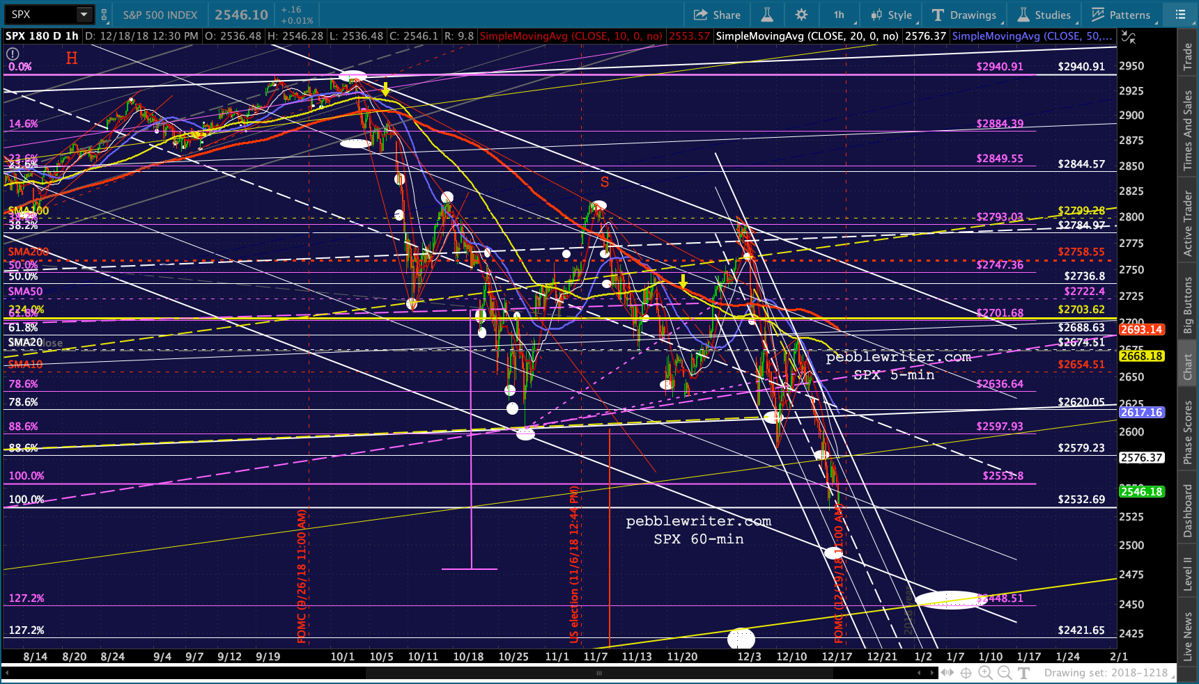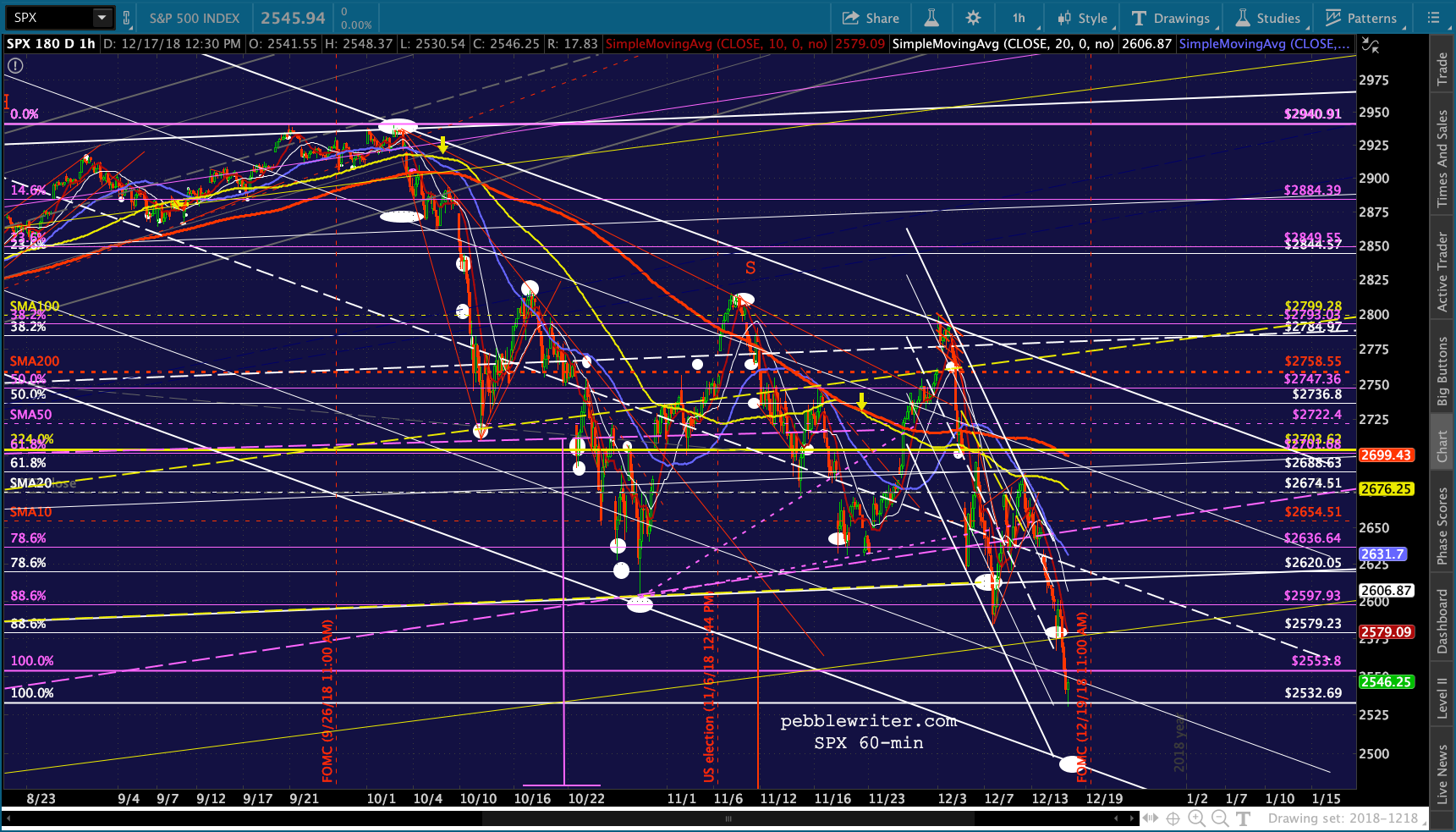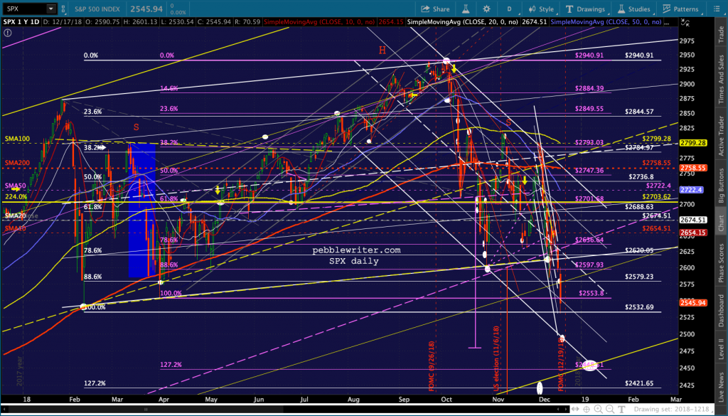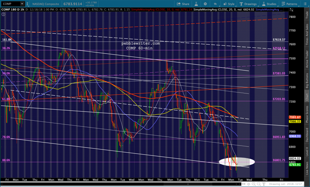 The charts don’t much care about all that. Yesterday, major indices reached tipping points below which things could get really ugly. Once such index we’ve focused on lately is the Nasdaq Composite (COMP.) Yesterday, it reached our downside target from October [see: Plan B] and, after a great deal of consternation, put in a bounce.