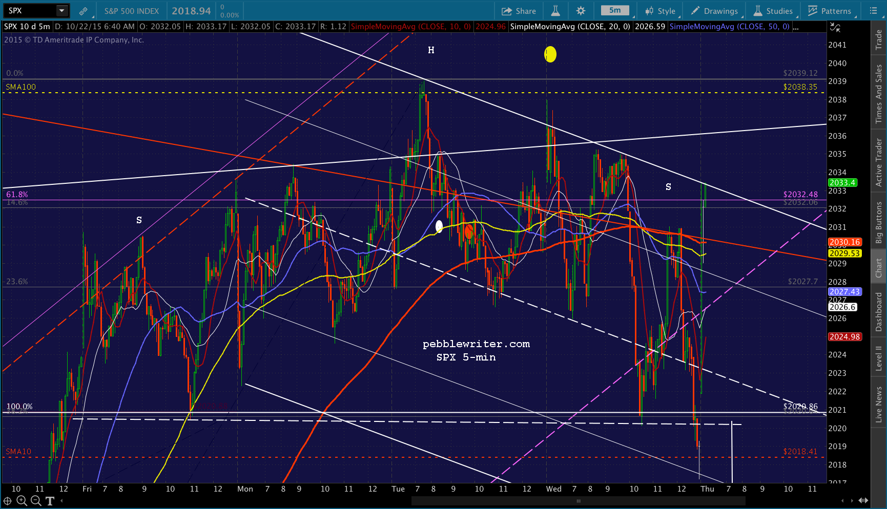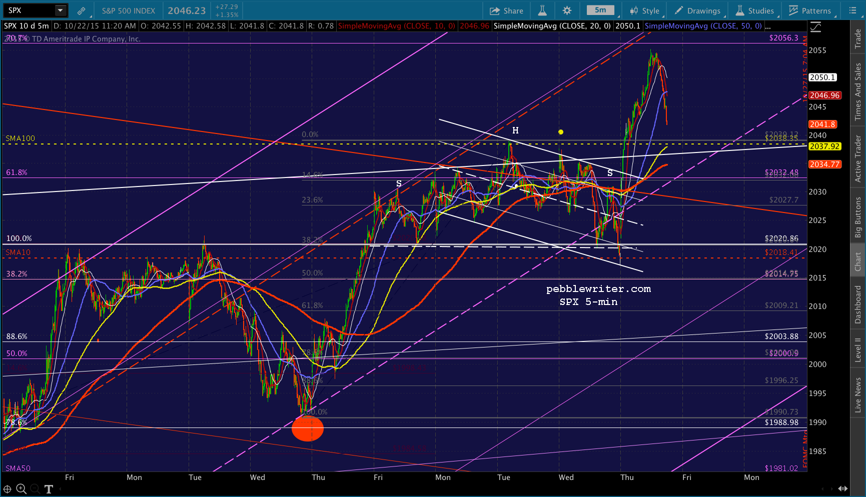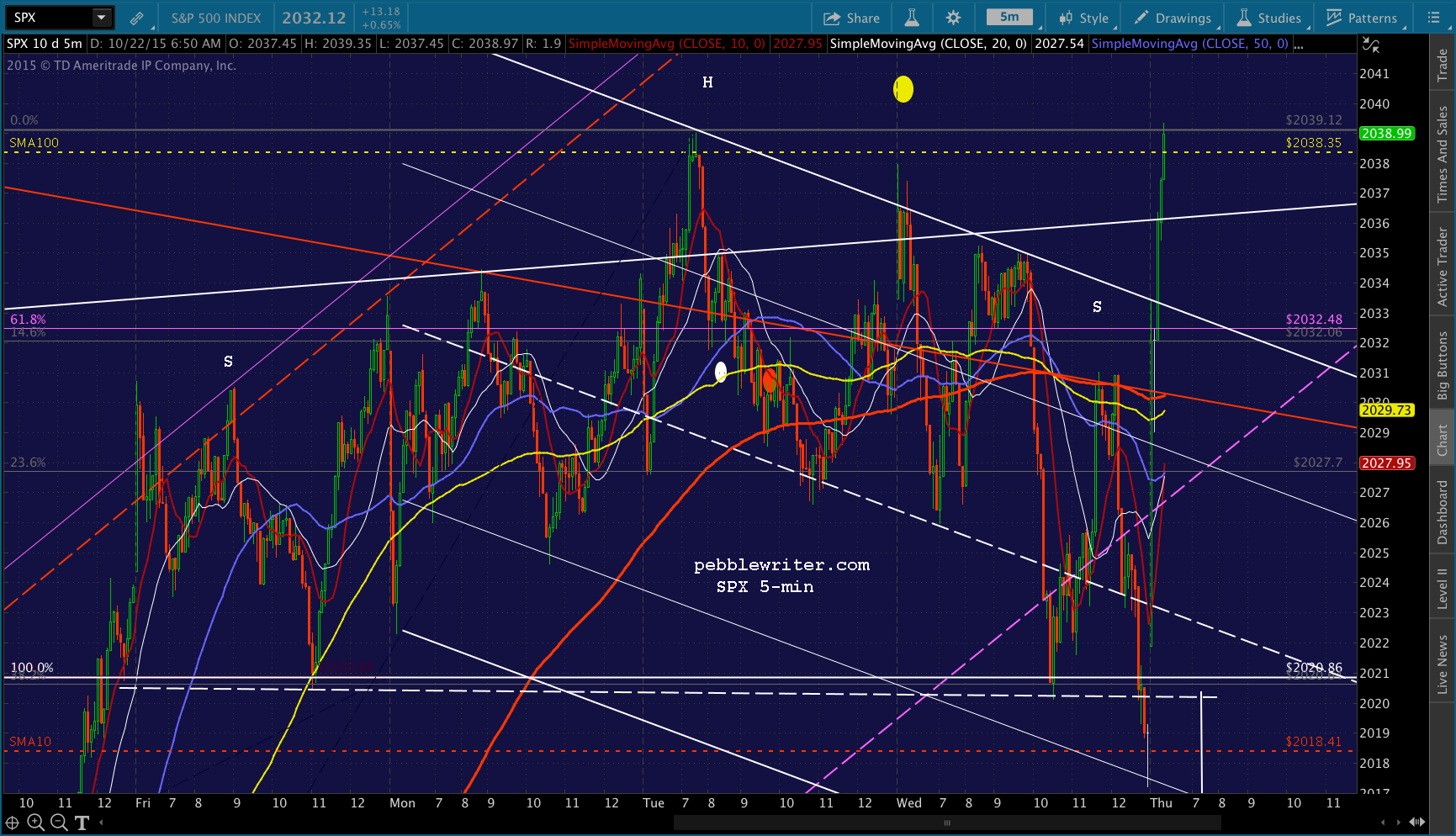 So far, so good. I’m planning on closing the short at about 2038ish. The daily SMA100 is at 2038.35 based on yesterday’s close, and the 5-min SMA100 is nearly there.