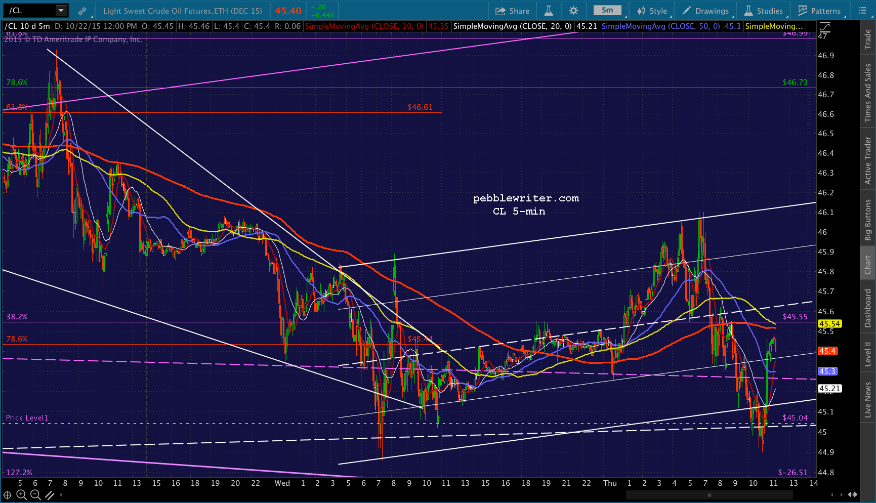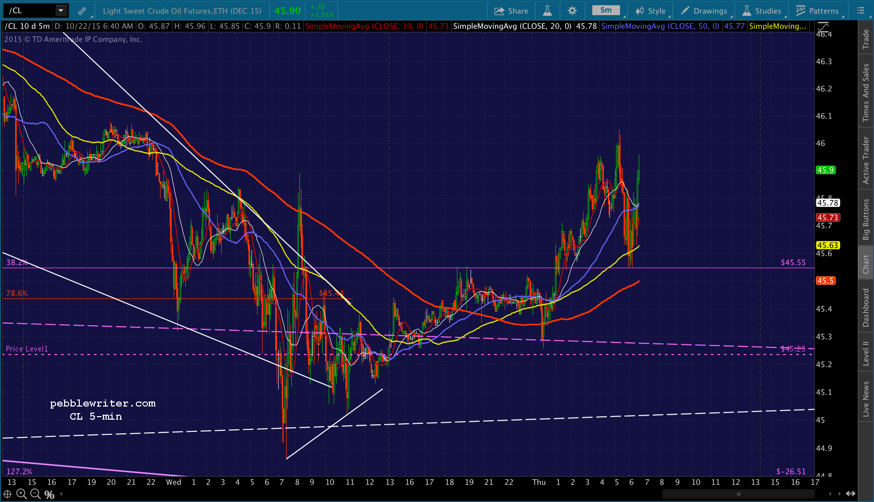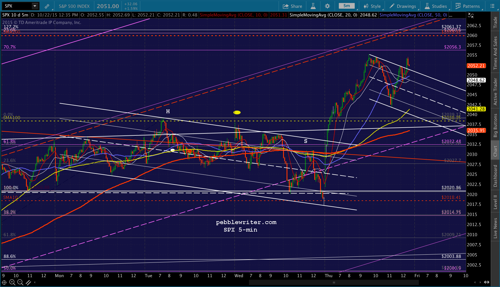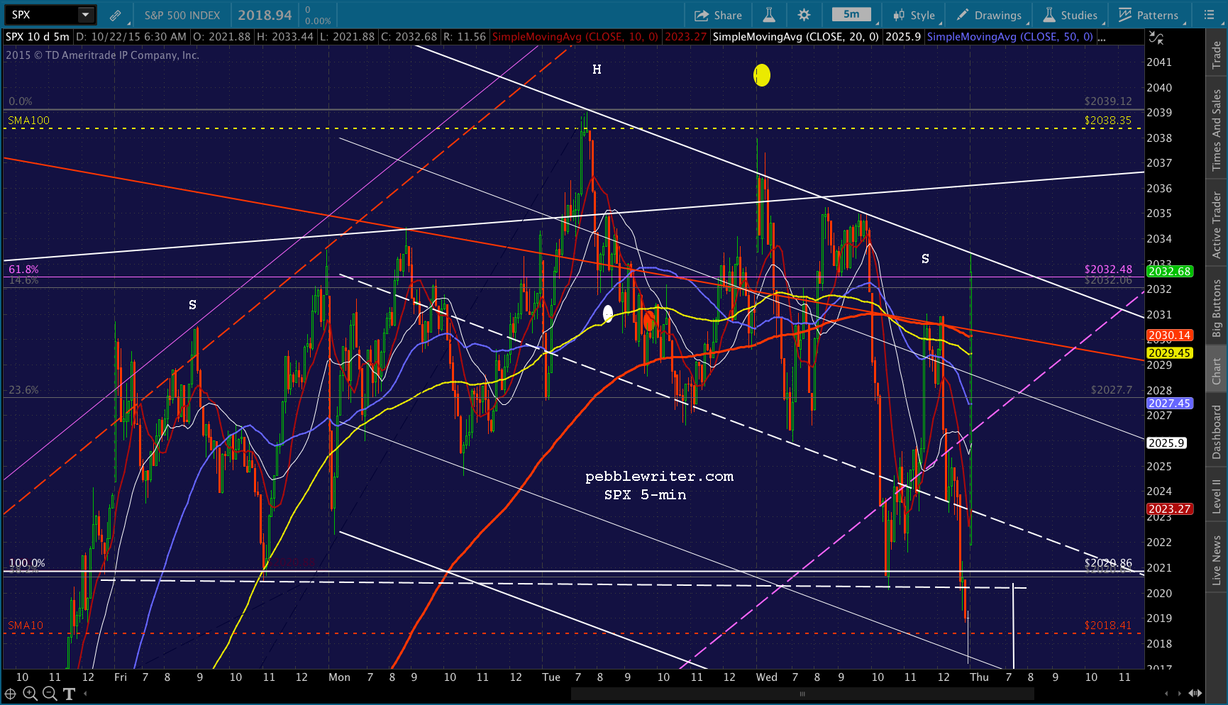 So far, so good. I’m planning on closing the short at about 2038ish. The daily SMA100 is at 2038.35 based on yesterday’s close, and the 5-min SMA100 is nearly there.