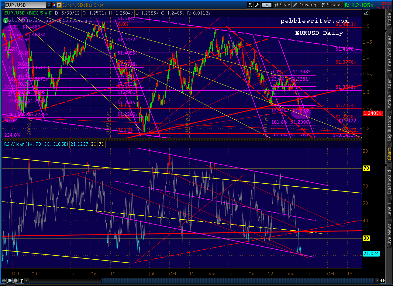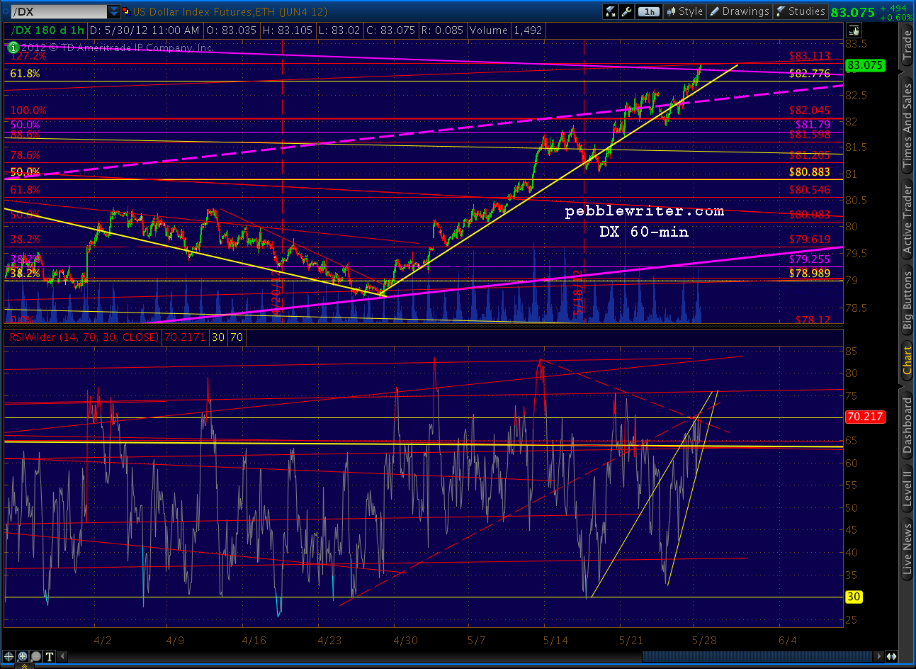 If we close above the most recent fan line and can manage to stay in the channel, I’d consider that a bullish sign. At some point we’ll break out of the big channel (red, dashed) governing RSI since January. The (supposed) cure for what ails the financial world is more back stopping of credit — especially for the euro zone. I can’t think of a more bullish development — at least in the short run.