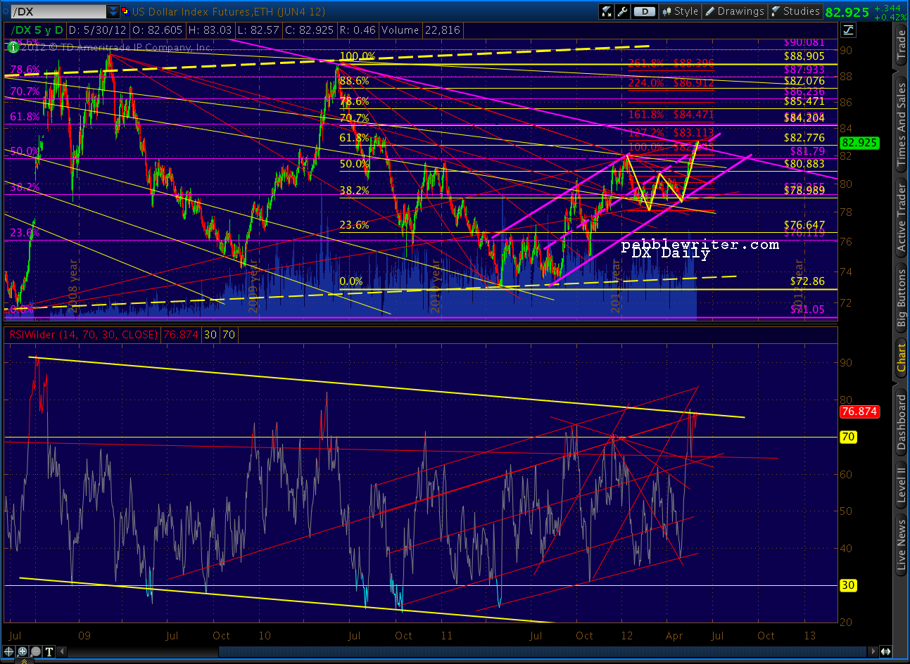 The EURUSD, in the meantime, seems to be also seeking a bottom. The pair is resting on a fan line from the 2008 top, as well as the 1.272 reversal (small purple pattern) of the Jan-Feb rise. So far, we’ve managed to stay within the smaller, steeper channel (solid purple) we discussed in Monday’s post [see: A Most Lenticular Market.]