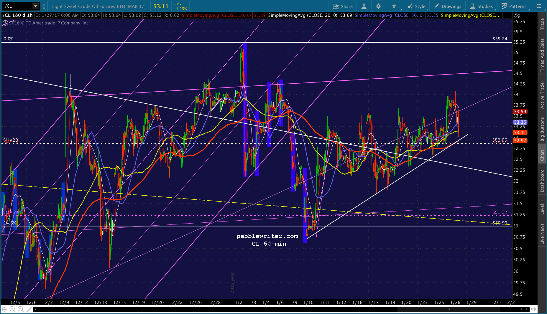 And, CL has been building a TL of support ever since the rising purple channel broke “down.” This, in addition to the SMA10 and SMA20 at 52.86.