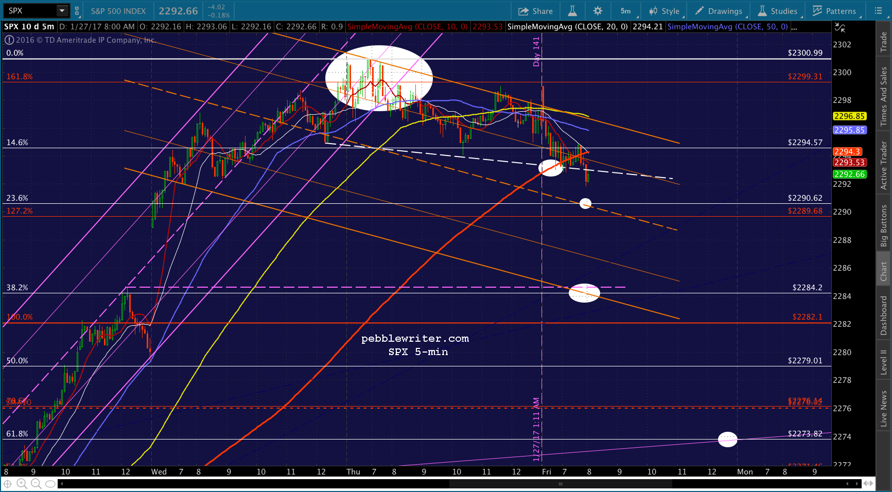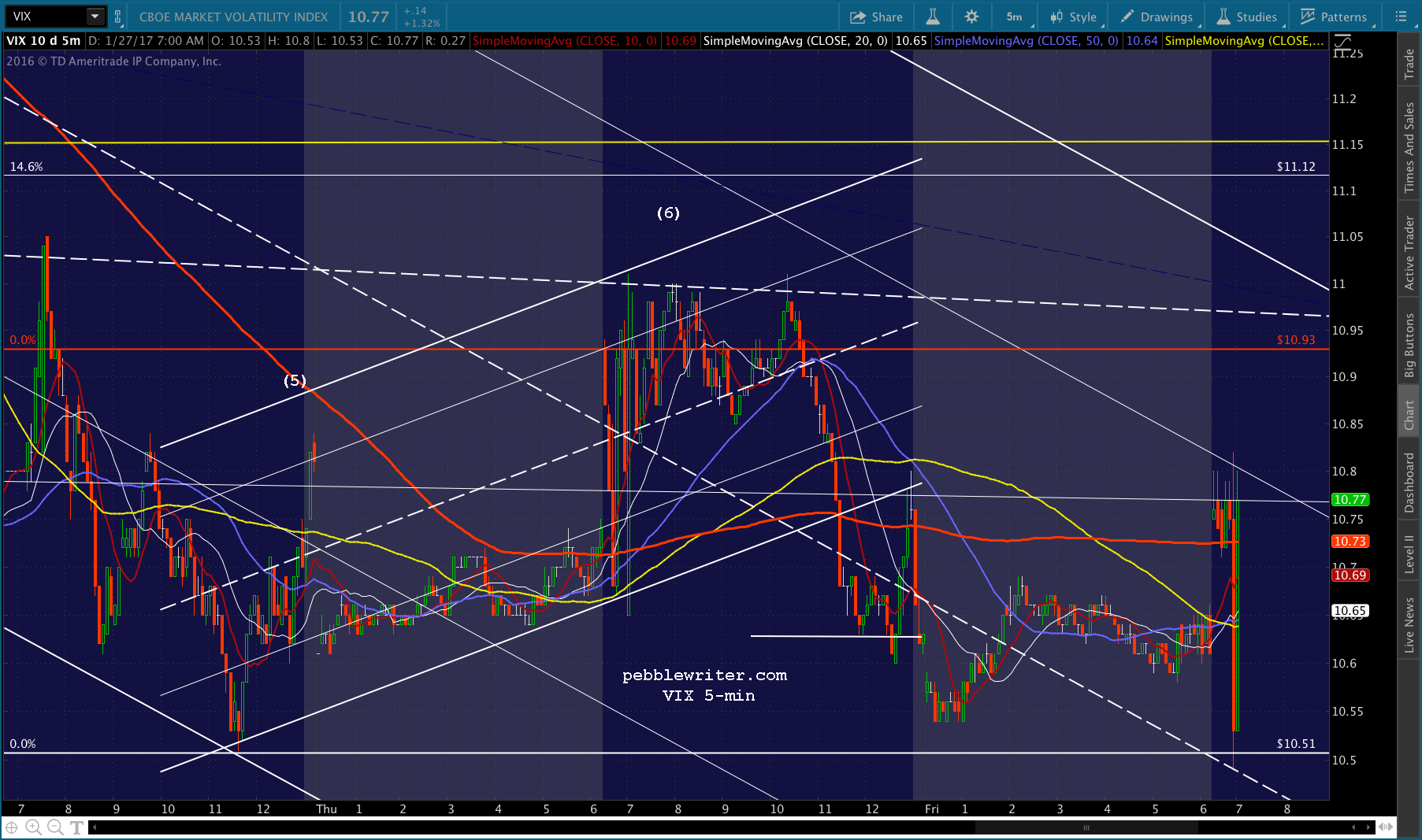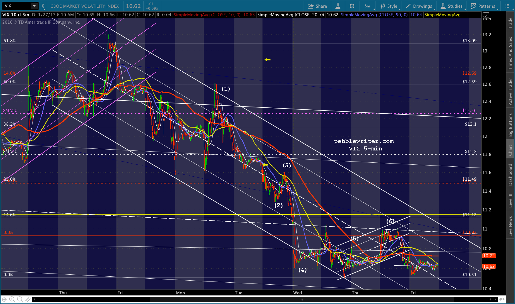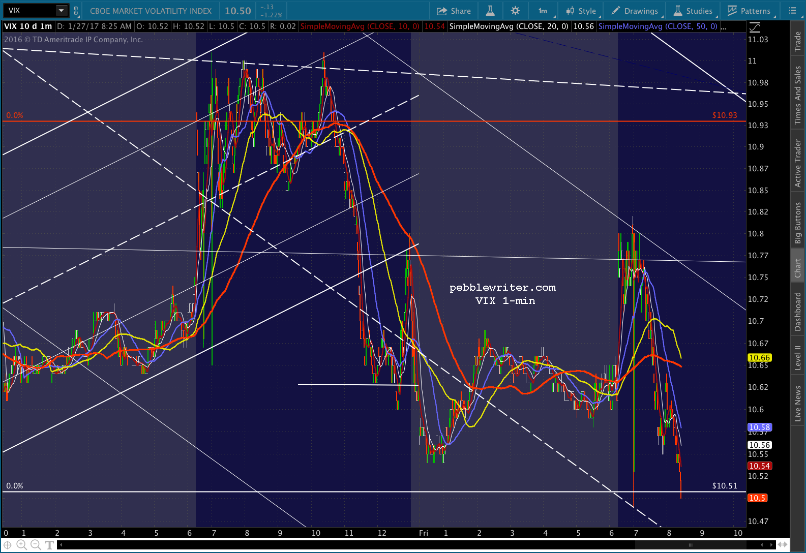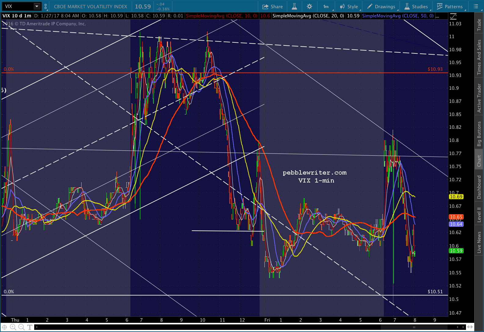 SPX just broke below the little white TL and is trying to make its way south. But VIX continues to be forced lower. Note that ES just reached itty bitty channel support at its .236, so we’ll continue to watch for intervention.