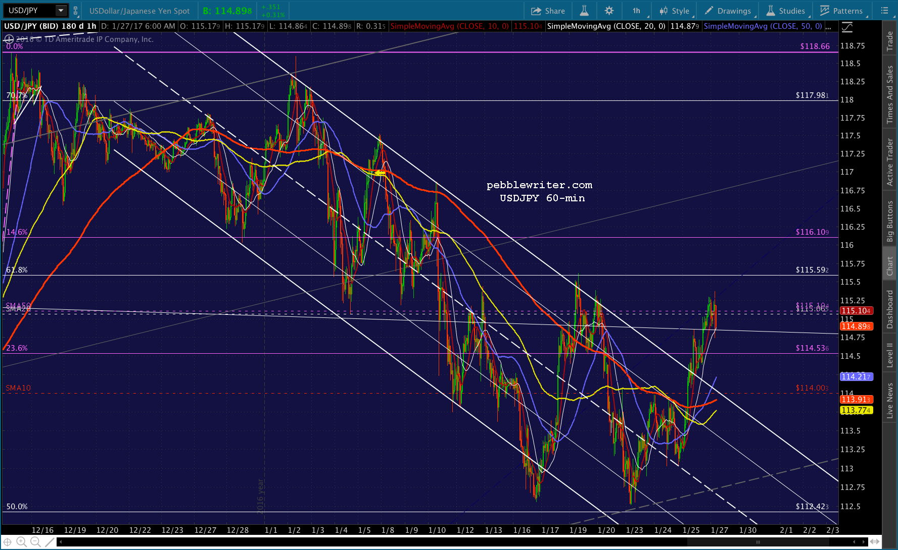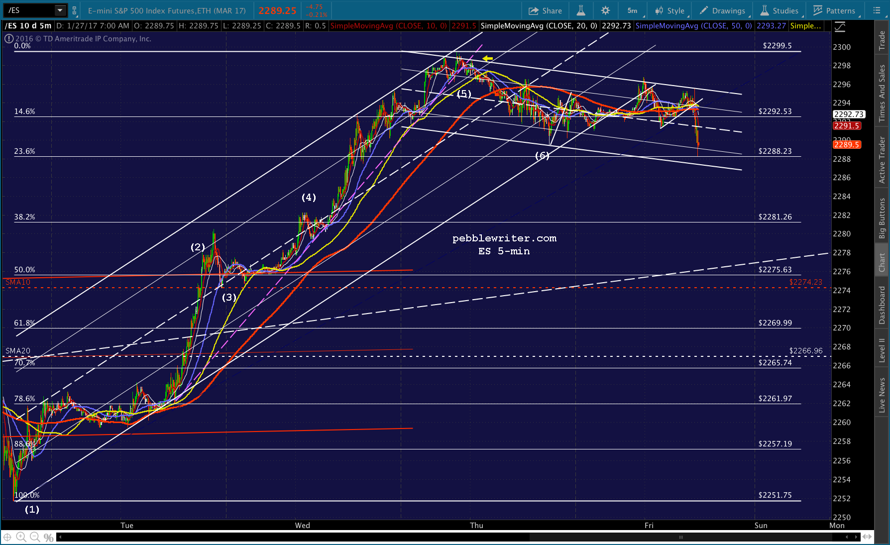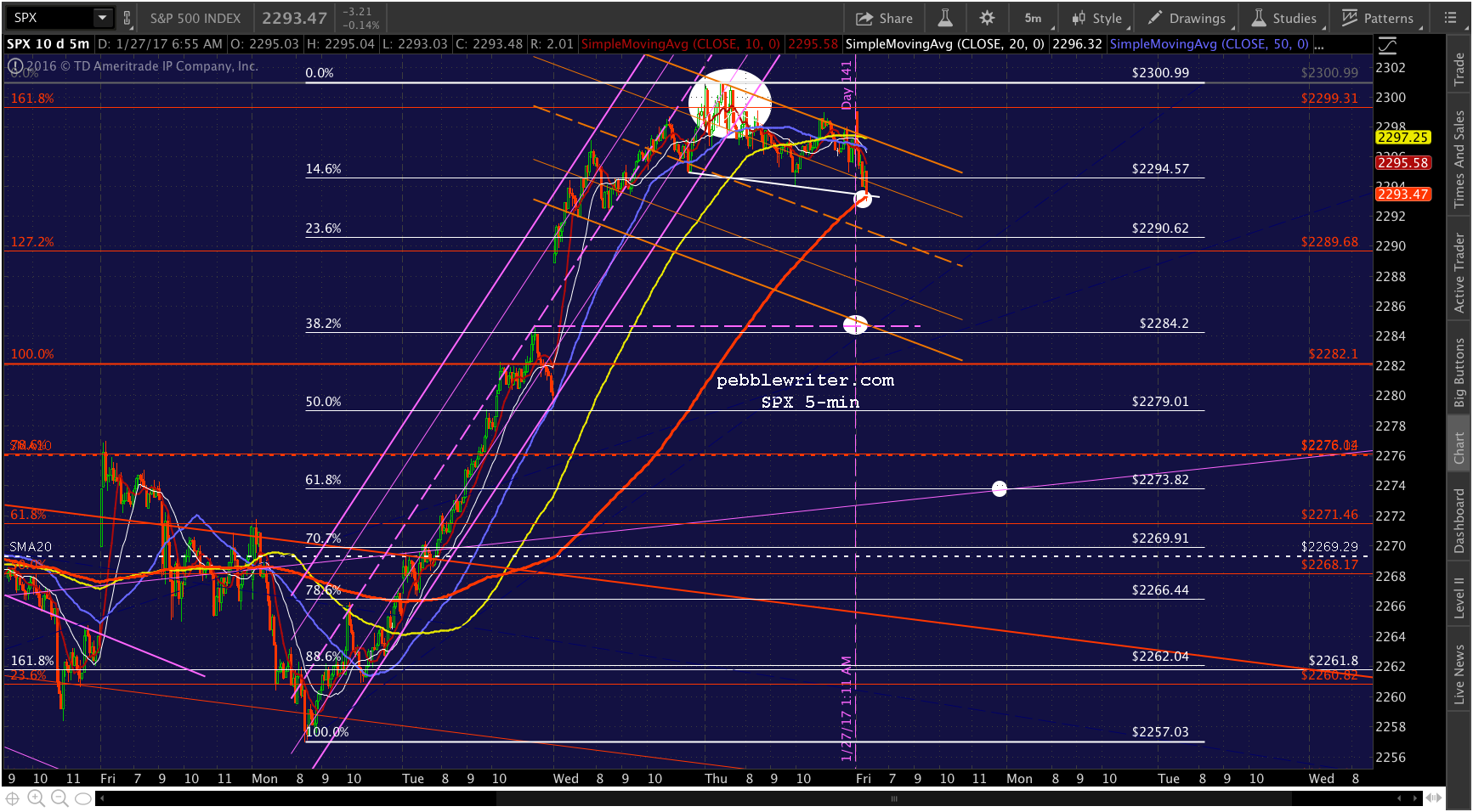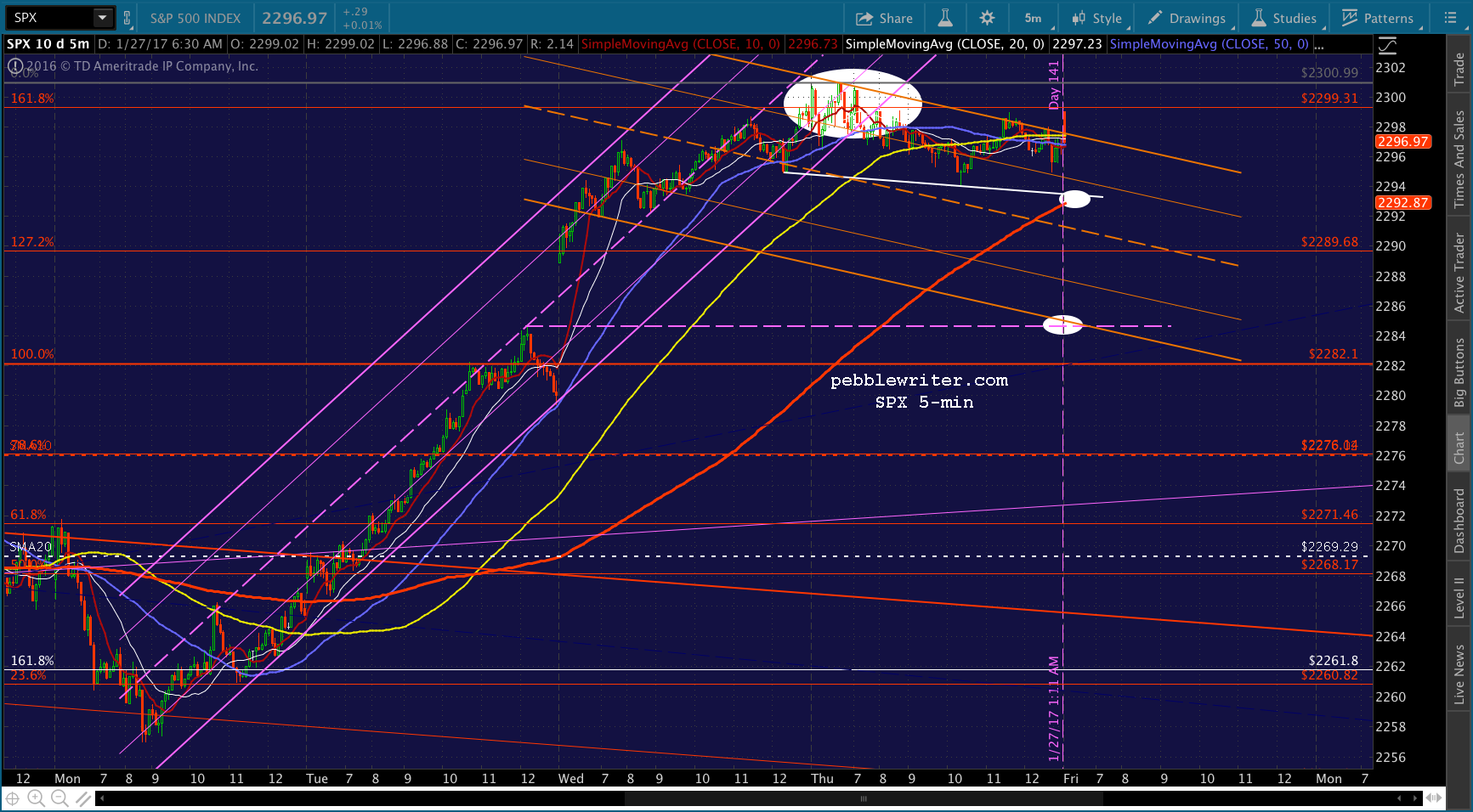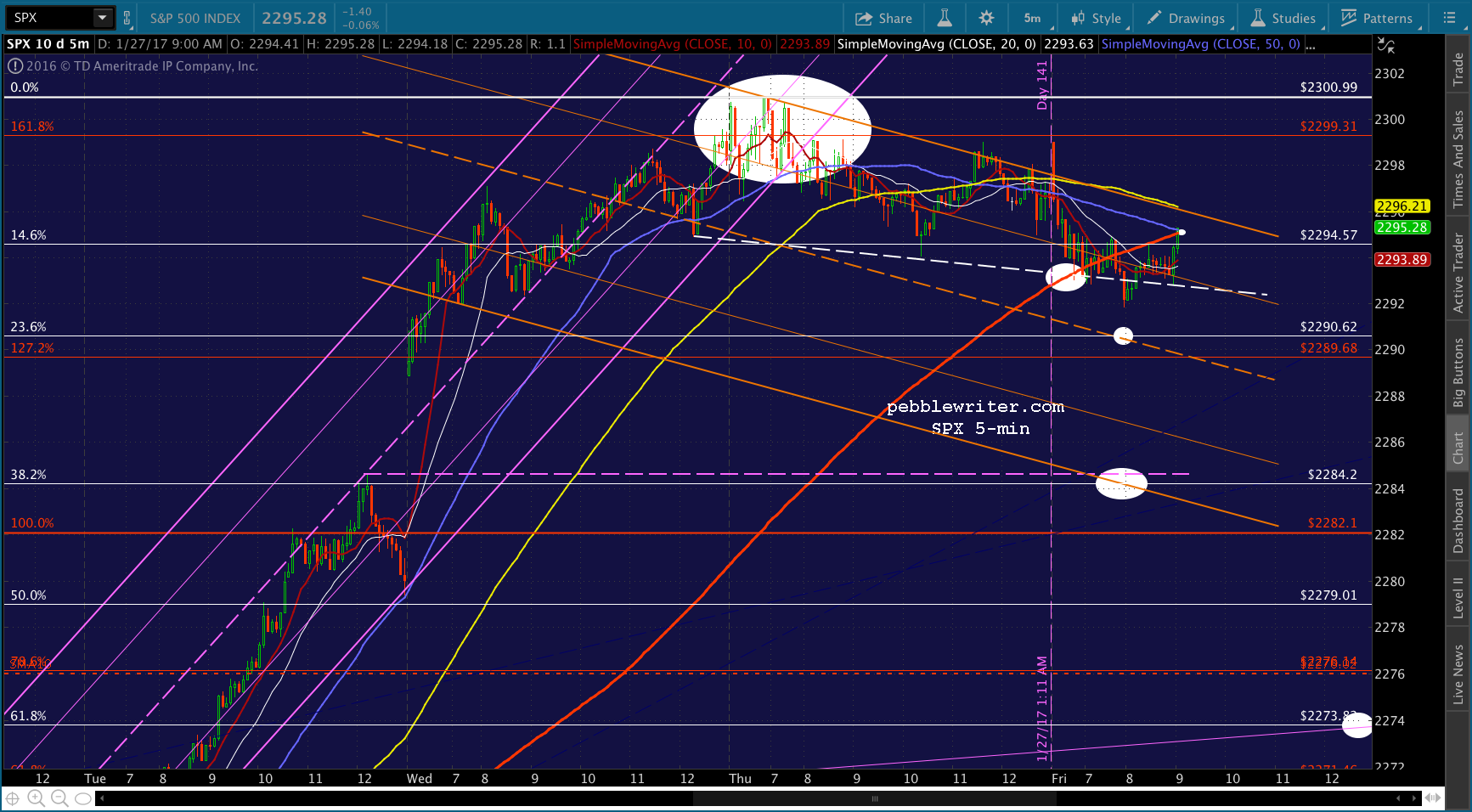 SPX just broke below the little white TL and is trying to make its way south. But VIX continues to be forced lower. Note that ES just reached itty bitty channel support at its .236, so we’ll continue to watch for intervention.