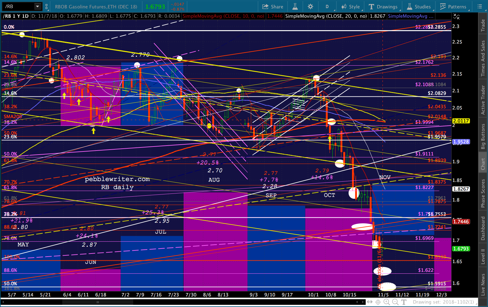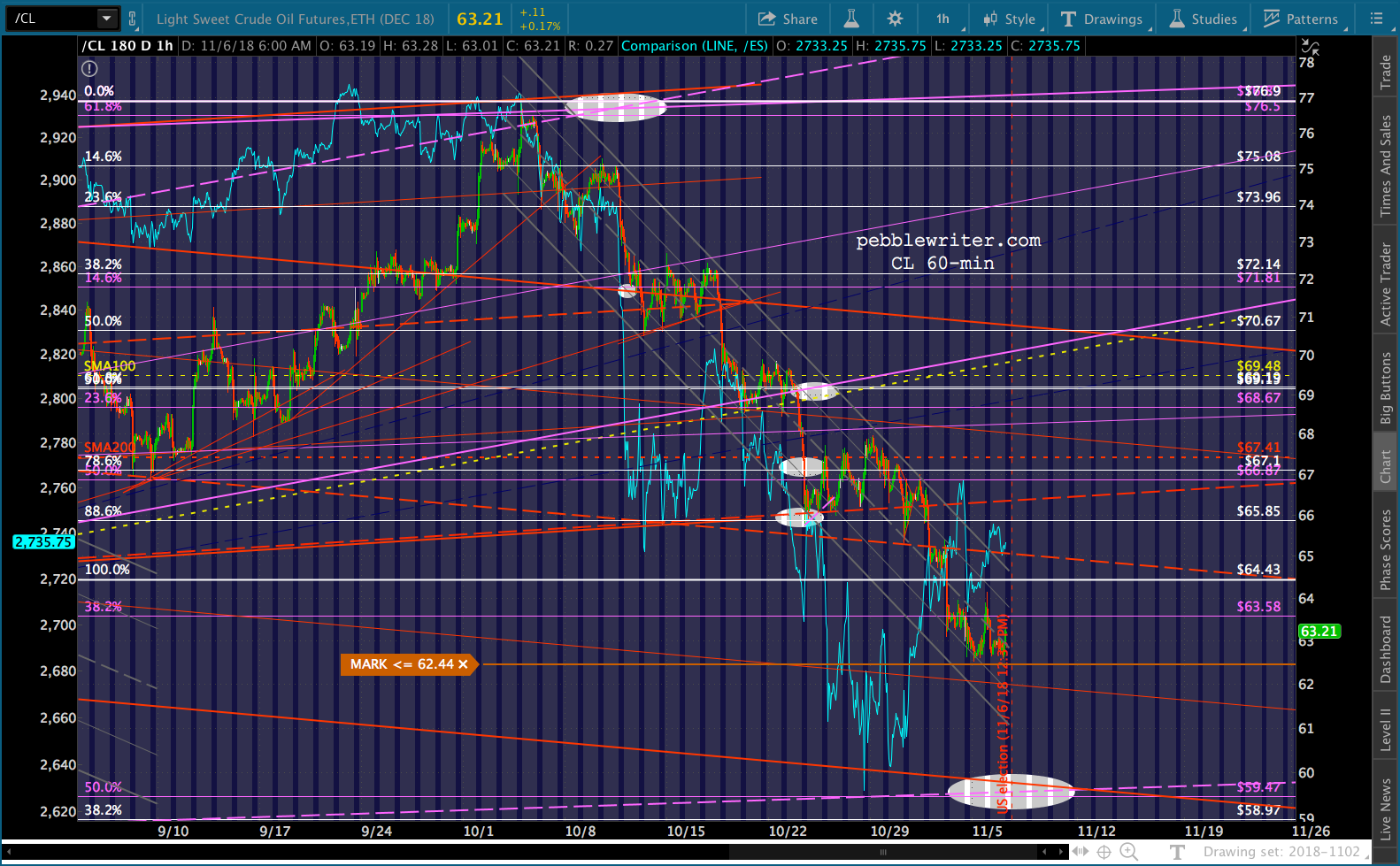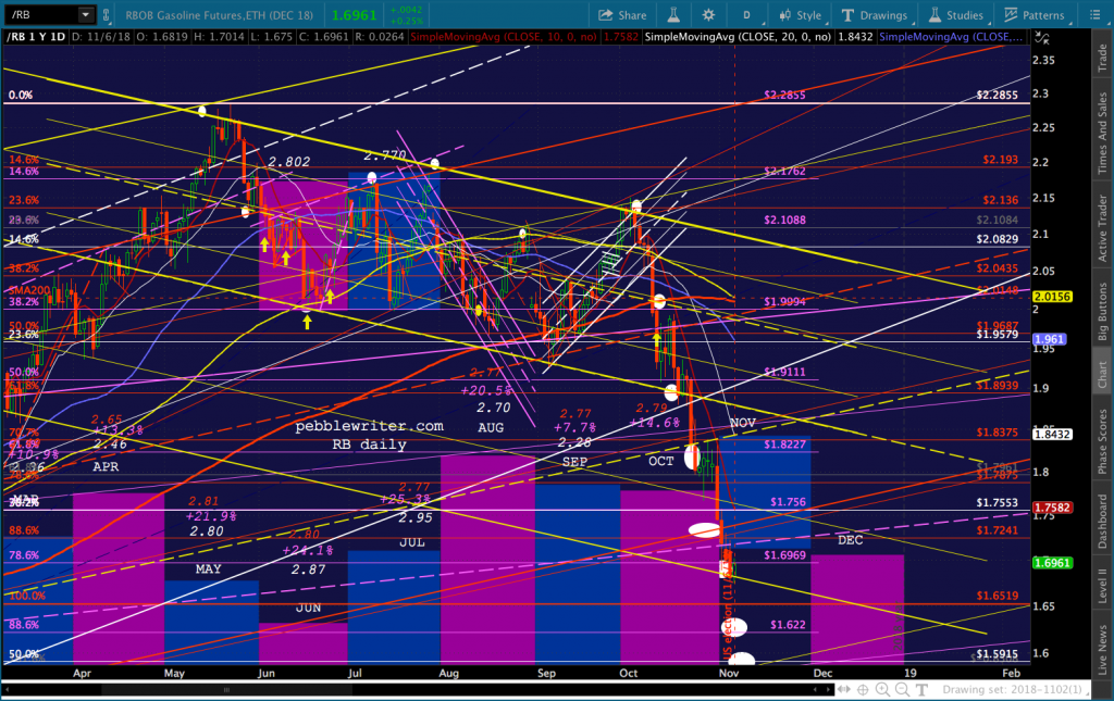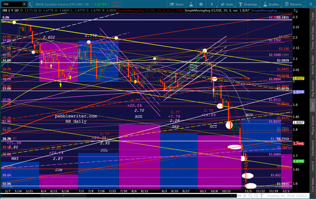 CL and RB had a rough day, with CL covering about half the ground to our 59.47 target before ramping higher into a bearish API report that saw it sell off again. RB pushed slightly lower, hinting at a drop to 1.622 or 1.5915…depending on tomorrow’s EIA inventory report and the general post-election mood.