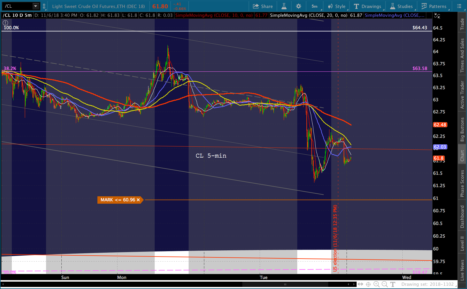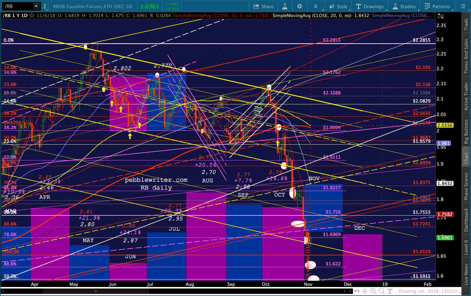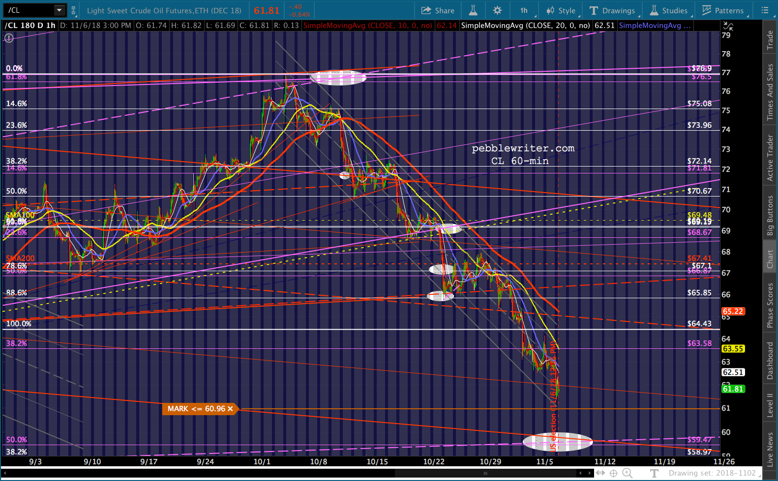 CL and RB had a rough day, with CL covering about half the ground to our 59.47 target before ramping higher into a bearish API report that saw it sell off again. RB pushed slightly lower, hinting at a drop to 1.622 or 1.5915…depending on tomorrow’s EIA inventory report and the general post-election mood.