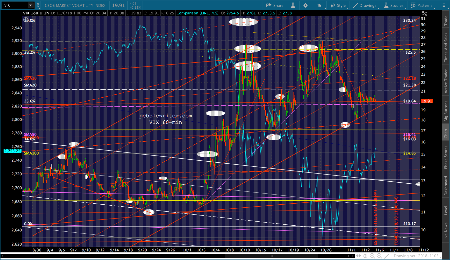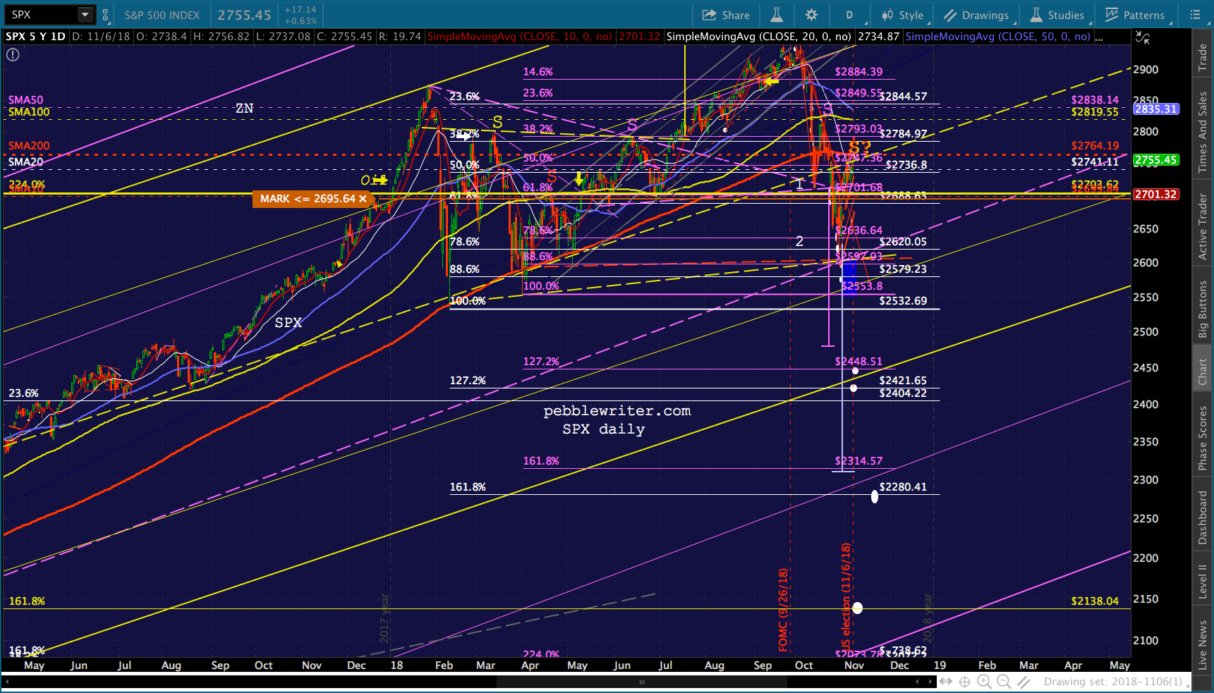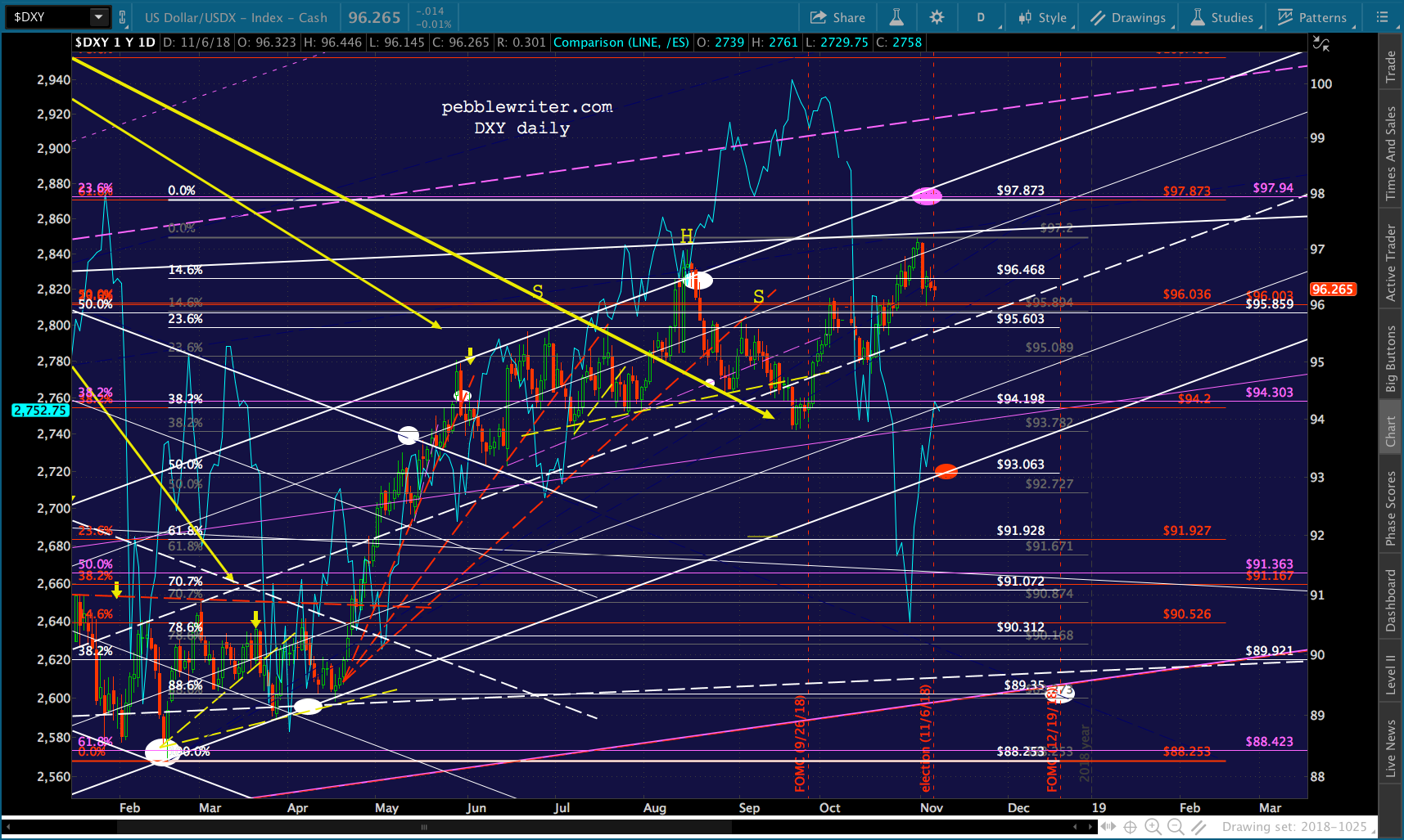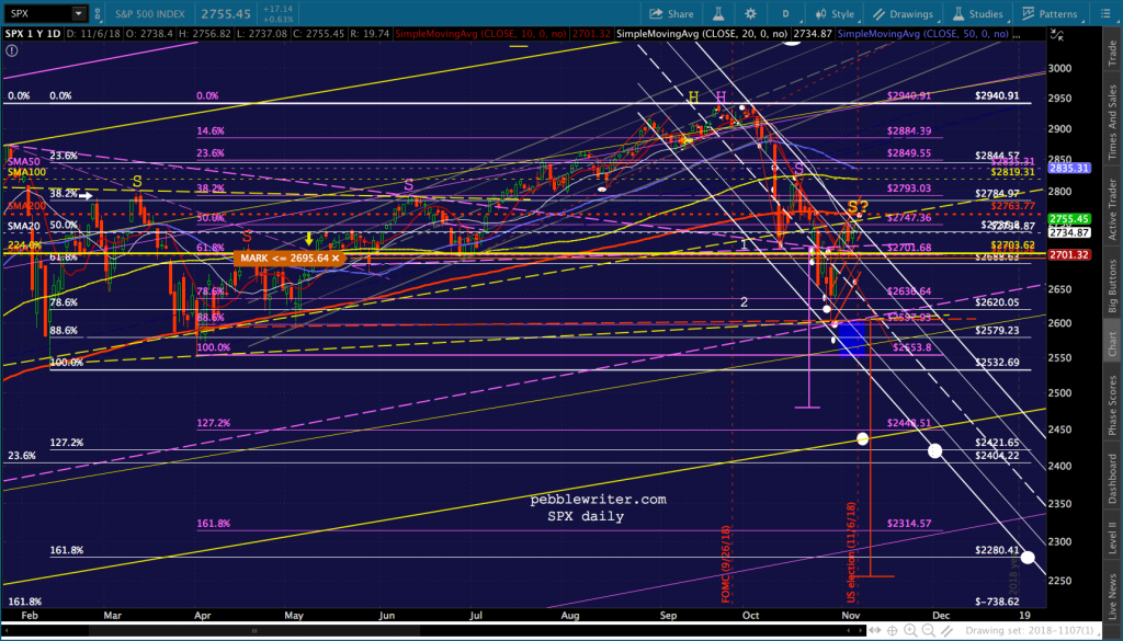 All it took to erase a 4.5% overnight plunge in ES was a severe hammering of VIX and ramp jobs in USDJPY and CL. I don’t see why tonight would be any different. Though, there’s the possibility that fundamental investors who have bought into the Trump Rally concept would freak if Dems were successful enough. If so, SPX could drop 52 points to its 2.24 or even 158 points (5.7%) to its .886 before doing any serious damage.