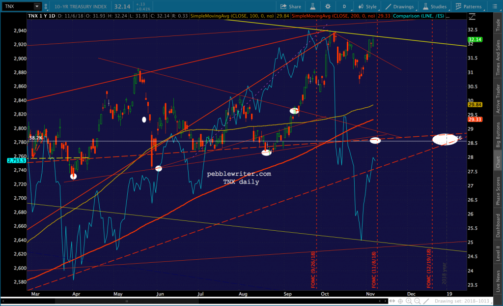 On the bearish side of the aisle: inflation should be much lower in Oct as a result of oil and gas declines; interest rates are still pushing against important resistance; VIX experienced a golden cross on Friday; FAANGs are providing bearish leadership; and, many fundamental analysts have pronounced a democratic surge as bearish.