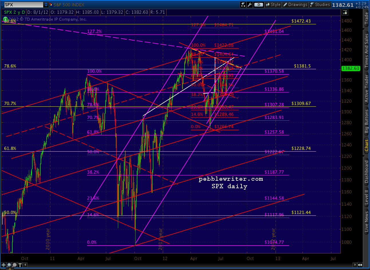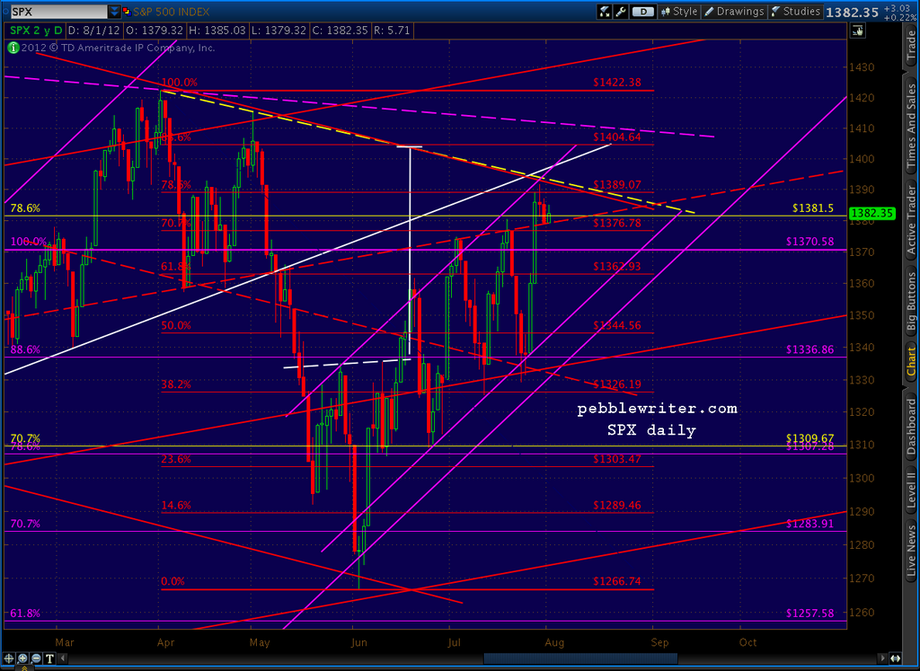 I’m still short at 1387 from July 30, but will likely switch sides if we break convincingly out of the channel. The upper bound appears to be about 1382.50 tomorrow morning, but I don’t want to get blown out by market makers running the stops. I’ll watch this level carefully and evaluate my short position if/when the time comes.